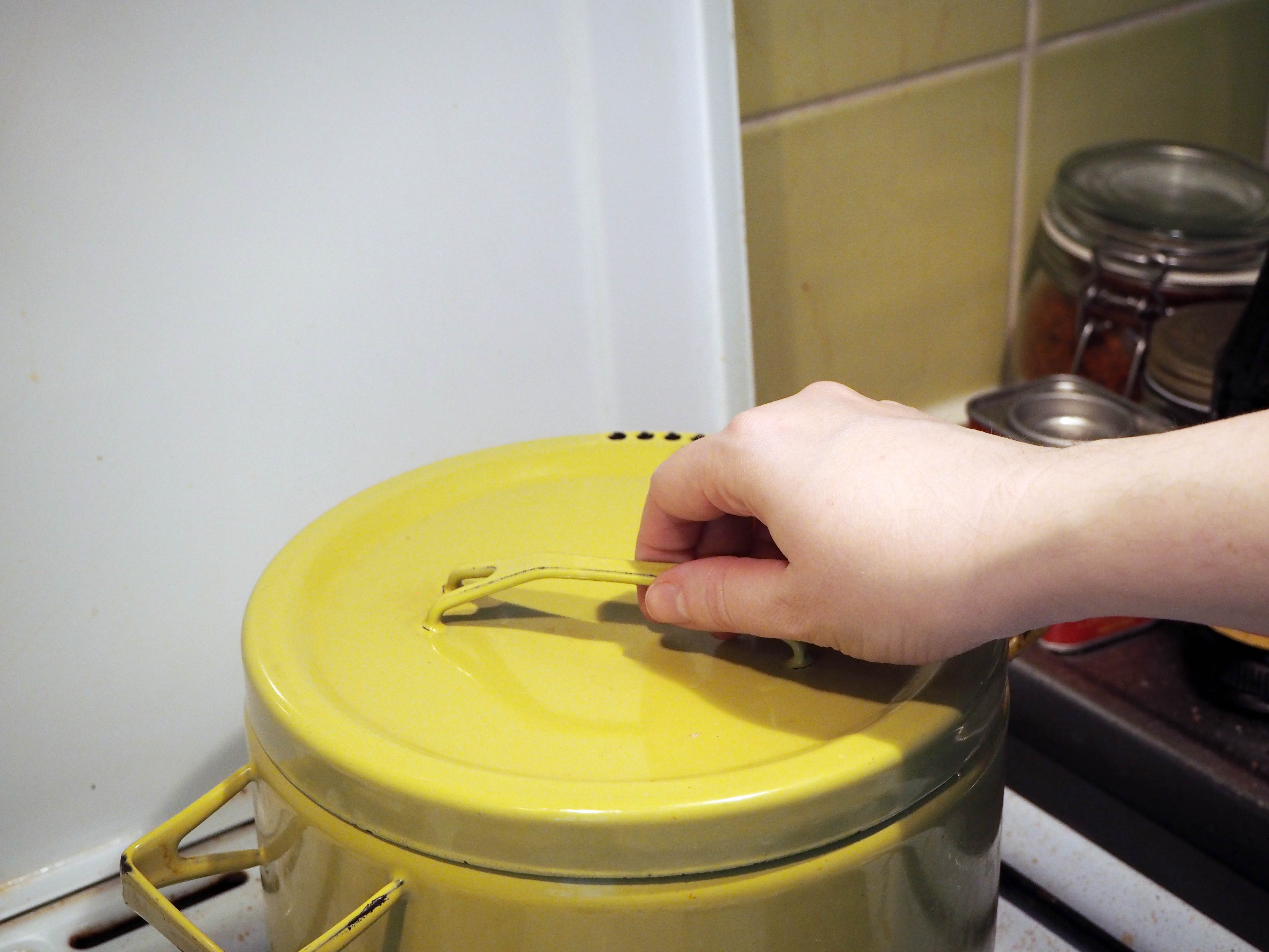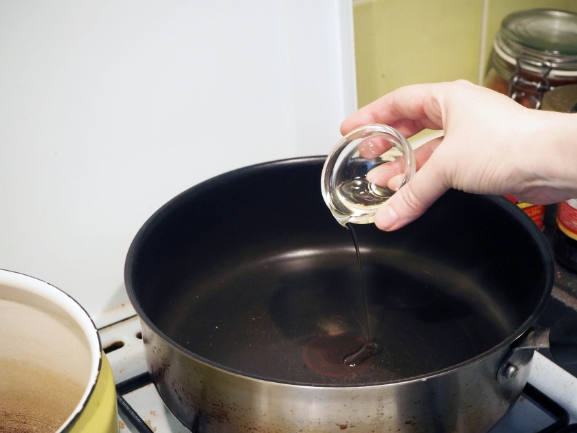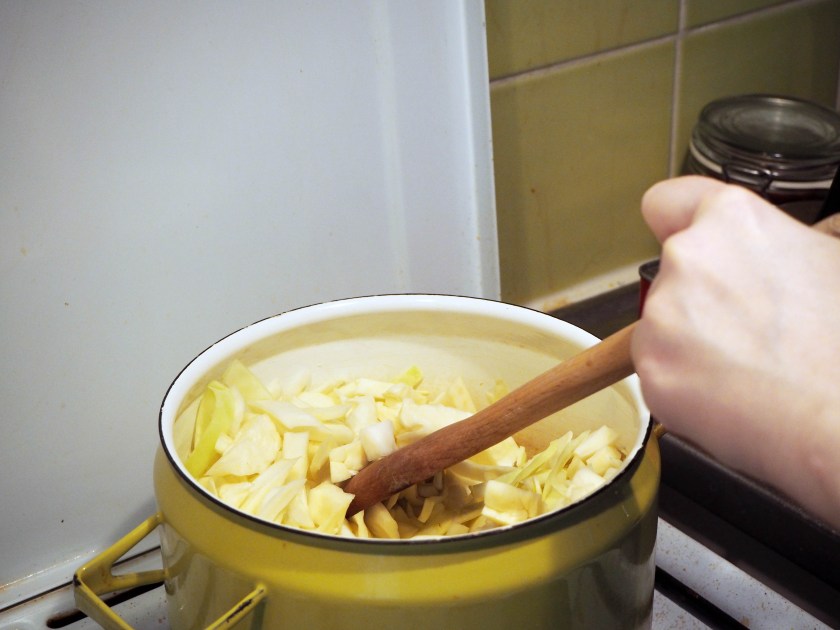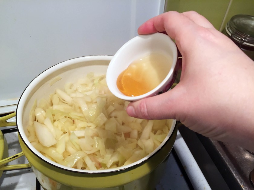 5. In a medium pot, put 1 tbsp olive oil and warm it on medium heat for half a minute. Add cabbage and stir a little. Close the lid of the pot and cook the cabbage just until it gets soft, for about 5-8 minutes. I added about 1 dl. warm water so that the cabbage does not stick to the bottom of the pan and burn. Stir cabbage frequently to prevent from burning. When it gets soft, add syrup, stir a little more and take away from the heat.