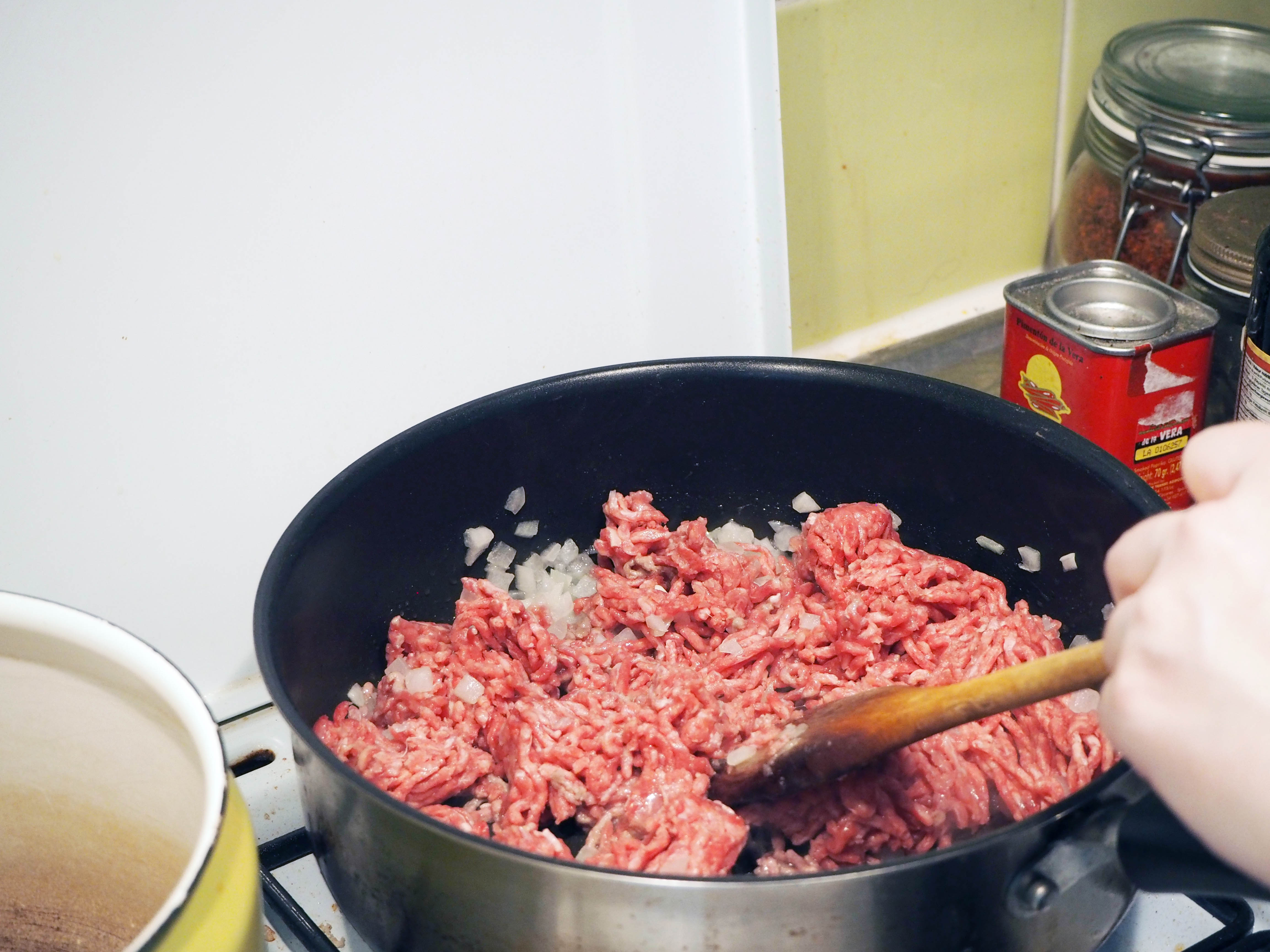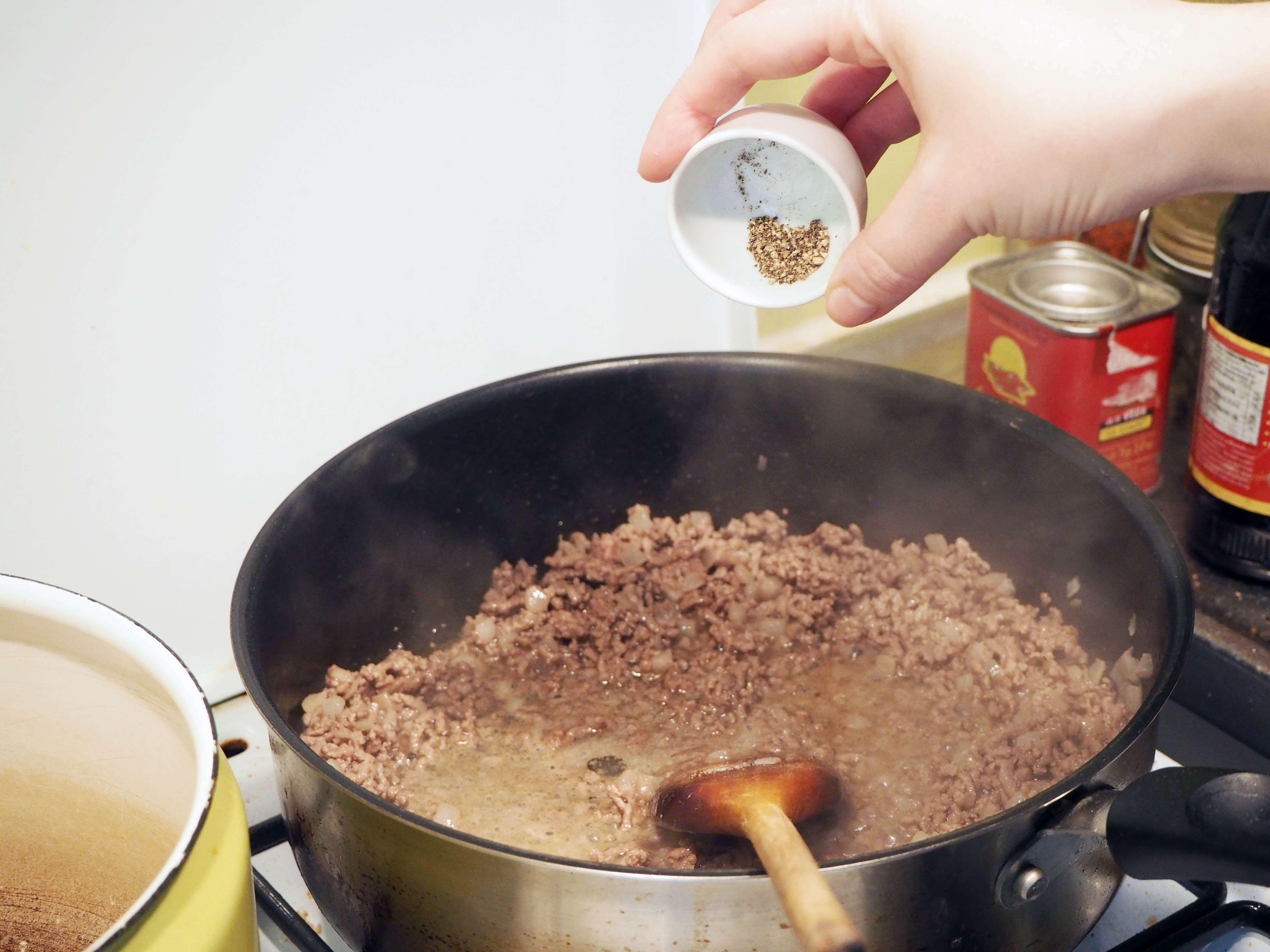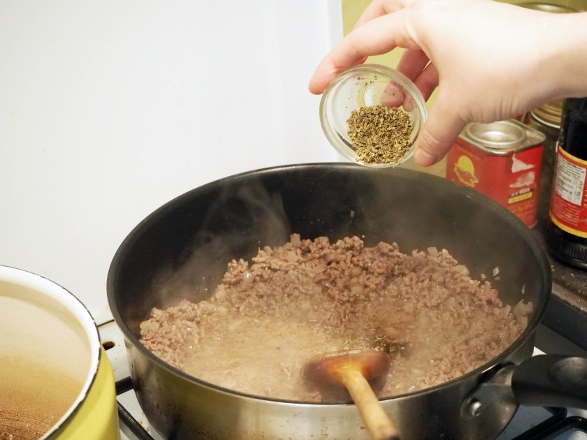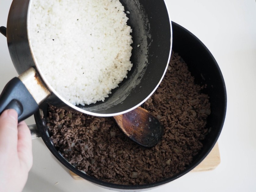 4. In a medium pan, put a splash of olive oil and warm it on medium high heat for about a minute. Add onion and sauté for half a minute. Add ground meat and cook stirring. When the meat colour changes to “cooked brown”, add 1 tsp salt, 1/4 tsp black pepper and 1 tsp marjoram. Give it a final mix and take away from the heat, put aside.