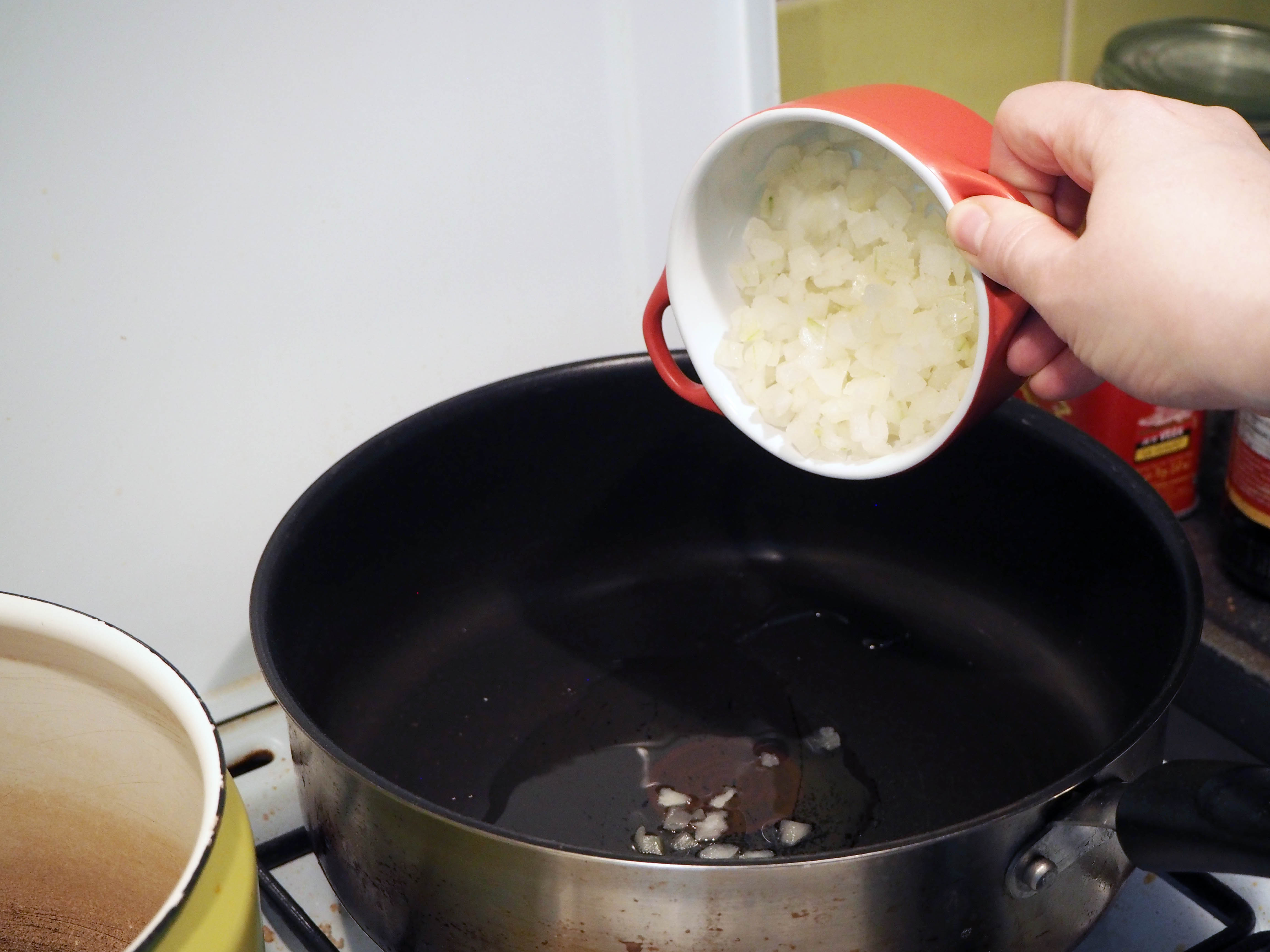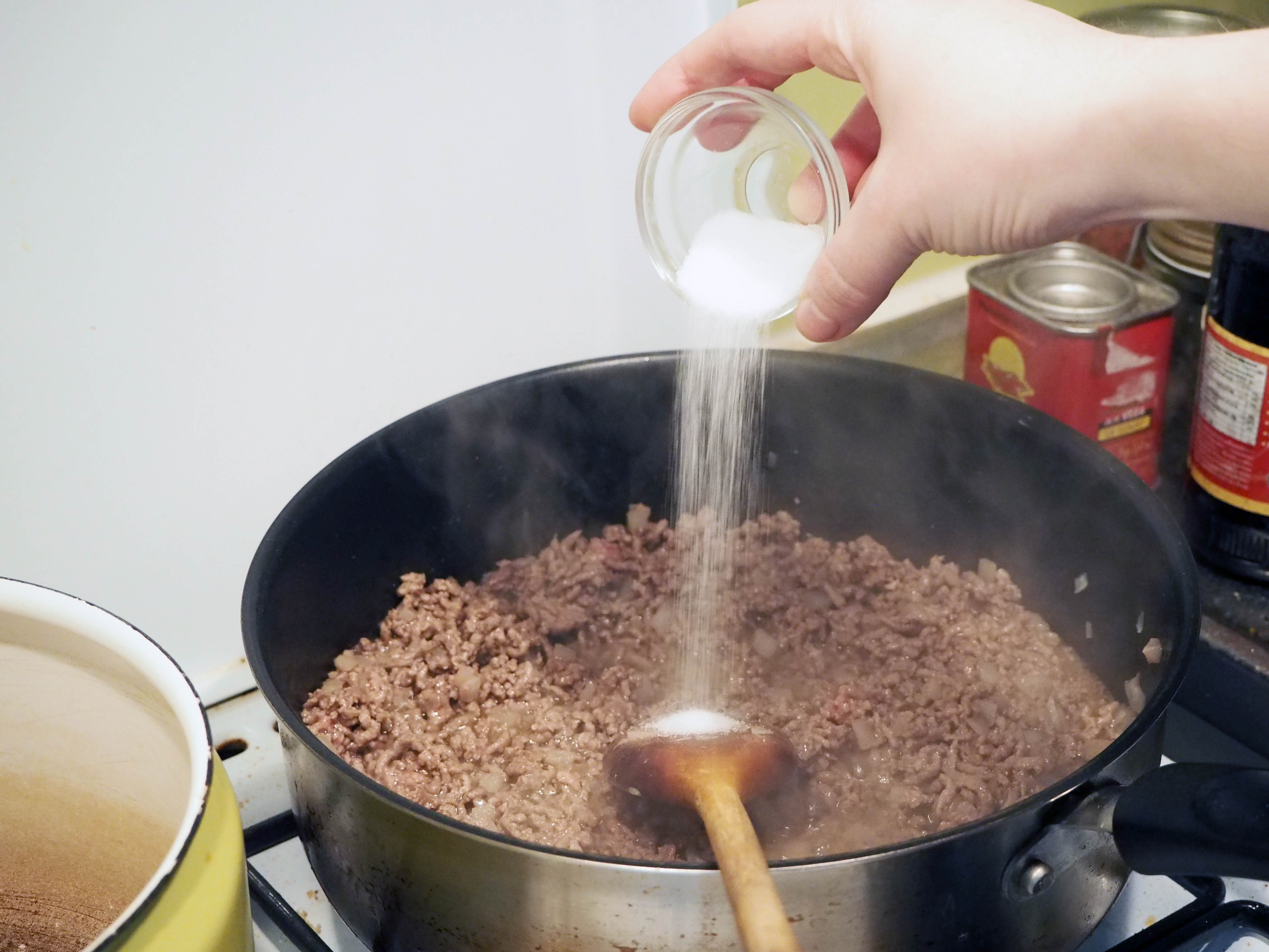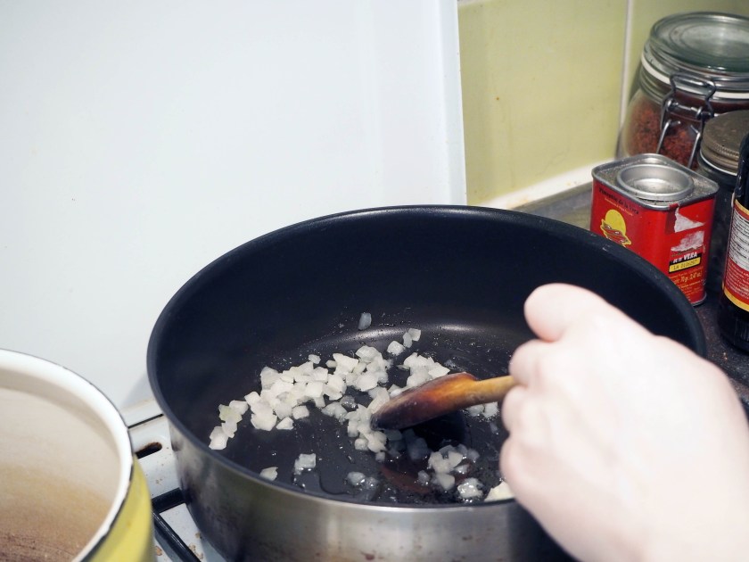 4. In a medium pan, put a splash of olive oil and warm it on medium high heat for about a minute. Add onion and sauté for half a minute. Add ground meat and cook stirring. When the meat colour changes to “cooked brown”, add 1 tsp salt, 1/4 tsp black pepper and 1 tsp marjoram. Give it a final mix and take away from the heat, put aside.