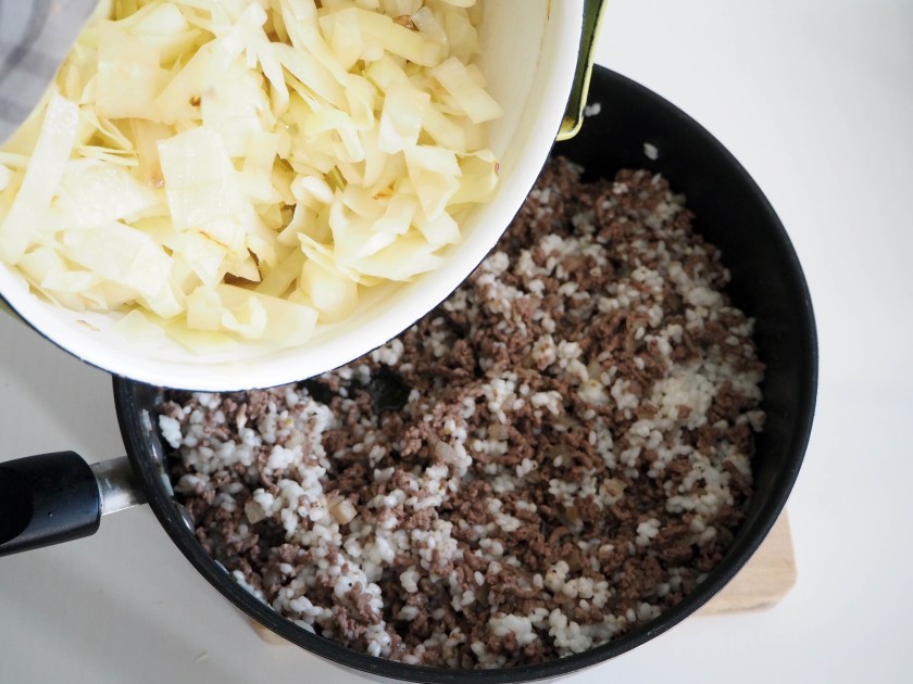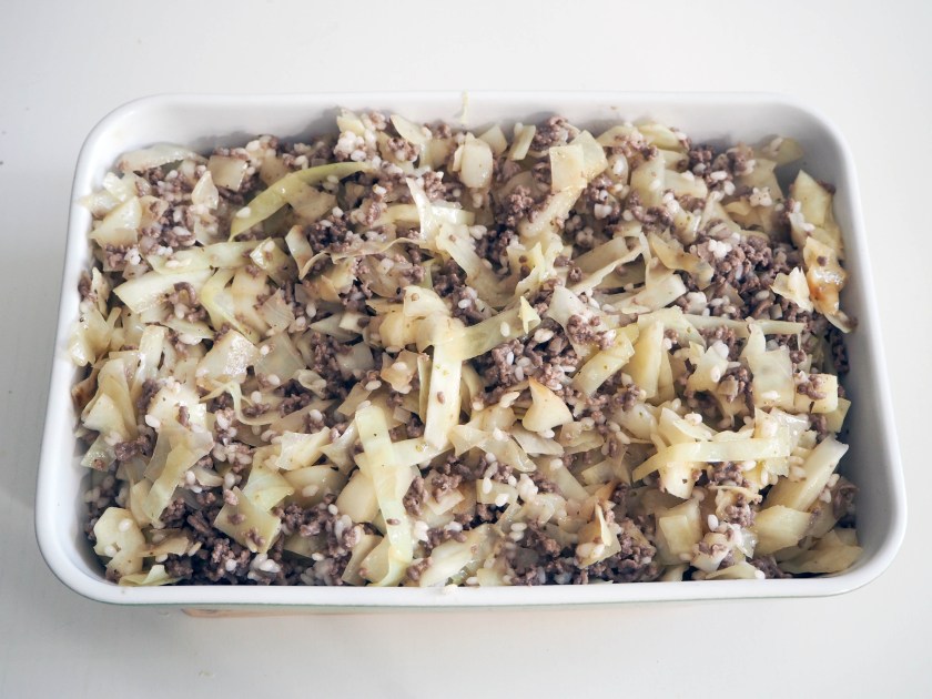 As someone who normally does not mix meat and vegetables and who in fact does not eat meat much, this might have been a strange choice; not so much the cabbage part but to cook it with meat. However, the dish reminds me a lot of Turkish cabbage dish “Kapuska”. It is cabbage stew cooked in different ways, and sometimes with ground meat. The difference, though, is that this one is baked in the oven after cooking each element slightly and separately.