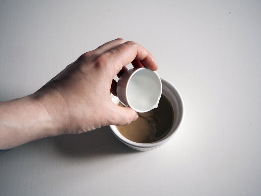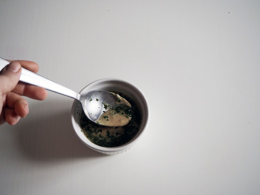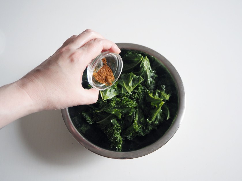2. First prepare the kale chips: in a medium bowl, mix kale, olive oil, cayenne pepper and garlic powder (and a pinch of salt if you like, but I did not need to put at all). Put kale leaves on an oven tray with baking paper on, spread as one layer. Roast in the oven, on top rack, for 15 minutes. Take out of the oven and put aside to cool.
