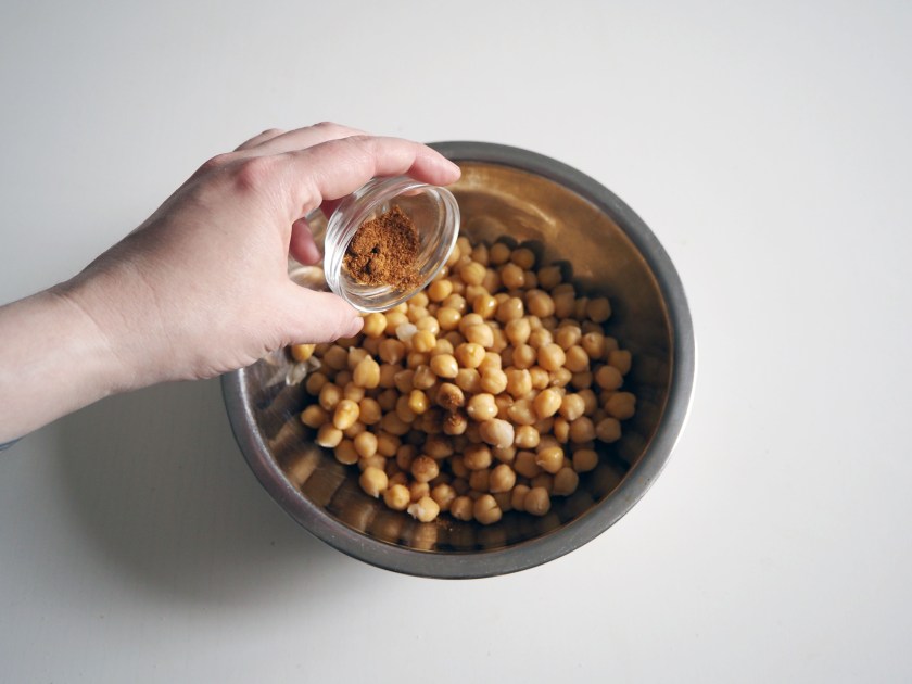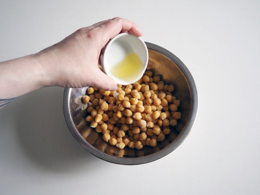 3. Second, prepare chickpeas: in a medium bowl, mix chickpeas, olive oil, cayenne pepper, garlic powder, salt and pepper well. Transfer to an oven tray with baking paper on, spread as one layer. Roast for about 30 to 40 minutes (depending on how crunchy you want them to be).