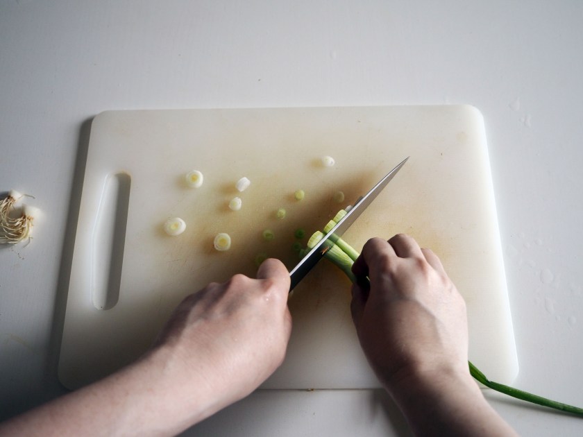 5. Peel carrots and cut in strips. Chop spring onions finely. Deseed the pomegranate.
