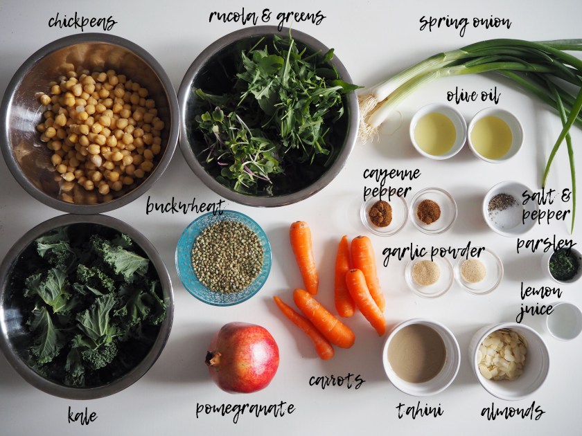 For my own salad bowl, apart from those two new favourites, I used chickpeas I had home – but roasted them as they taste so much better like that! – and added some veggies and greens. I made a mini dip with tahini since it works great with chickpeas and sprinkled some roasted almonds and pomegranate seeds on top. Oh, and I mixed cooked buckwheat with spring onions. Yumm.