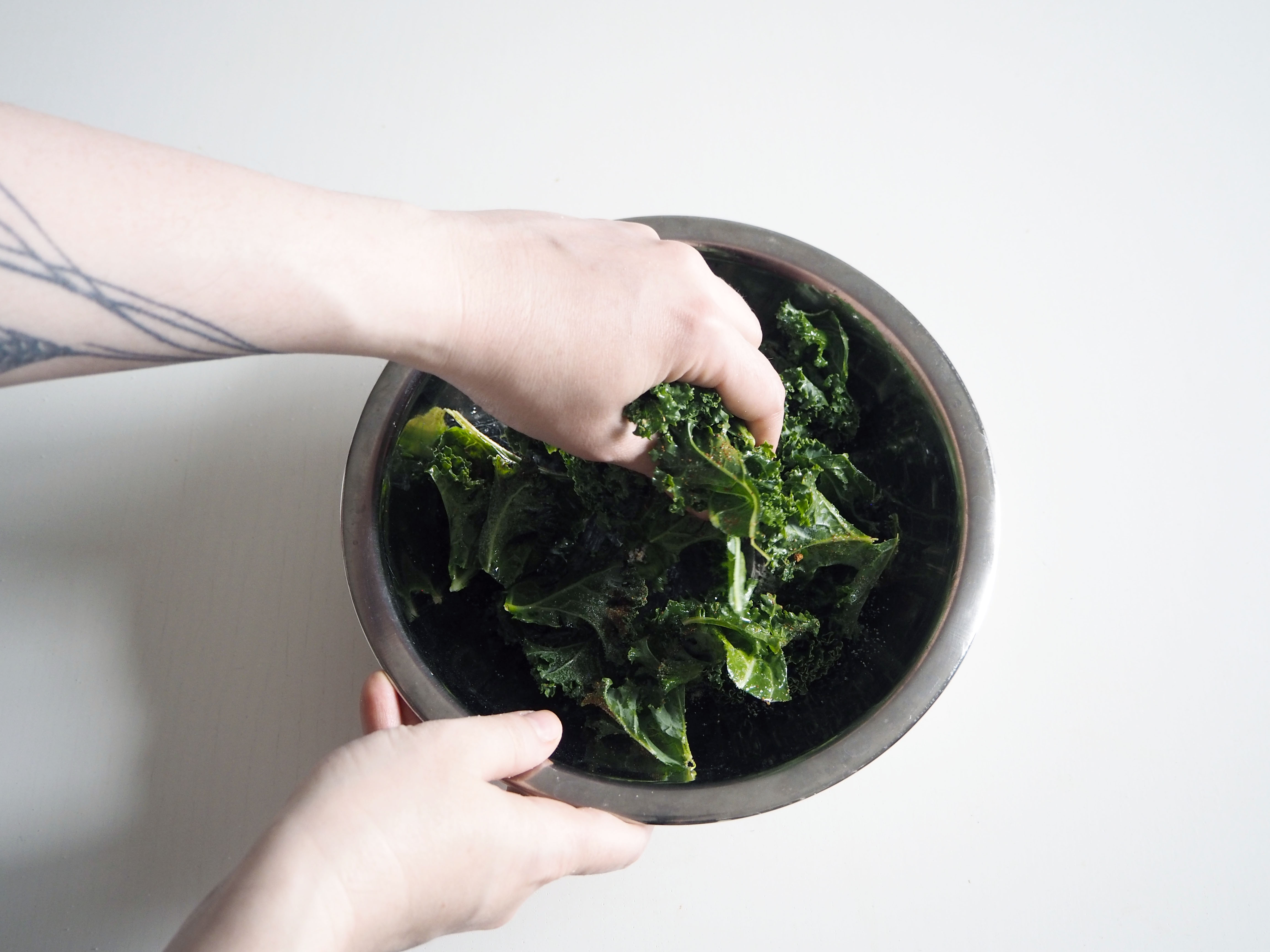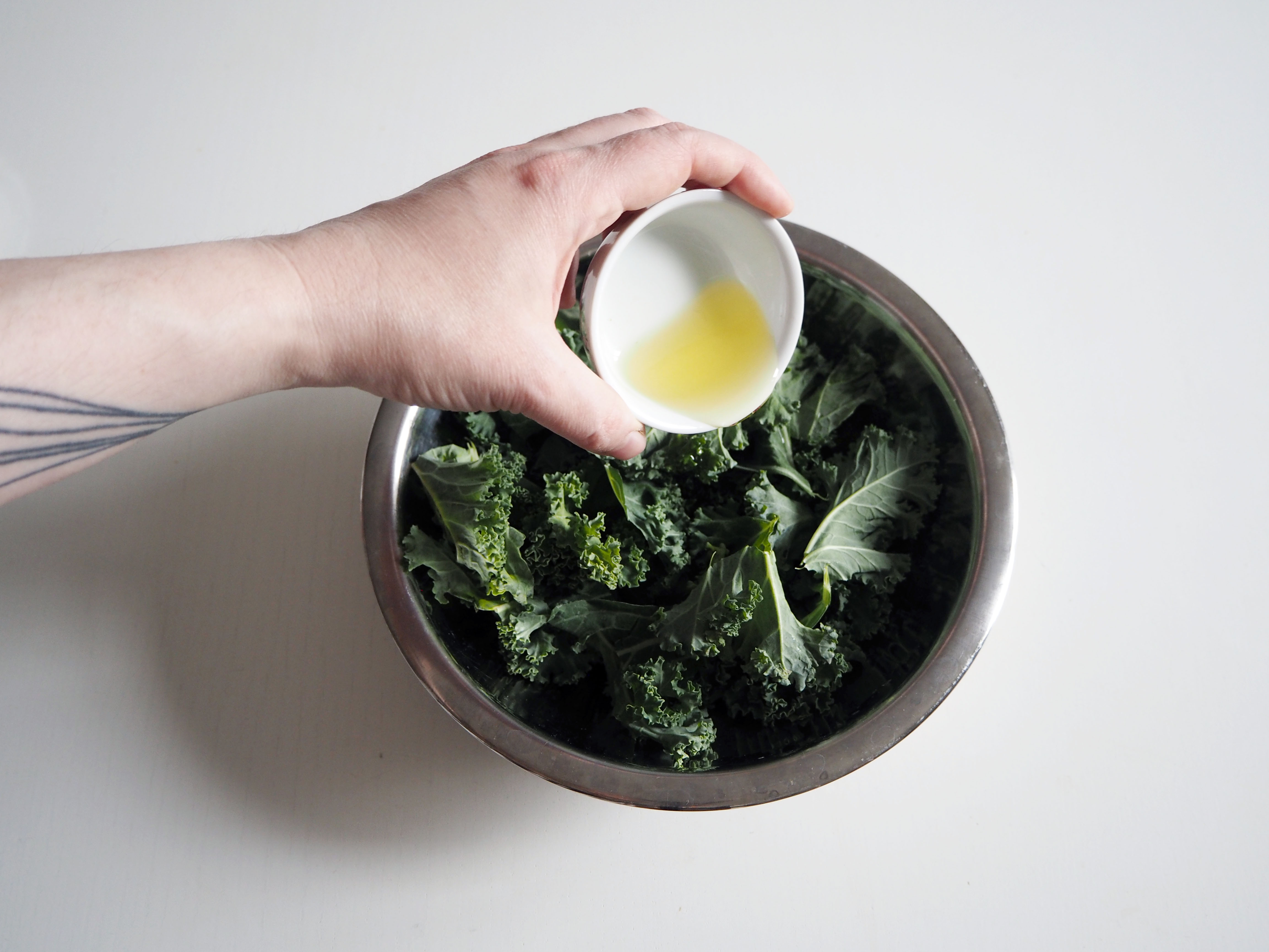 125 gr. kale: tear the leaves, wash well, drain and then dry really well