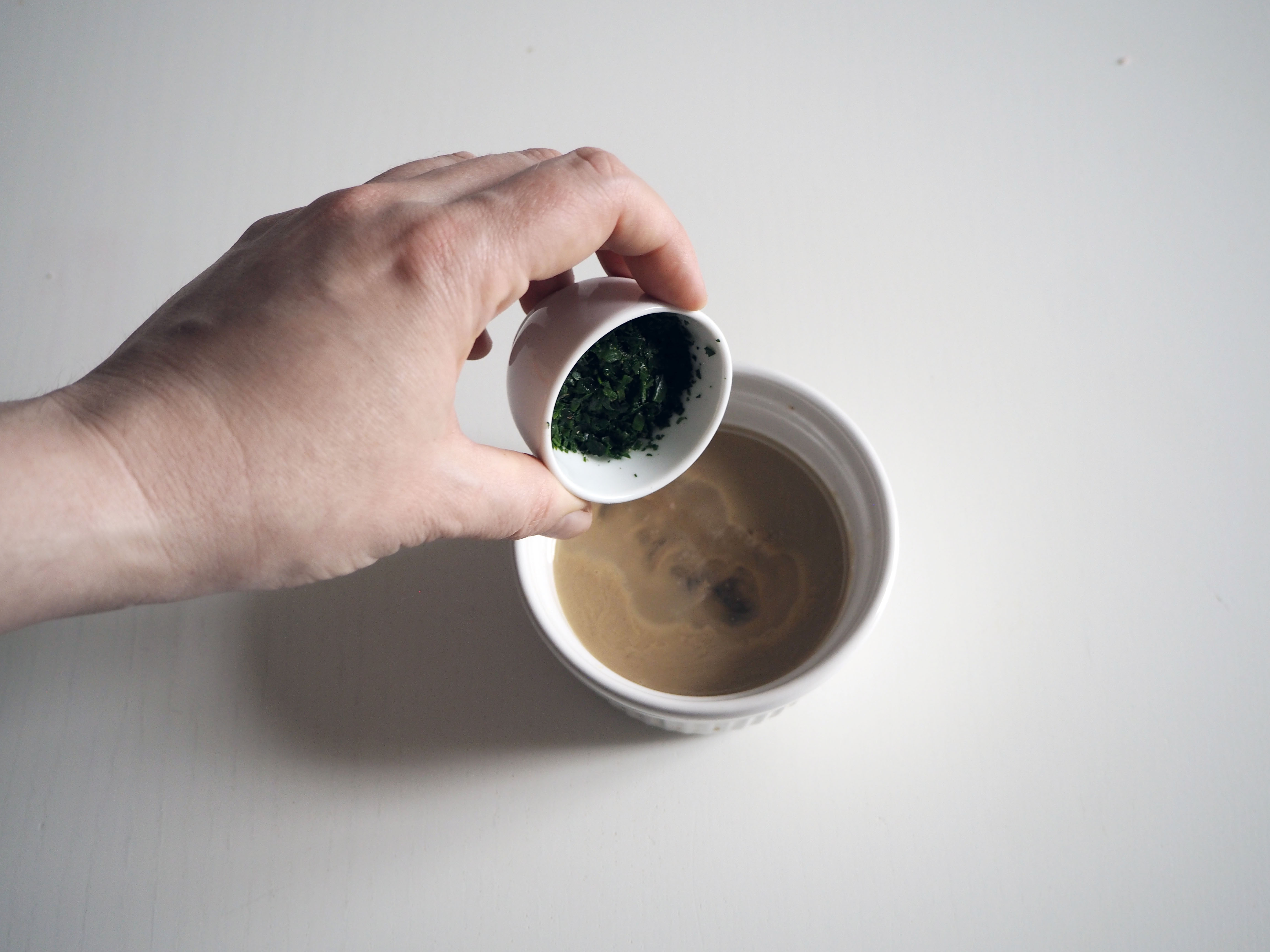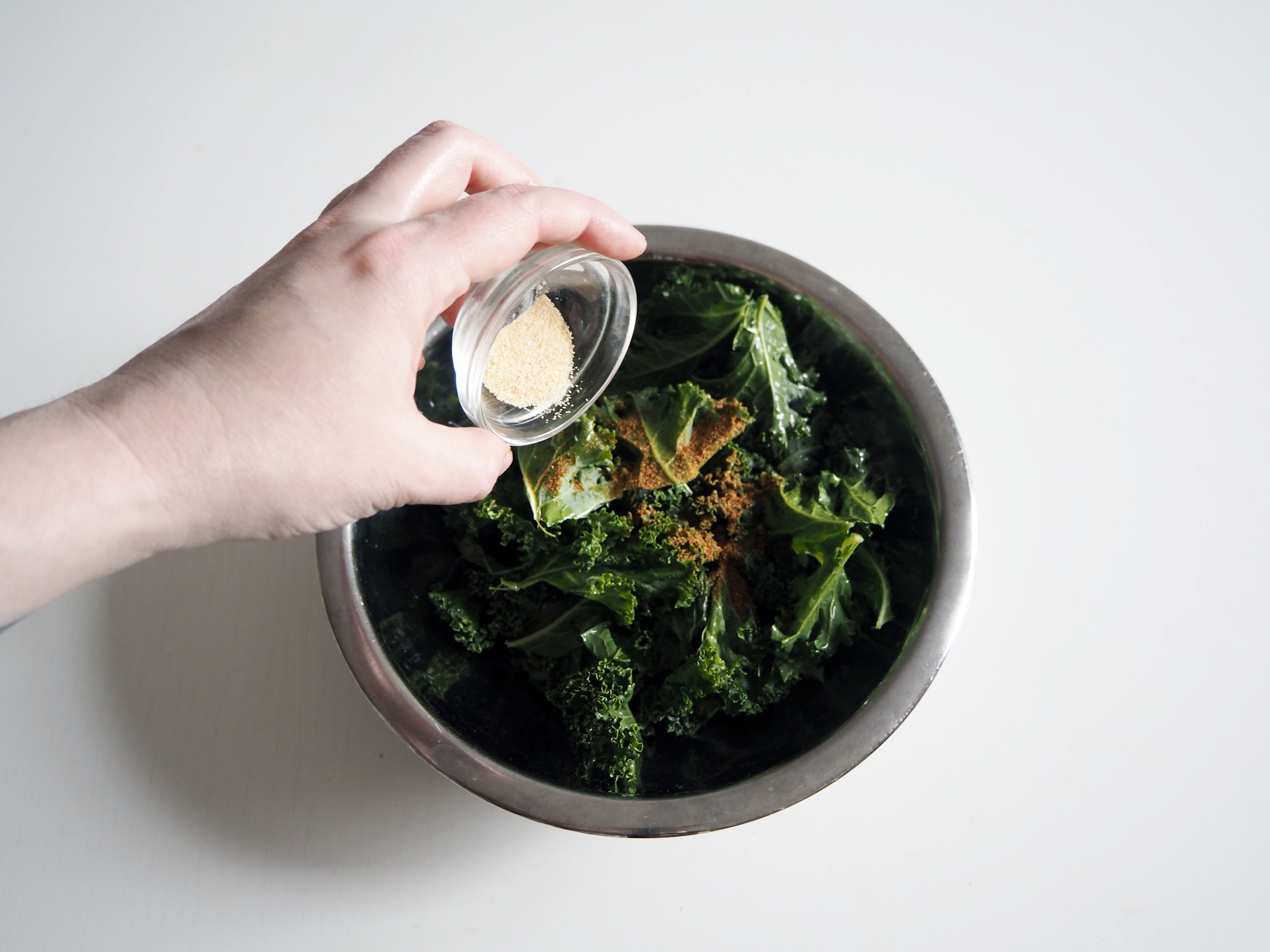 2. First prepare the kale chips: in a medium bowl, mix kale, olive oil, cayenne pepper and garlic powder (and a pinch of salt if you like, but I did not need to put at all). Put kale leaves on an oven tray with baking paper on, spread as one layer. Roast in the oven, on top rack, for 15 minutes. Take out of the oven and put aside to cool.