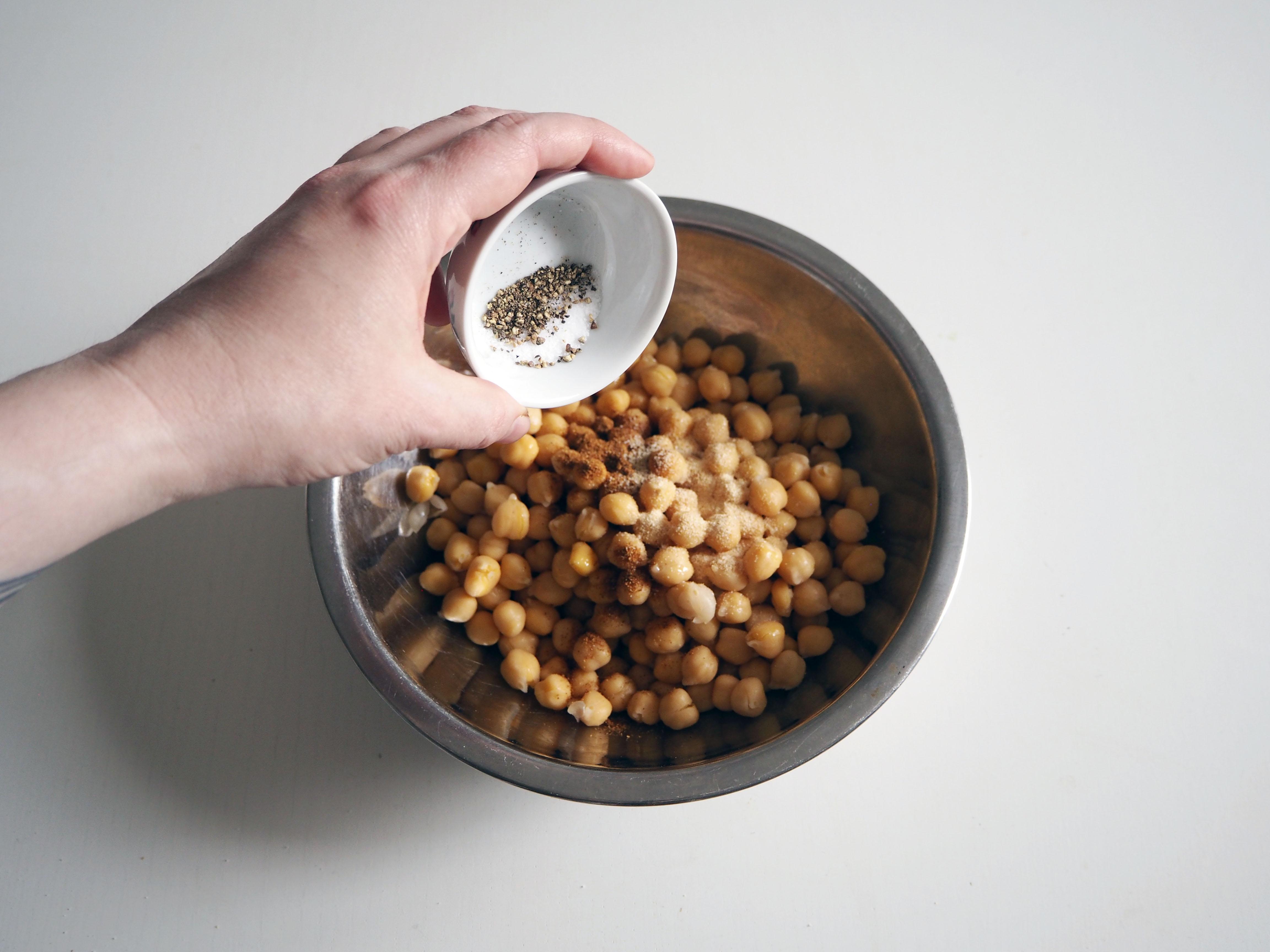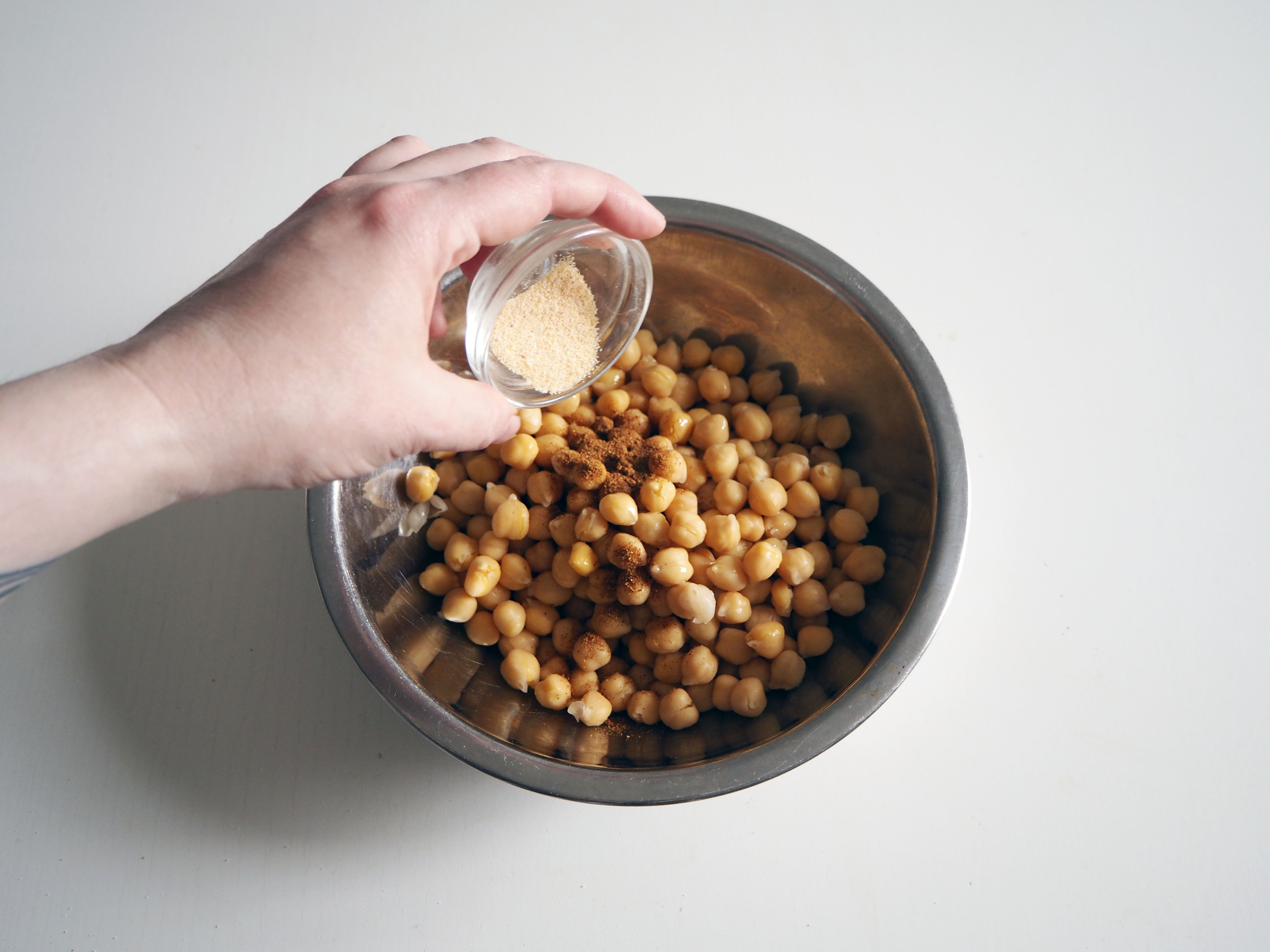 3. Second, prepare chickpeas: in a medium bowl, mix chickpeas, olive oil, cayenne pepper, garlic powder, salt and pepper well. Transfer to an oven tray with baking paper on, spread as one layer. Roast for about 30 to 40 minutes (depending on how crunchy you want them to be).