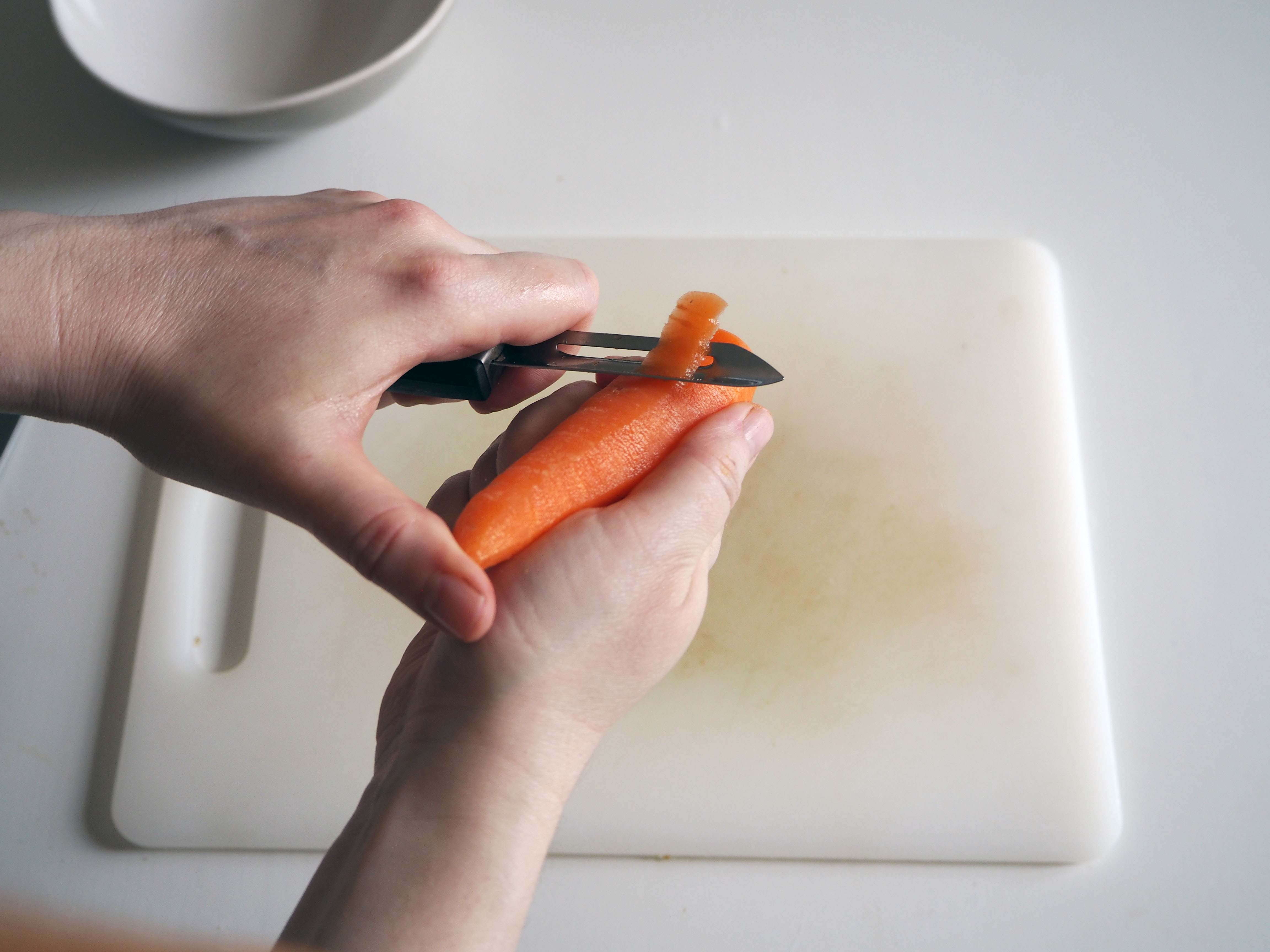 5. Peel carrots and cut in strips. Chop spring onions finely. Deseed the pomegranate.