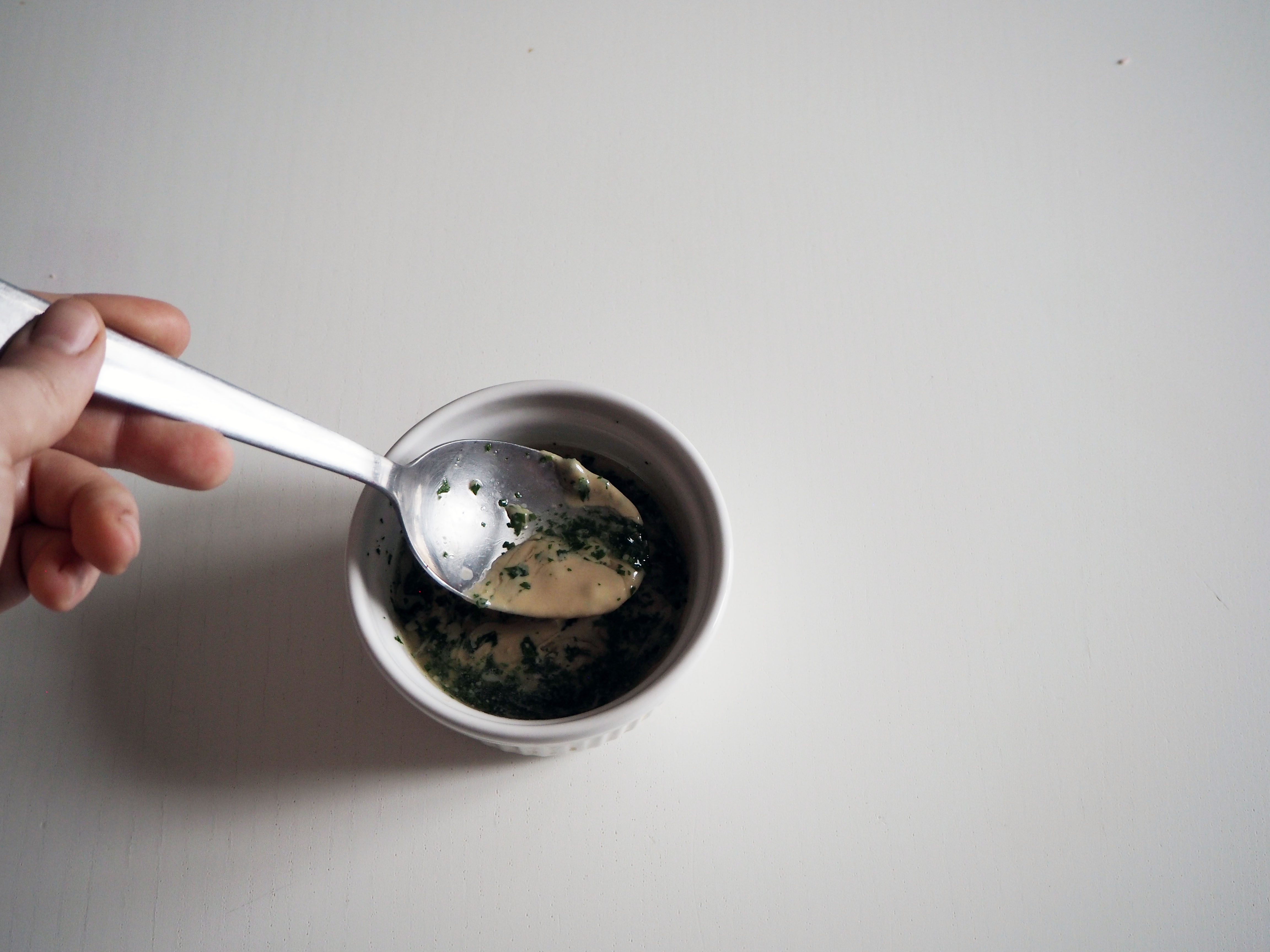 6. Finally, prepare the tahini sauce: add lemon juice and parsley to tahini and mix well. It will get thicken at first but then it will loosen up. Mix cooked buckwheat with spring onions, and then arrange all ingredients in your salad plate as you want. Put some pomegranate seeds and roasted almonds on top. Drizzle with some final olive oil and if you want, add just a little pinch of salt (I did not need to!). Enjoy!