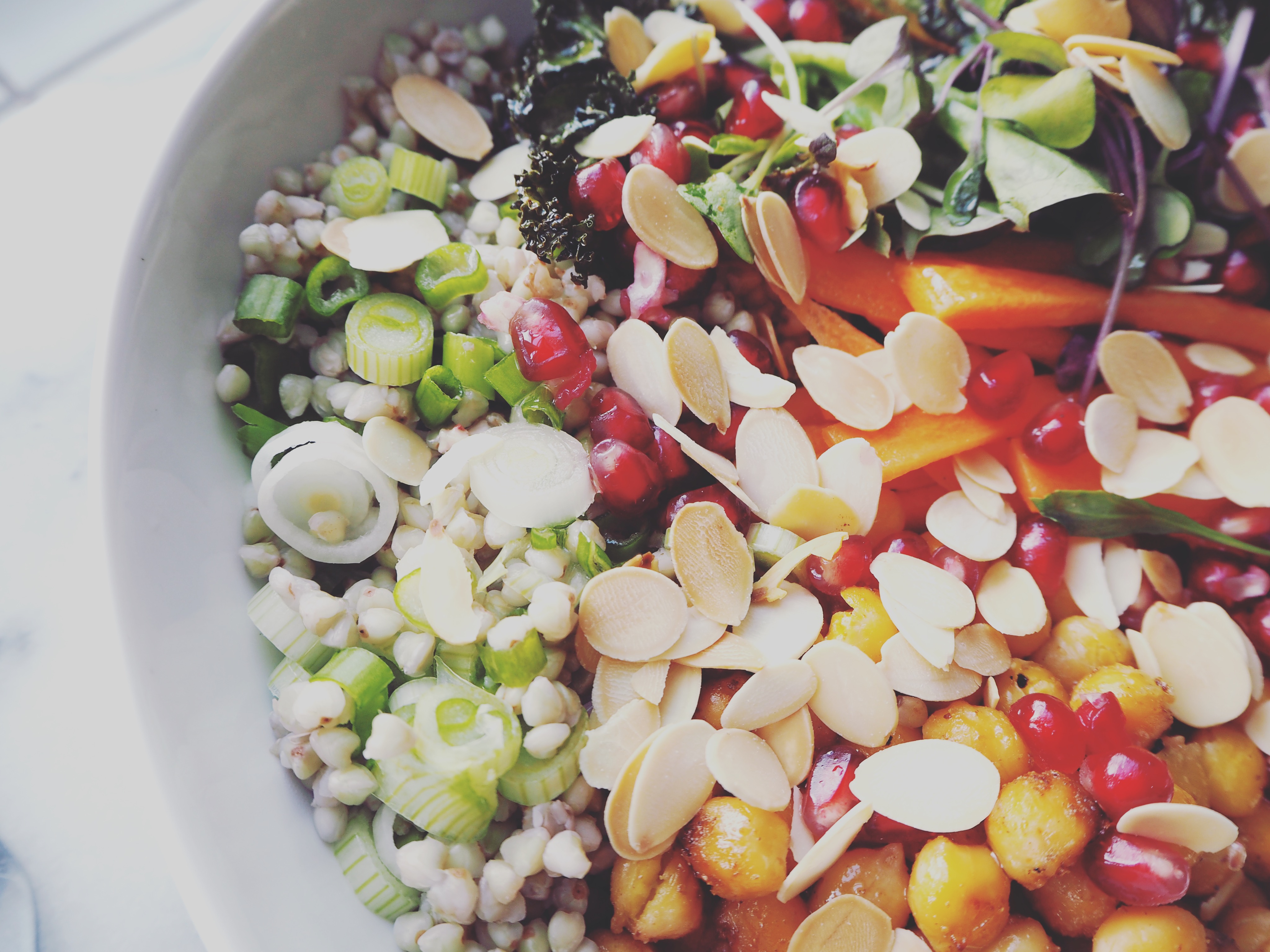 For my own salad bowl, apart from those two new favourites, I used chickpeas I had home – but roasted them as they taste so much better like that! – and added some veggies and greens. I made a mini dip with tahini since it works great with chickpeas and sprinkled some roasted almonds and pomegranate seeds on top. Oh, and I mixed cooked buckwheat with spring onions. Yumm.