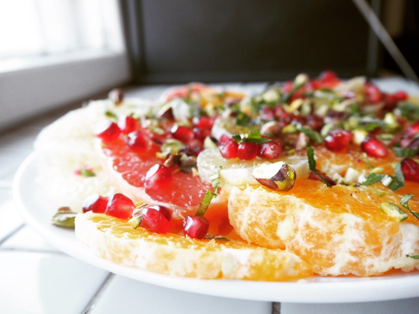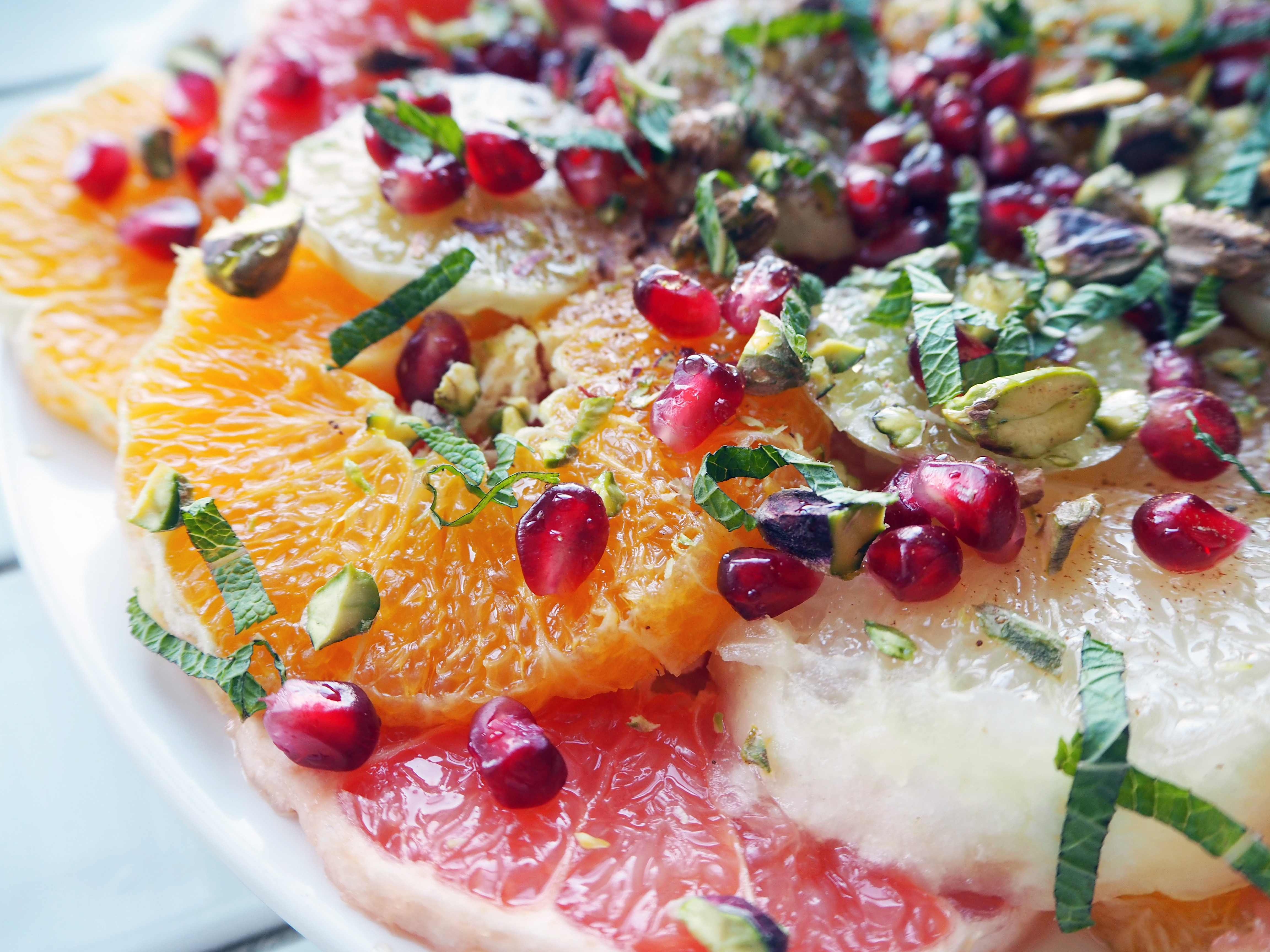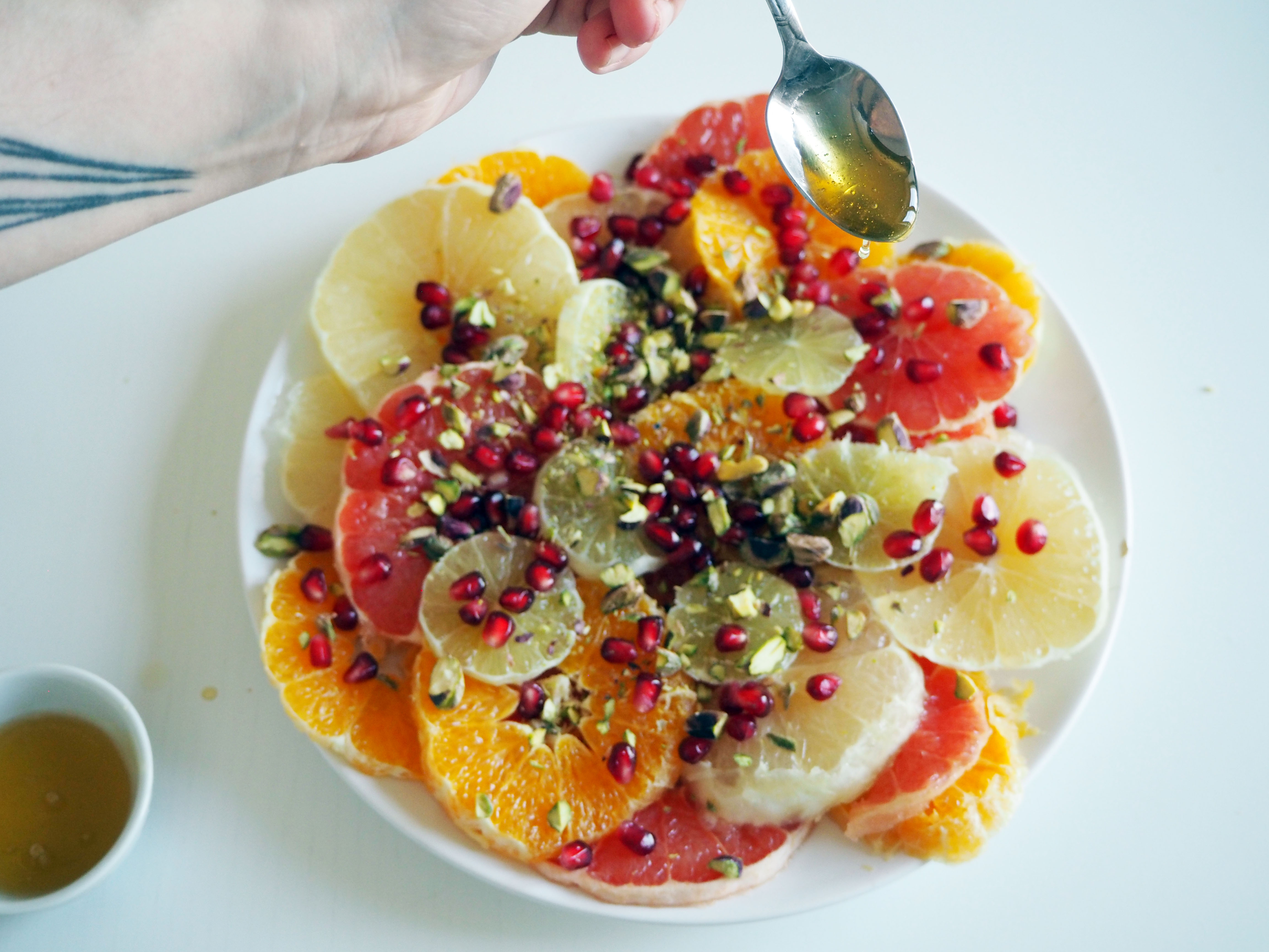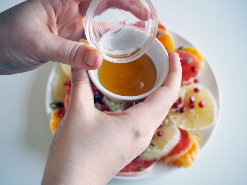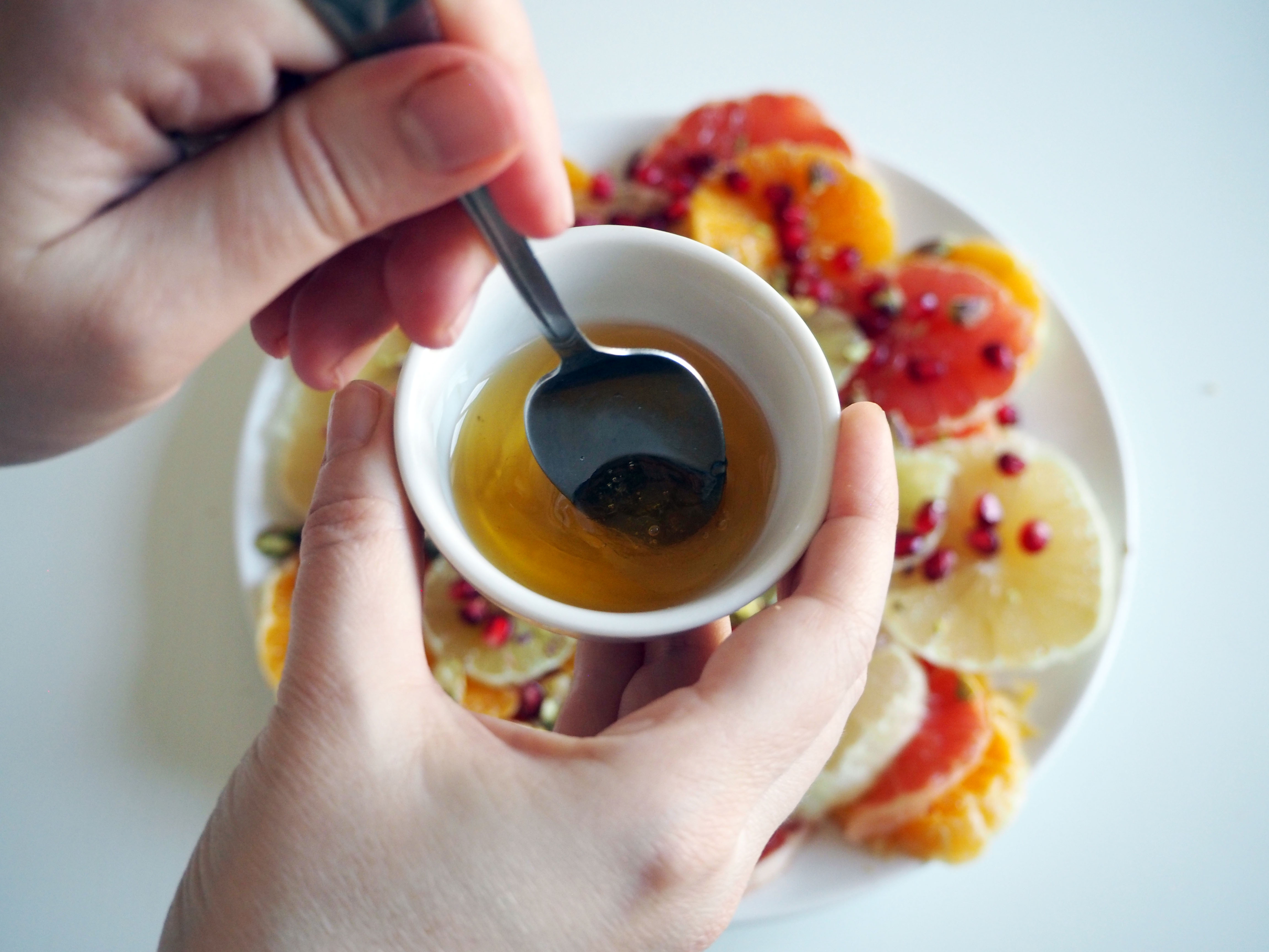 6. Mix honey (or syrup) and orange blossom water and drizzle on top of the salad.