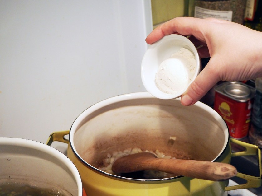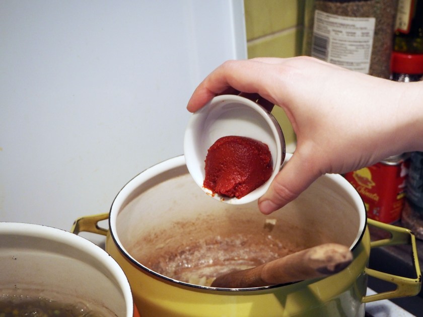 2. Add flour and tomato paste and quickly stir for half a minute so that flour does not suddenly get too thick.