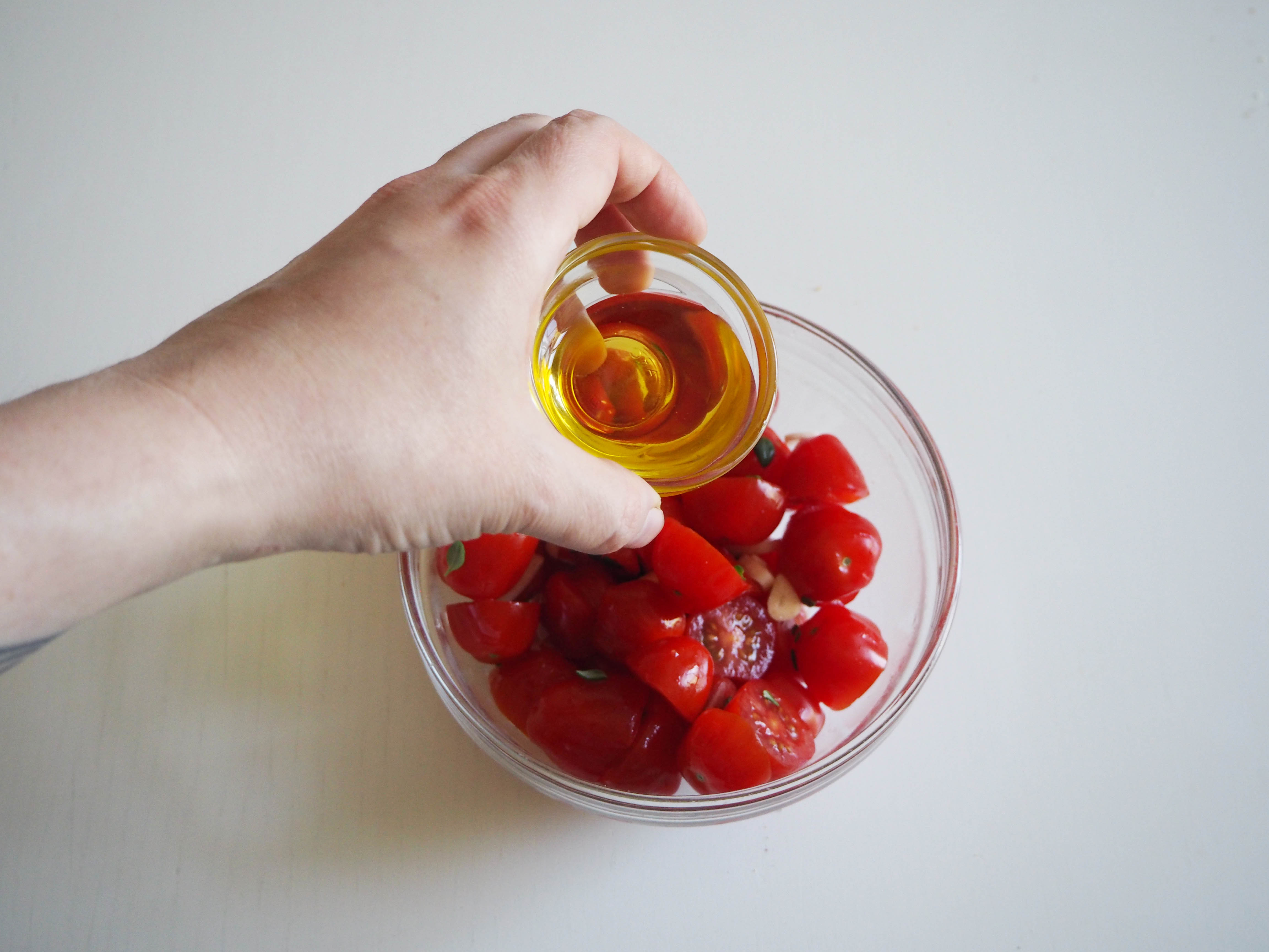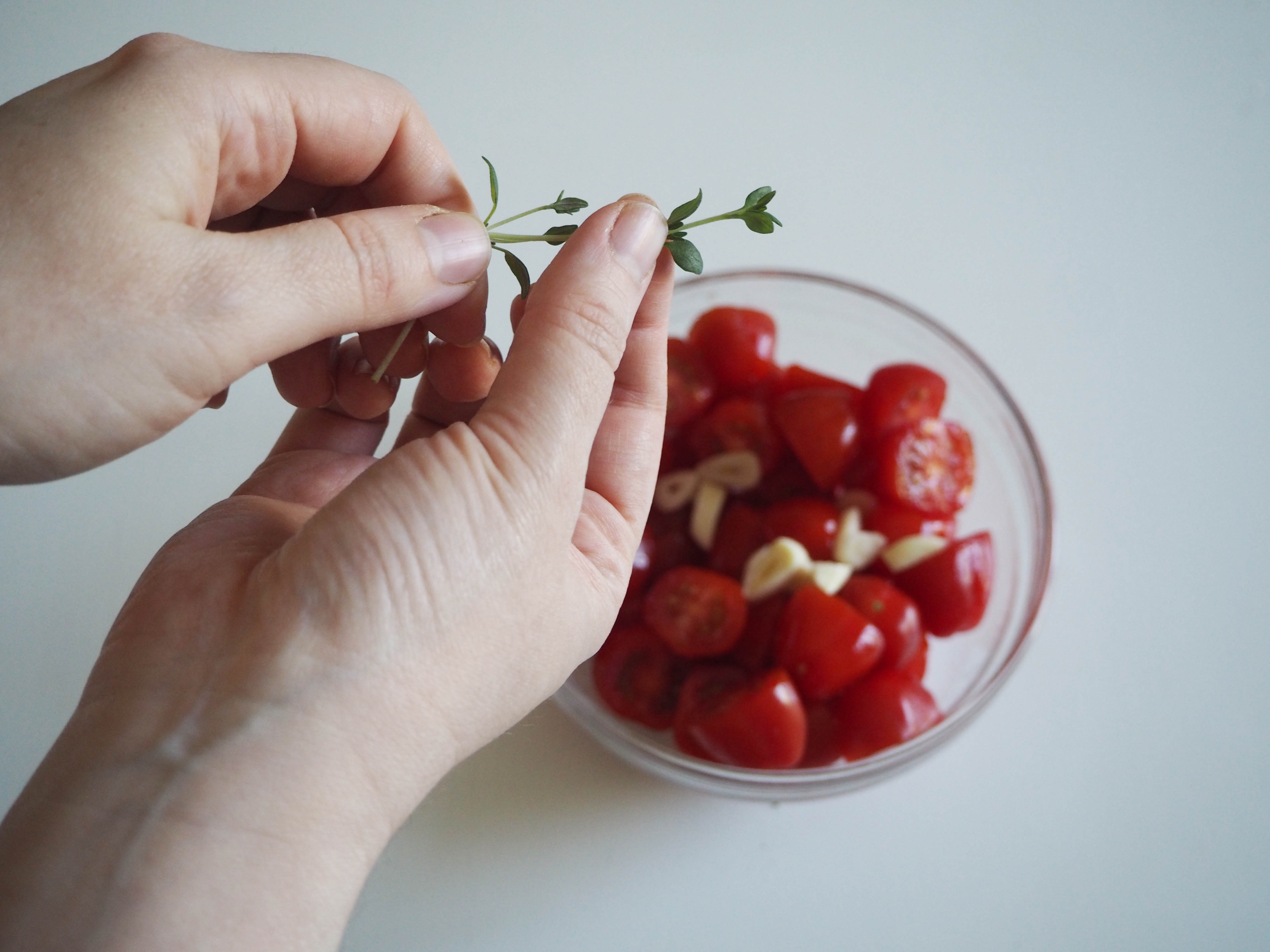 2. In a bowl, mix tomatoes, salt, garlic, thyme (only the leaves) and olive oil.