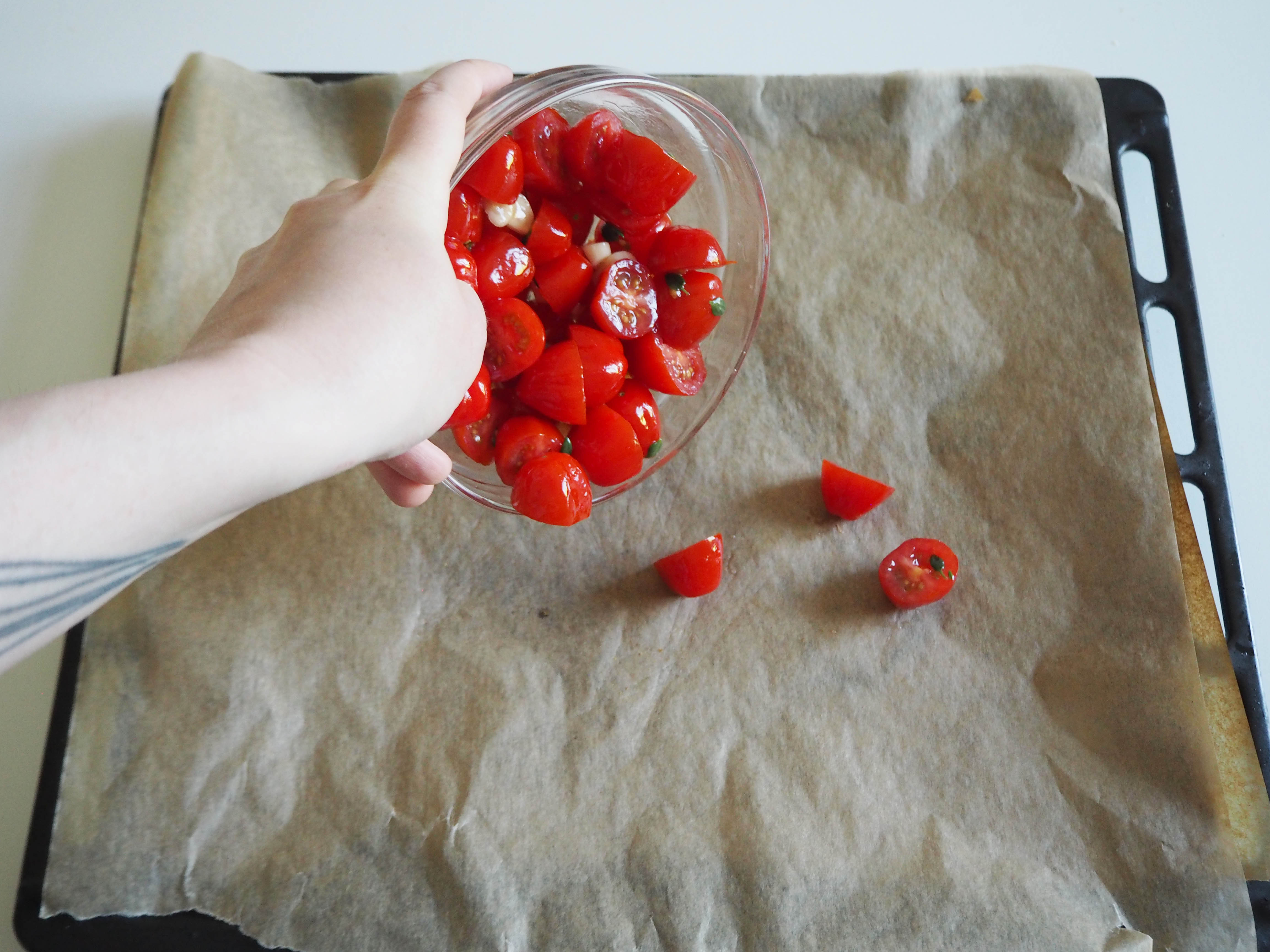 3. Prepare an oven tray with baking paper. Put tomato mixture on the paper, in 1 layer. Any olive oil left in the bowl, pour it over the tomatoes. Put in the oven in medium rack for 20 to 25 minutes, until tomatoes gets soft and juicy. Then take out of the oven and put aside.