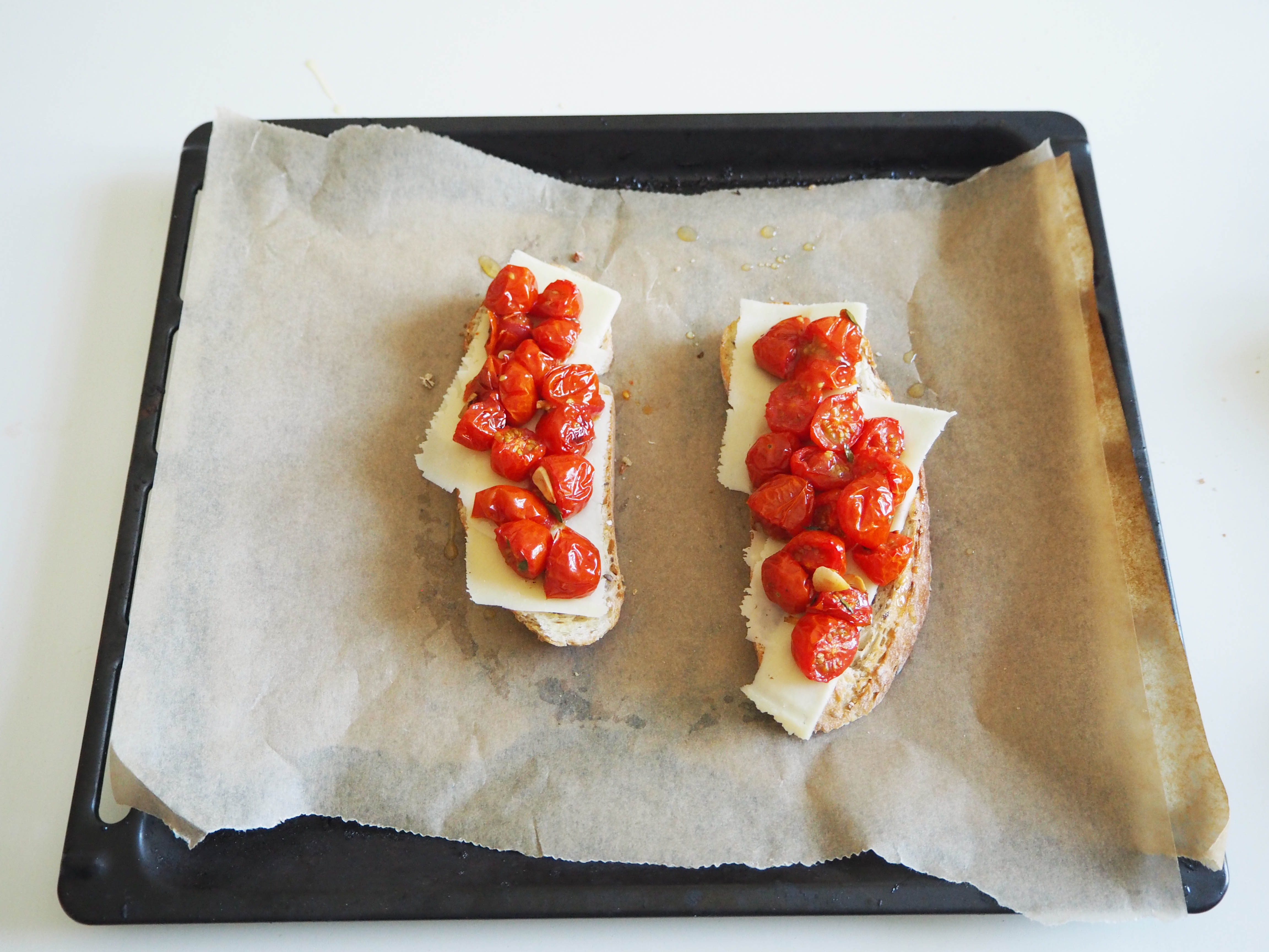4. In another oven tray with baking paper, put bread slices and brush both sides with olive oil. Put cheese slices on top and then add roasted tomatoes. Put it back in the oven, for 5-7 minutes, until cheese melts. Serve with fresh basil leaves. Enjoy!