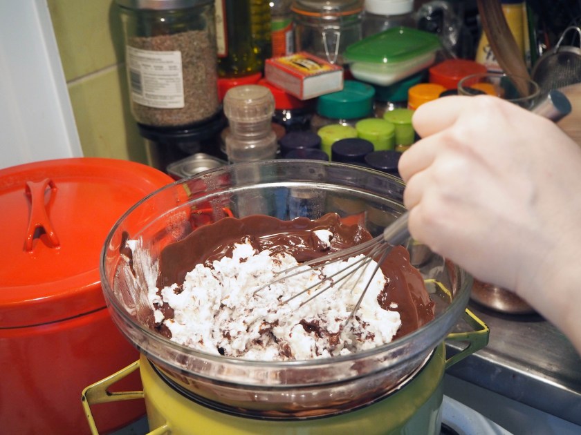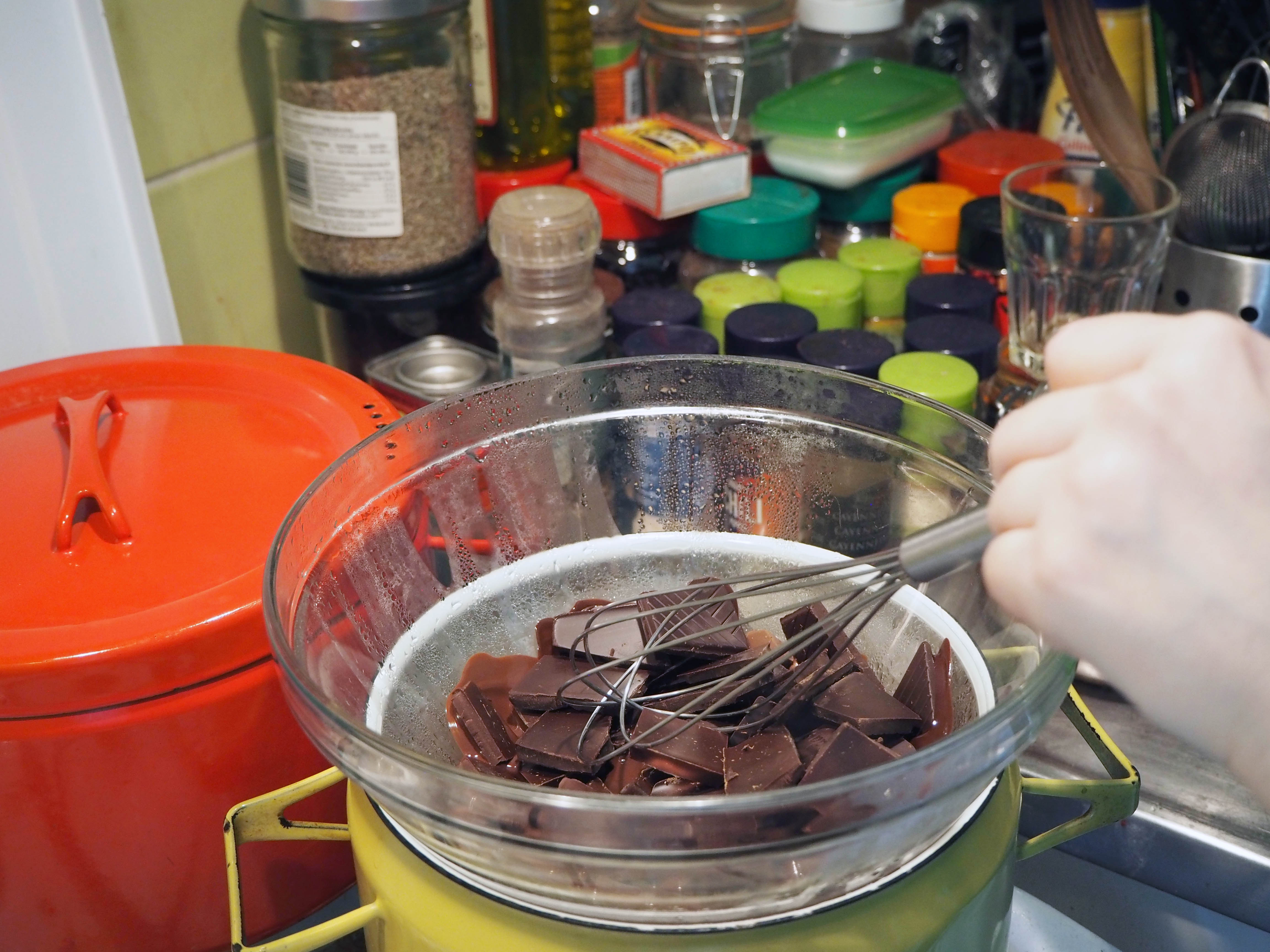 2. In a medium size heatproof bowl, melt chocolate in bain-marie style: put some water in a pot, boil it and lower to a gentle simmer; then put the heatproof bowl with chocolate on top of that pot and melt the chocolate.
