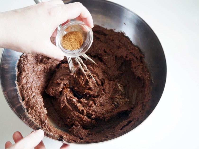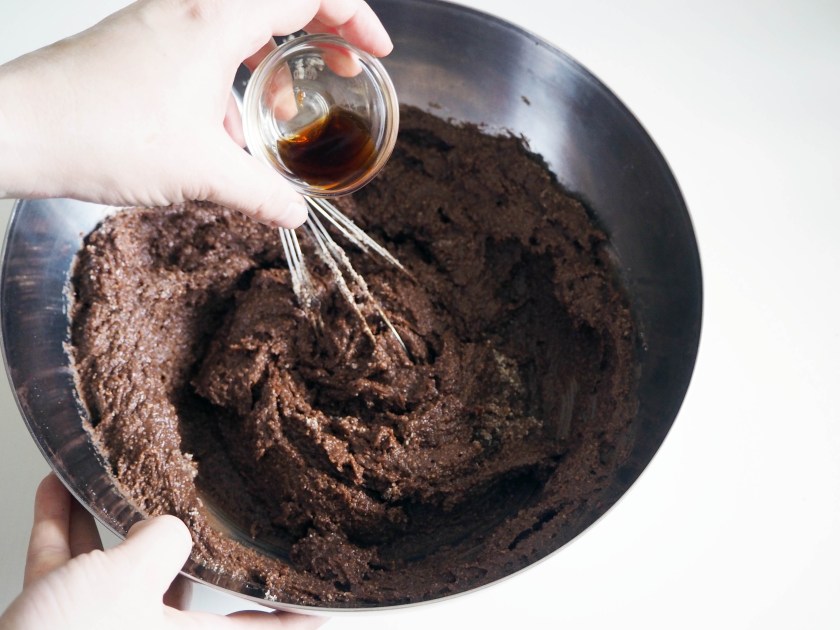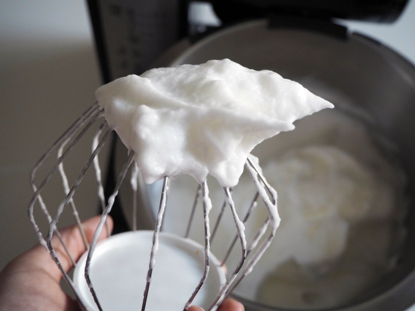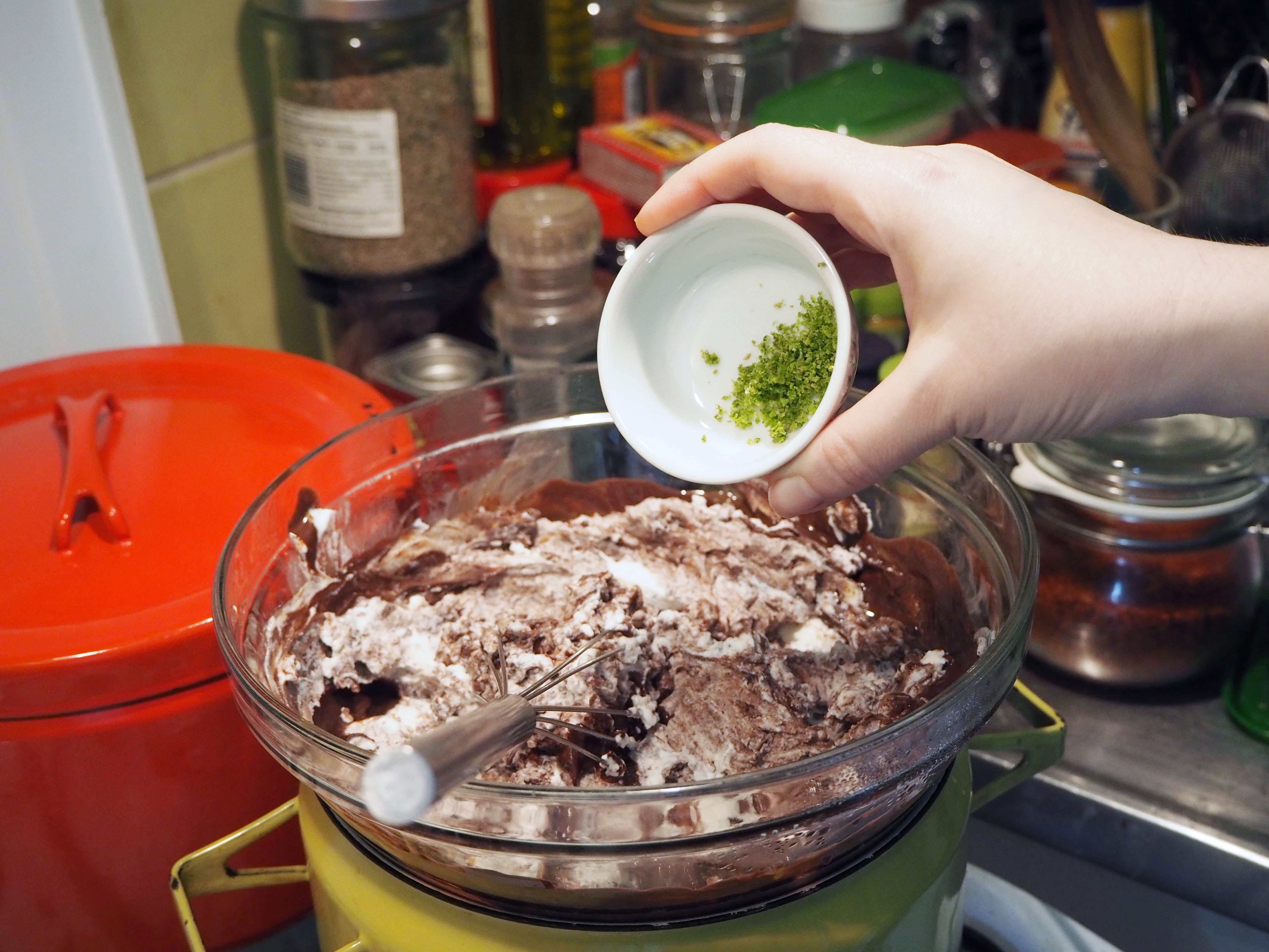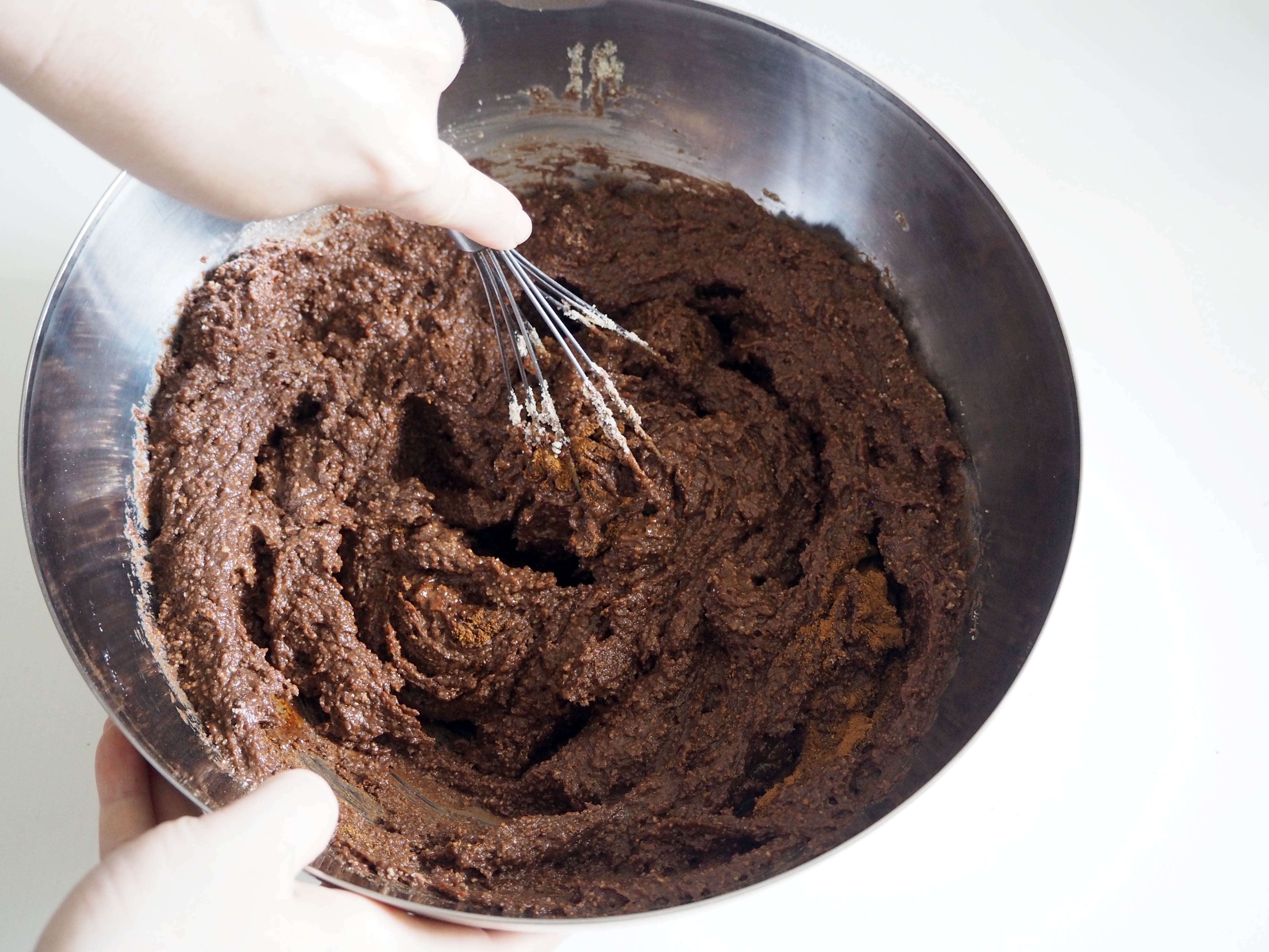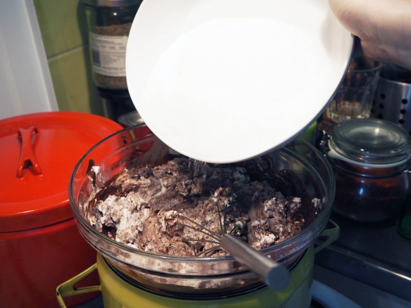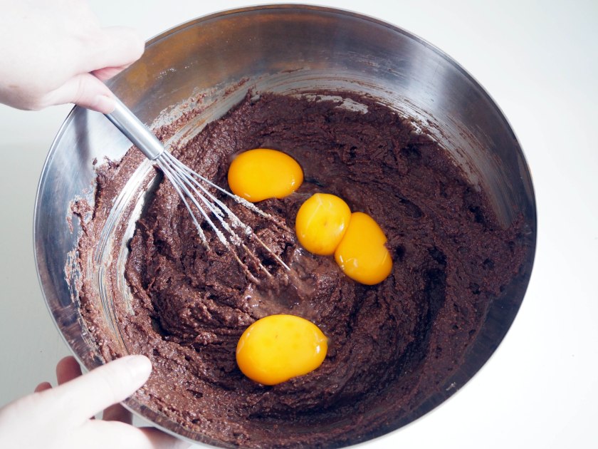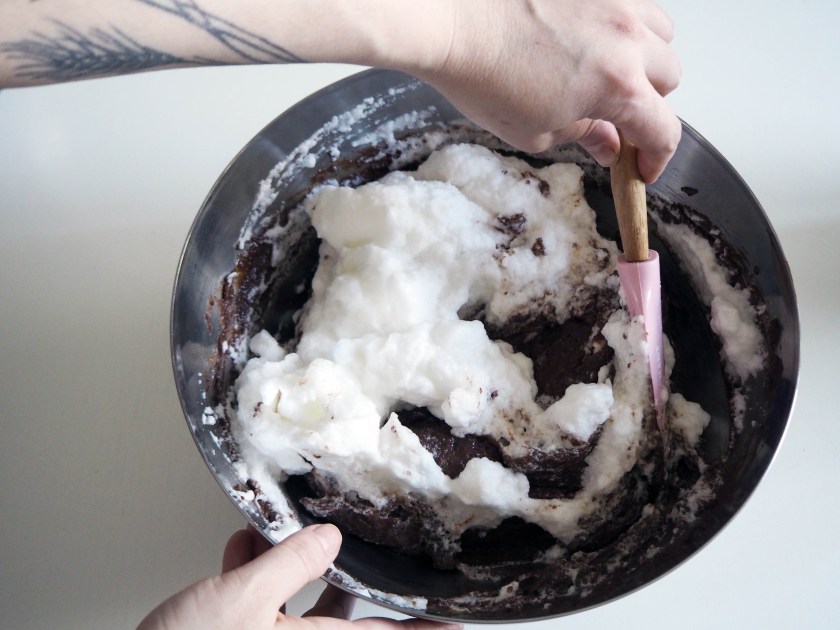 8. In another mixing bowl, put egg whites and whisk until you get stiff peaks. Fold this into the chocolate mixture gently.