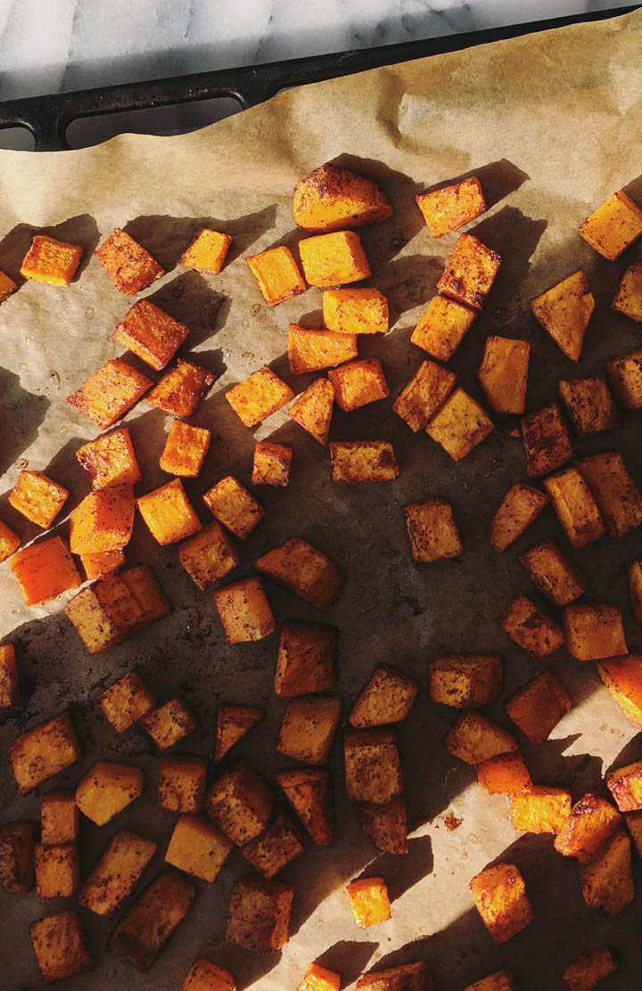 3. Roast the butternut squash mixture in the oven for 40-45 minutes, until it is tender. Take out of the oven and let it cool for 10 minutes.