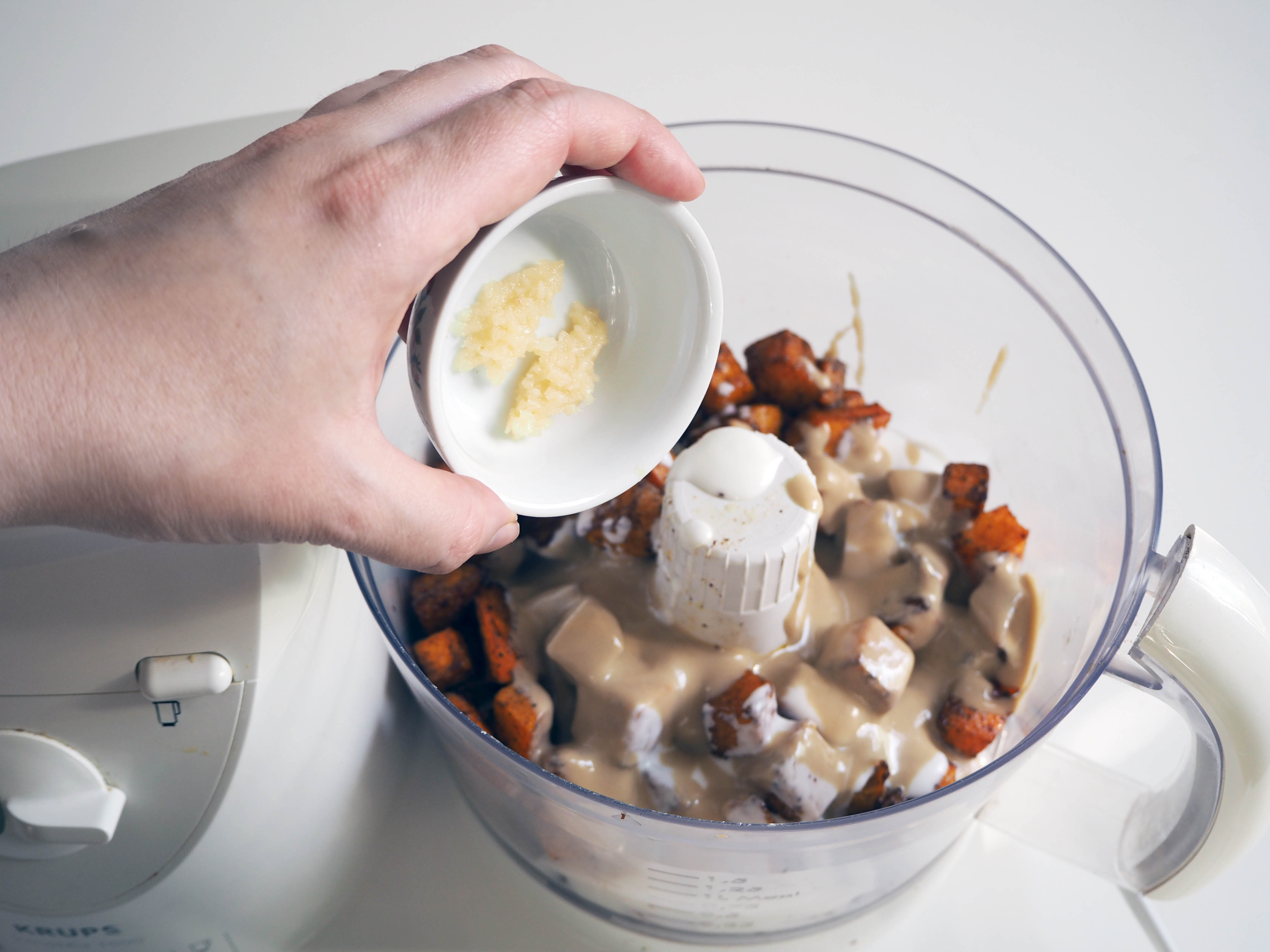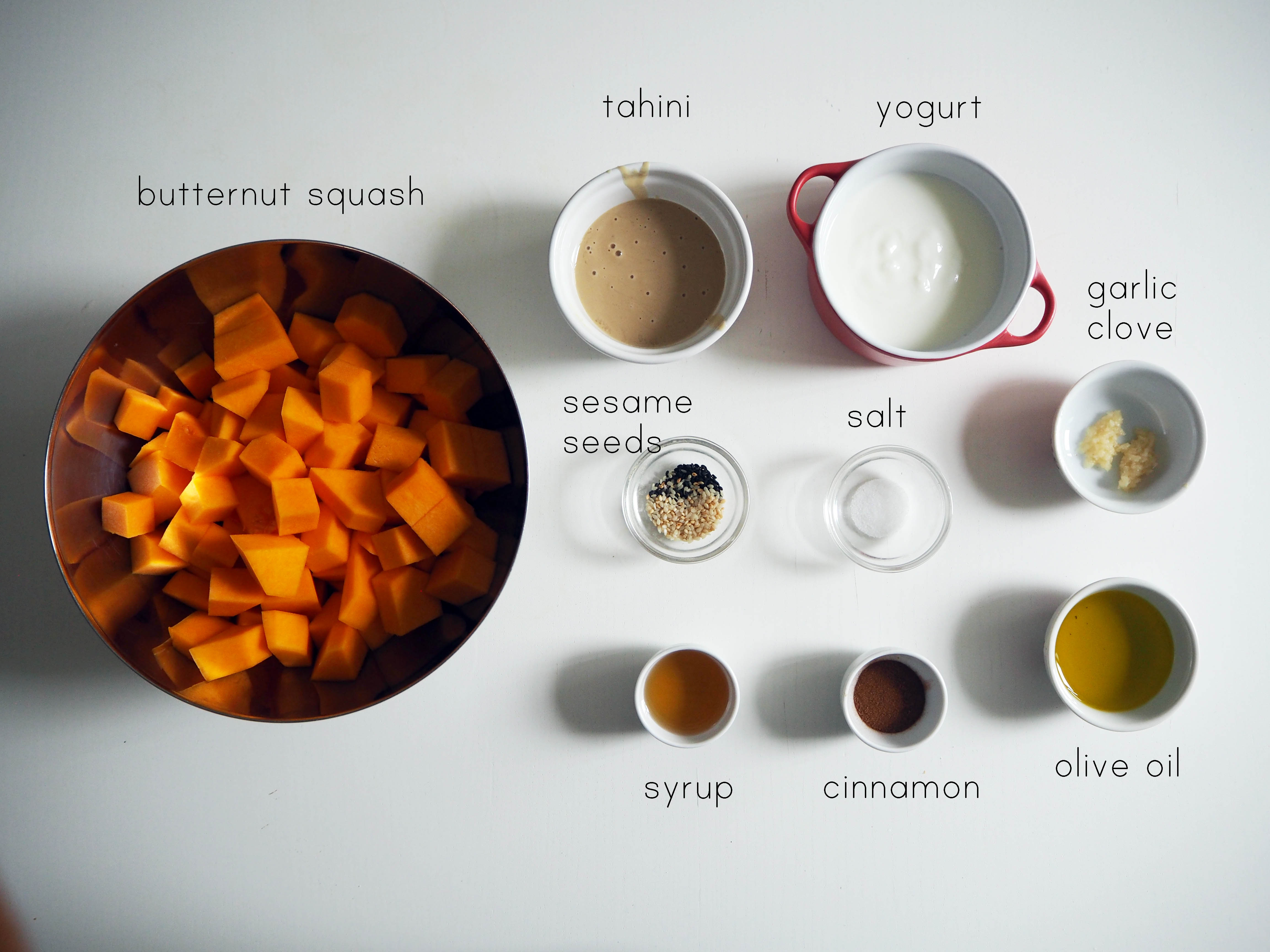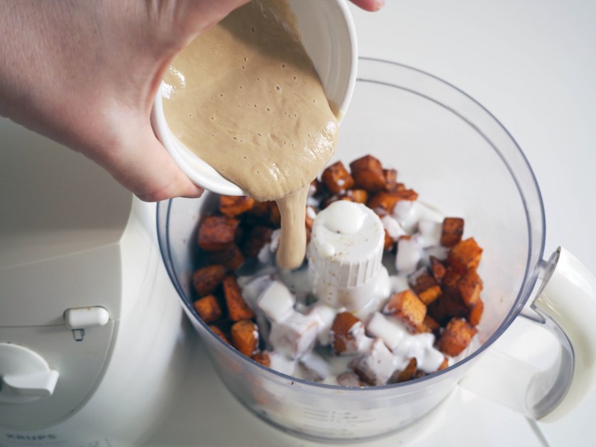 4. In a food processor, put roasted butternut squash, yogurt, tahini and garlic and process until you have a slightly smooth paste. It is nice to leave a bit texture so I recommend not to make a too creamy smooth mixture.