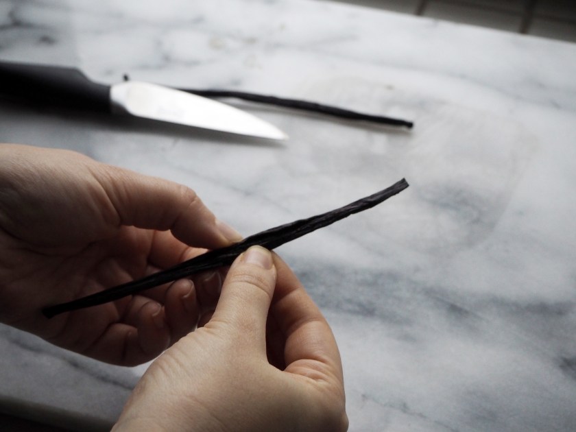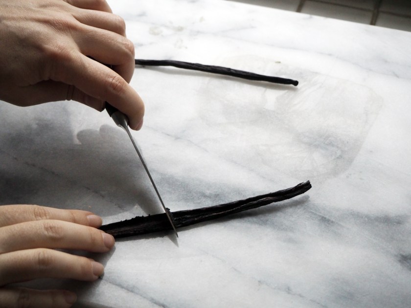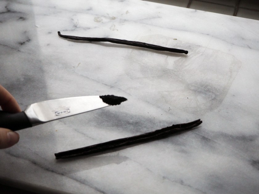 1. First scrape the vanilla pods as in the photos. Keep the sticks, don’t throw them away – you can make your own vanilla extract with them (see step 4).