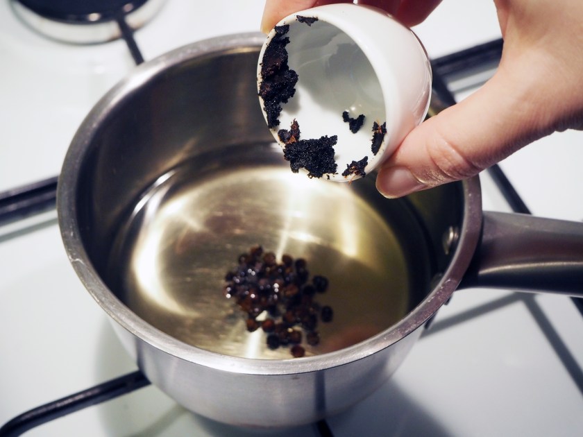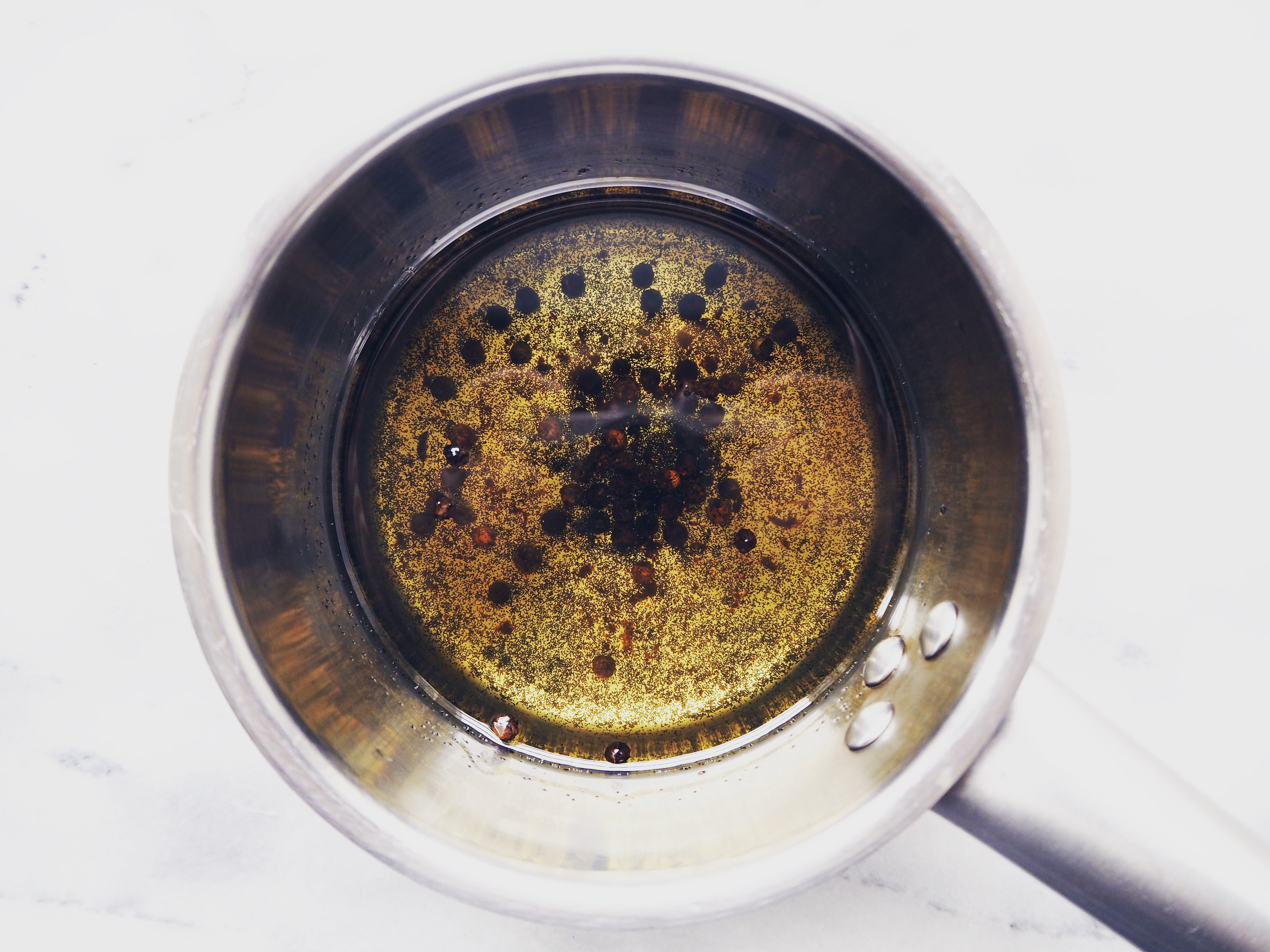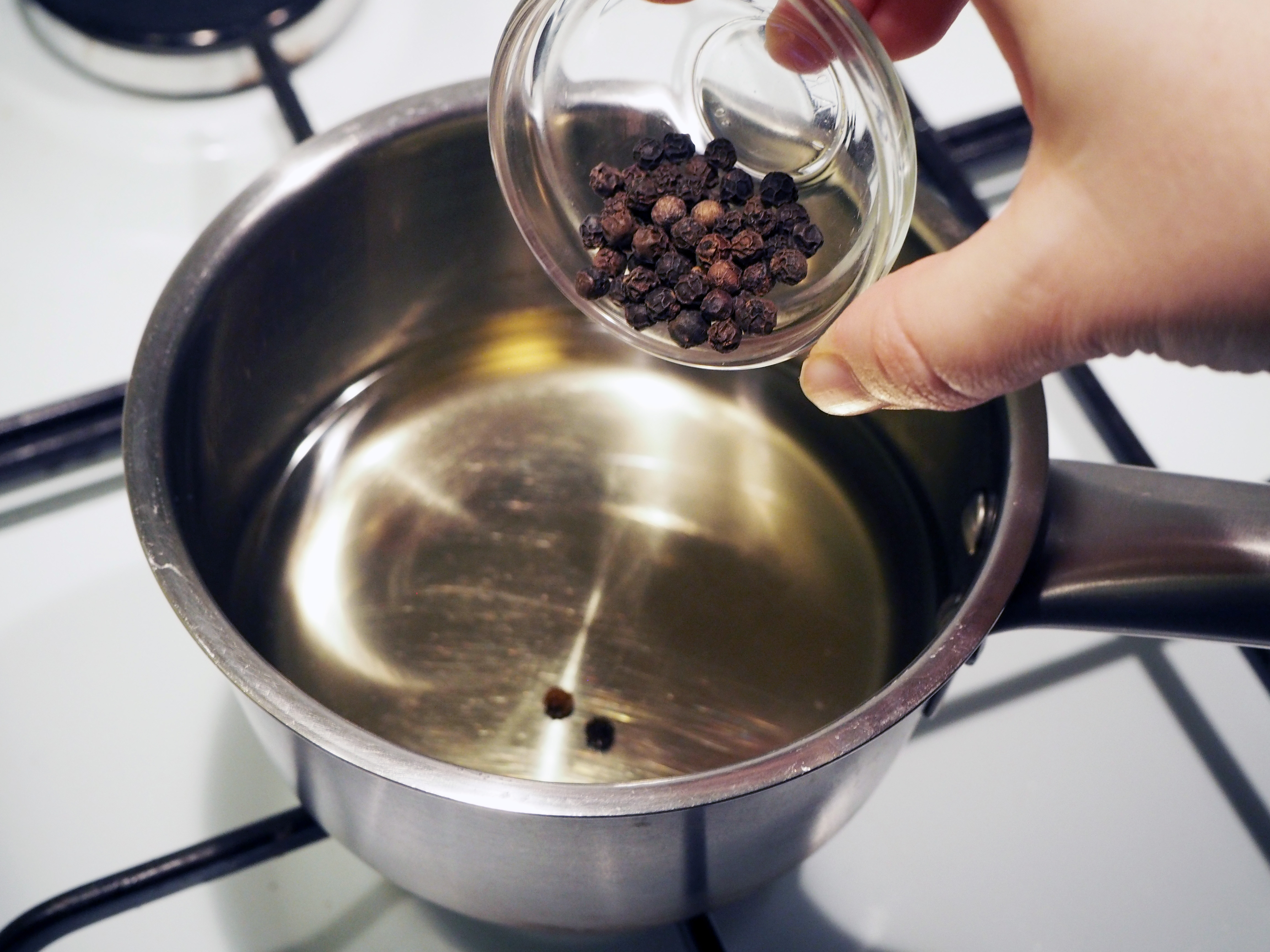 2. In a small saucepan, put canola oil, peppercorns and vanilla. By continuously whisking, heat the oil mixture on medium until it starts to react (do not heat too much and fry the oil).