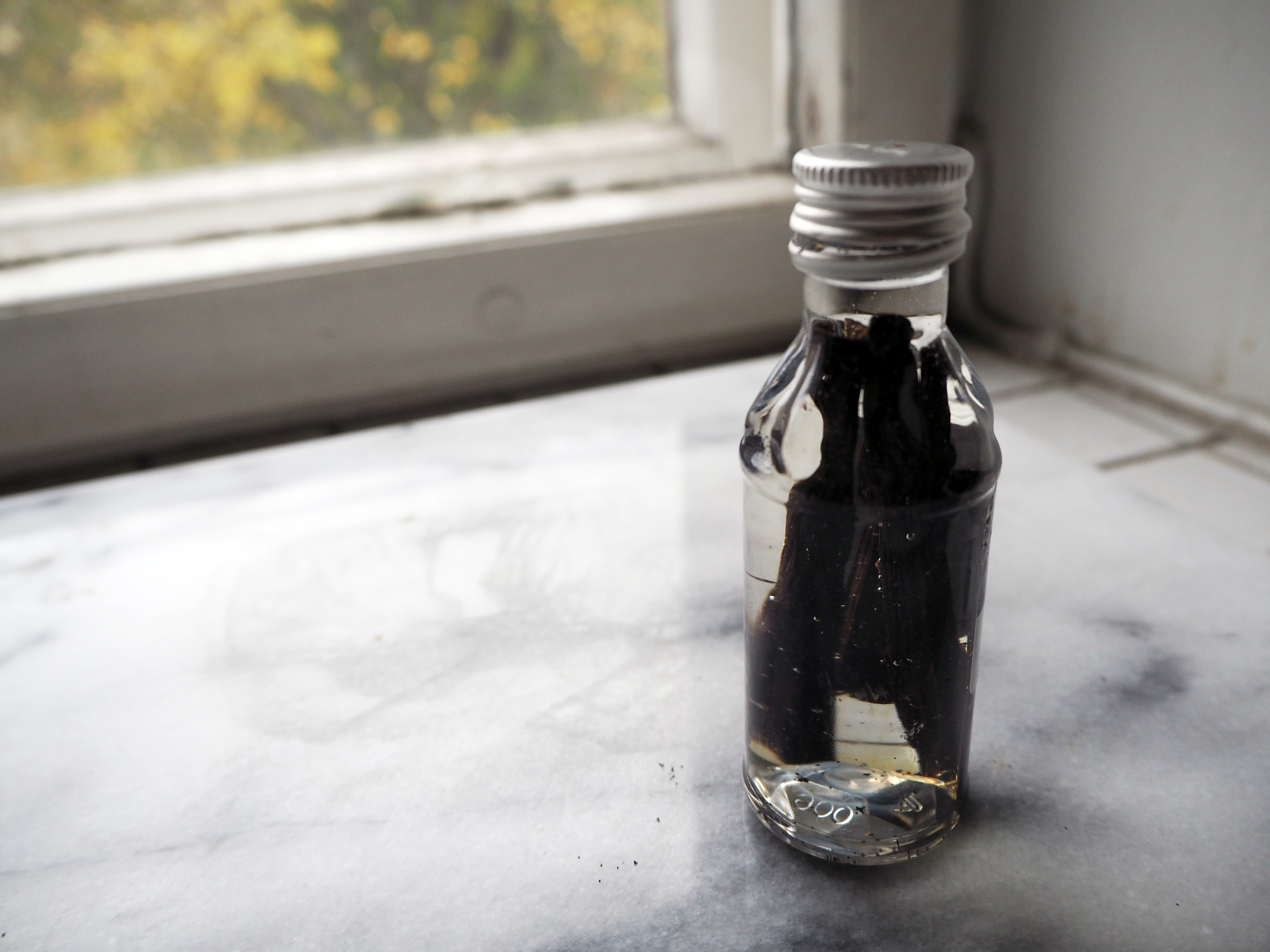 4. In the meantime, put your vanilla sticks in a mini bottle with vodka (I used mini size Finlandia vodka) and close the lid tightly. Put the bottle in a dark place, like one of your kitchen cupboards, for a month. Shake the bottle every now and then during this time. After a month, you will be able to start using it as vanilla extract. Keep the sticks inside the bottle even after starting to use it for ever increasing intense flavour.