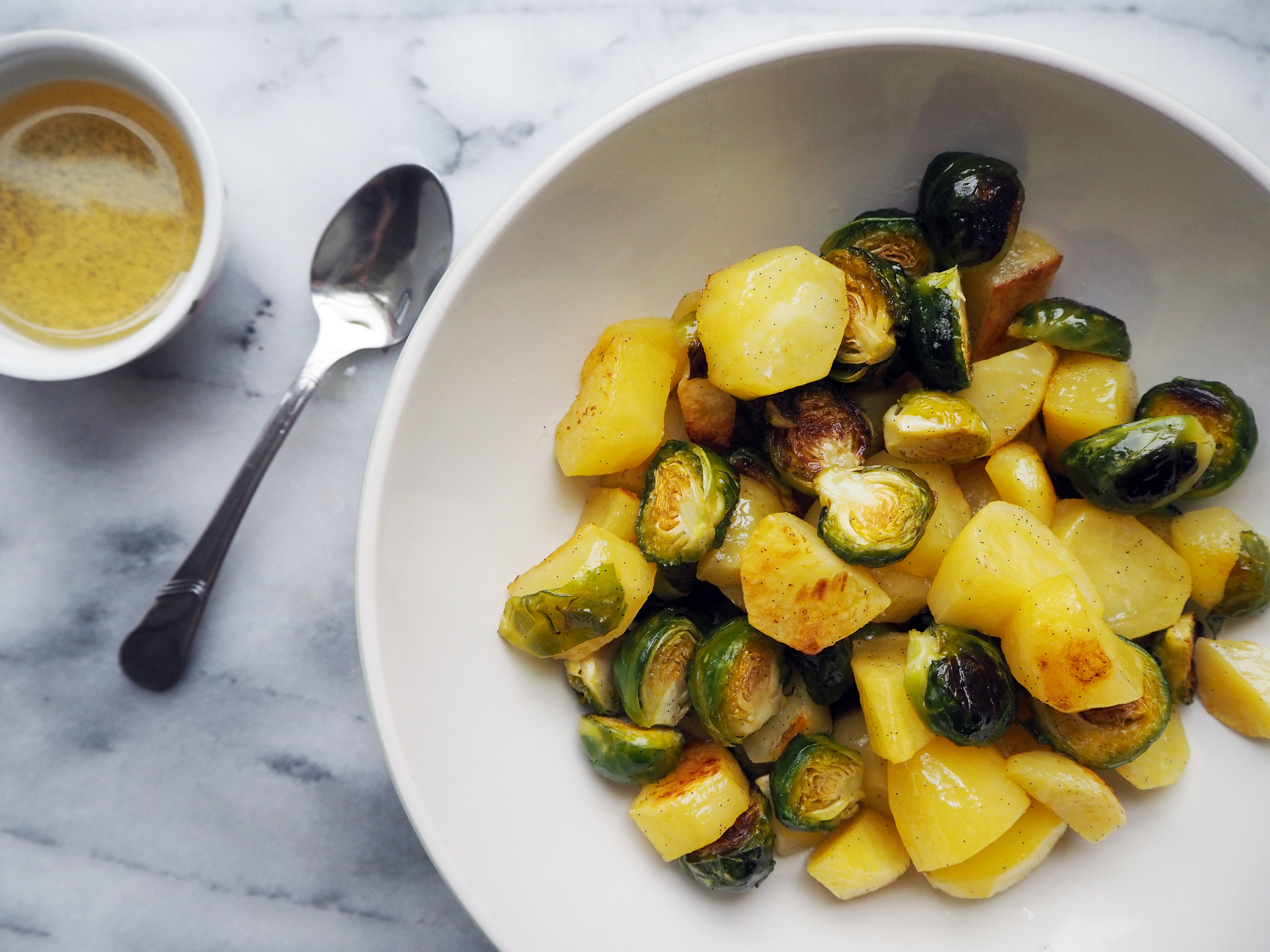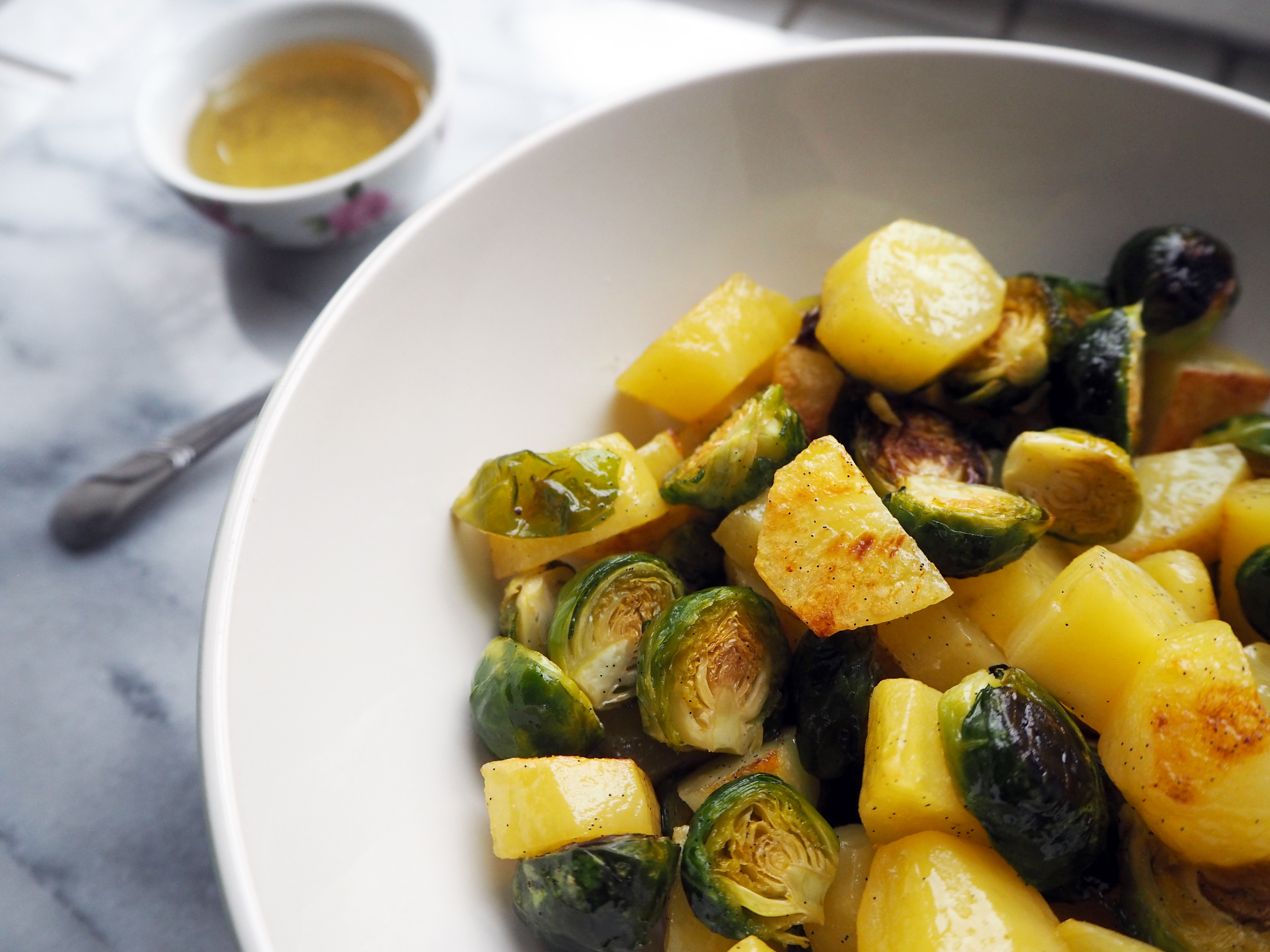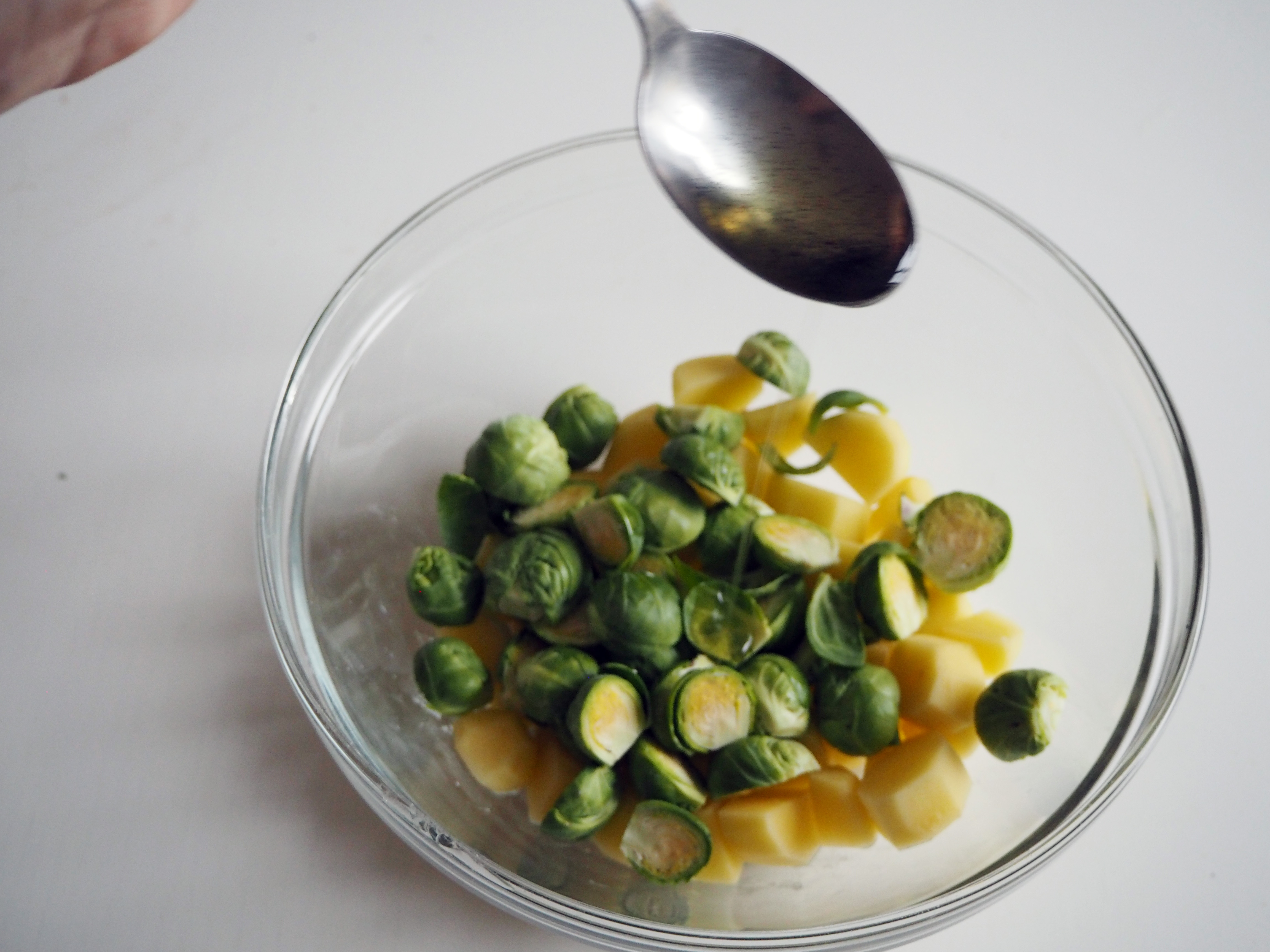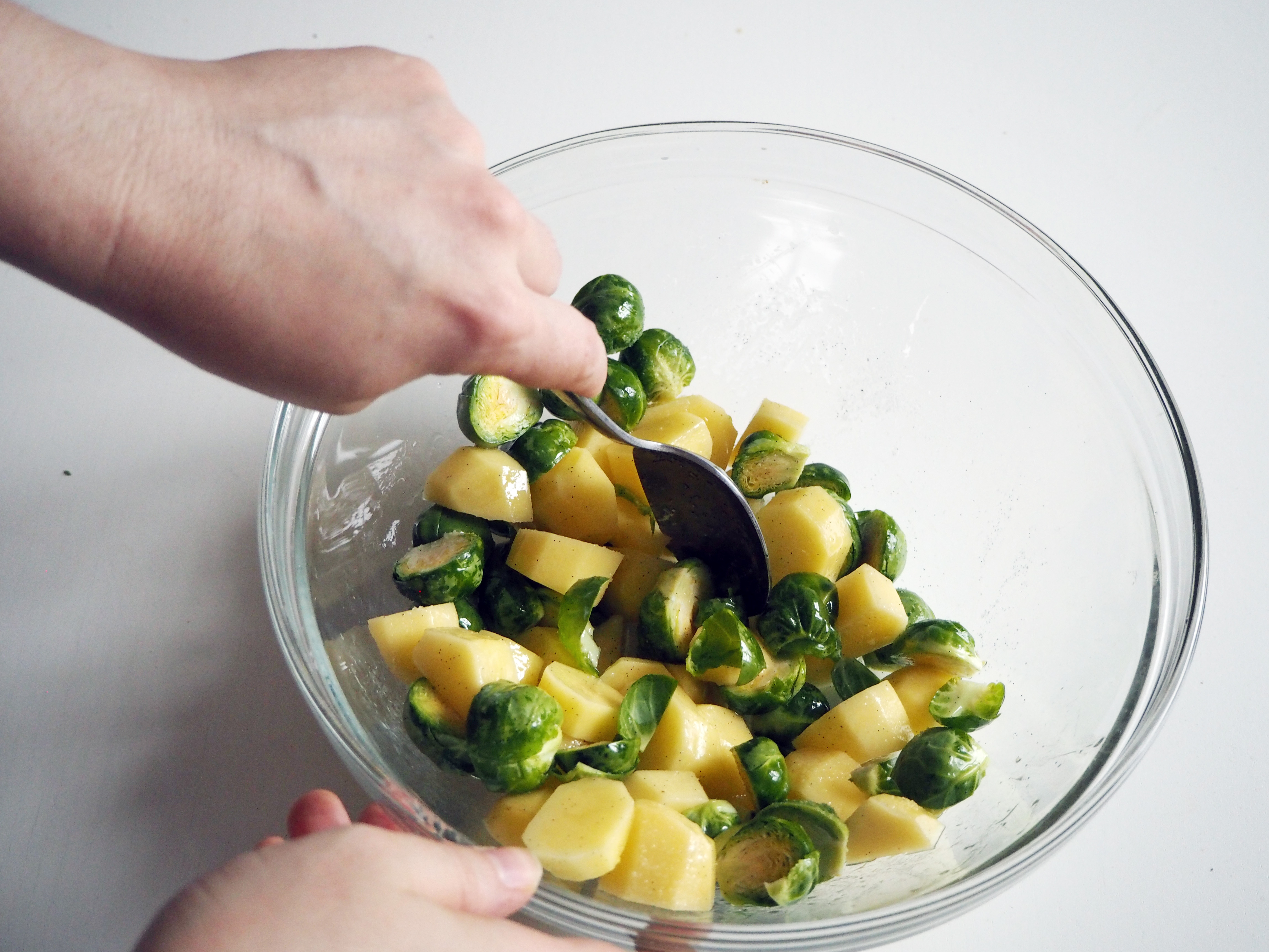 7. For roasted vegetables, preheat the oven to 180C. Peel potatoes and sprouts (the outer, not-so-nice layers). Cut them in any shape / size you want. Mix the veggies with 1 tsp of infused oil and a good pinch of salt. Put on an oven tray with a baking paper and roast in the oven for about 20-25 minutes, until they start to brown. Once out of the oven, mix again with vinaigrette and you are good to go! Enjoy!