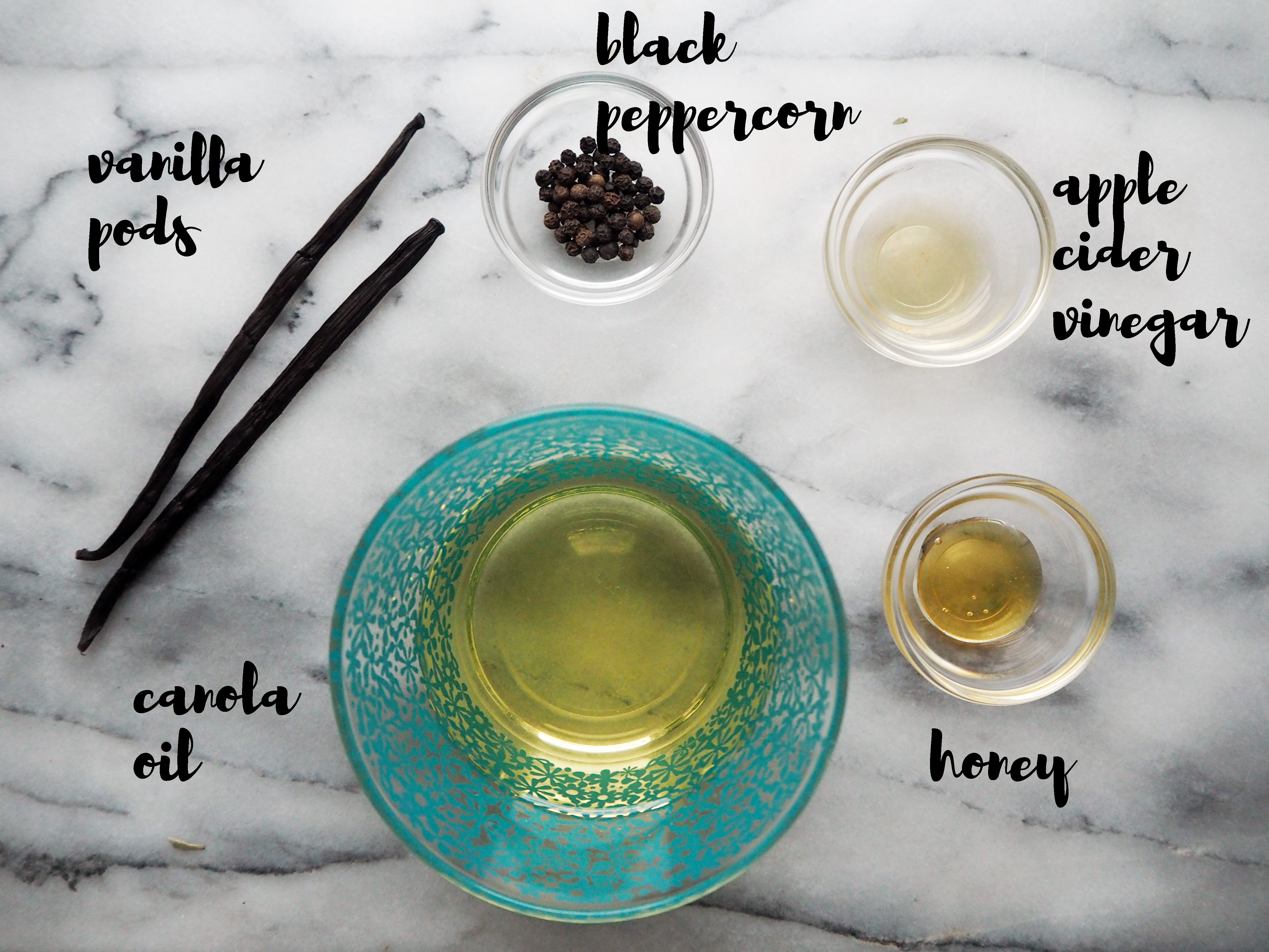 To make this recipe, you will have to plan ahead and be patient because you have to leave the oil for 4 hours so that it can absorb all the delicious flavours of vanilla and black pepper. You can of course make ahead a large batch and in a glass bottle you can use it for a long time.