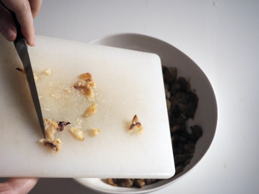 4. Peel garlic and smash / chop finely (they will be so soft that chopping will actually turn out to be smashing as well). Add them to eggplants and mix well.