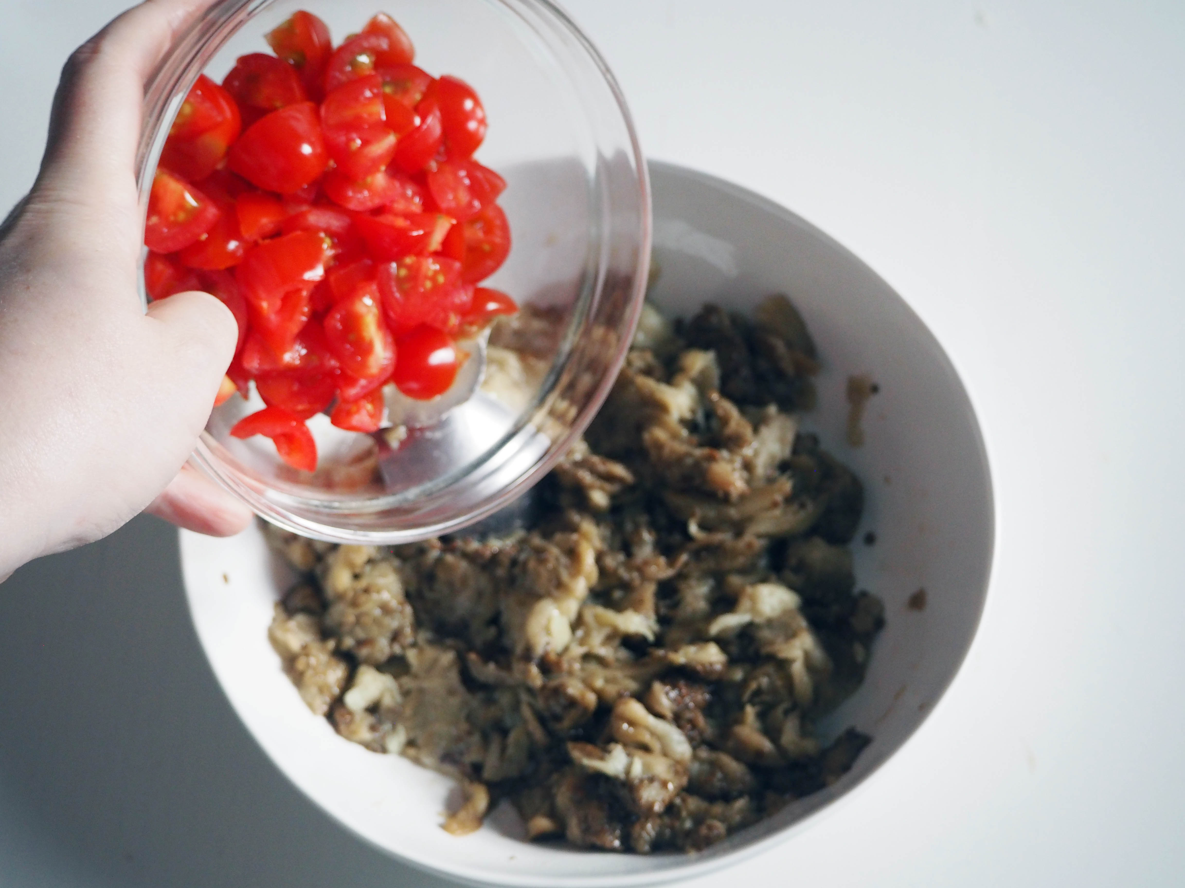 3. Cut eggplants in the middle and scoop out the flesh into your salad plate and chop coarsely.