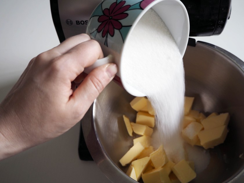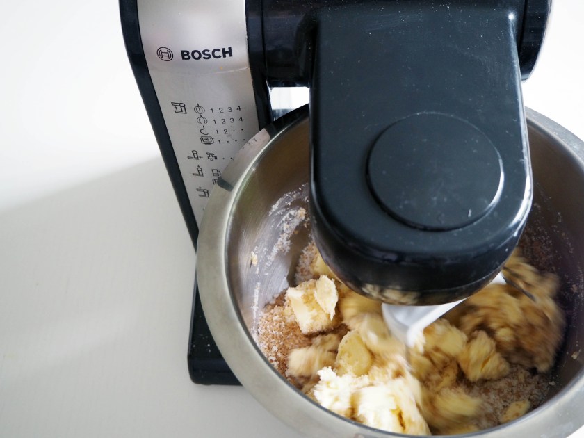 1. Put butter and sugars in a mixing bowl and mix for 4-5 minutes in medium speed to make a creamy mixture. Scrape the sides with a spatula if needed.