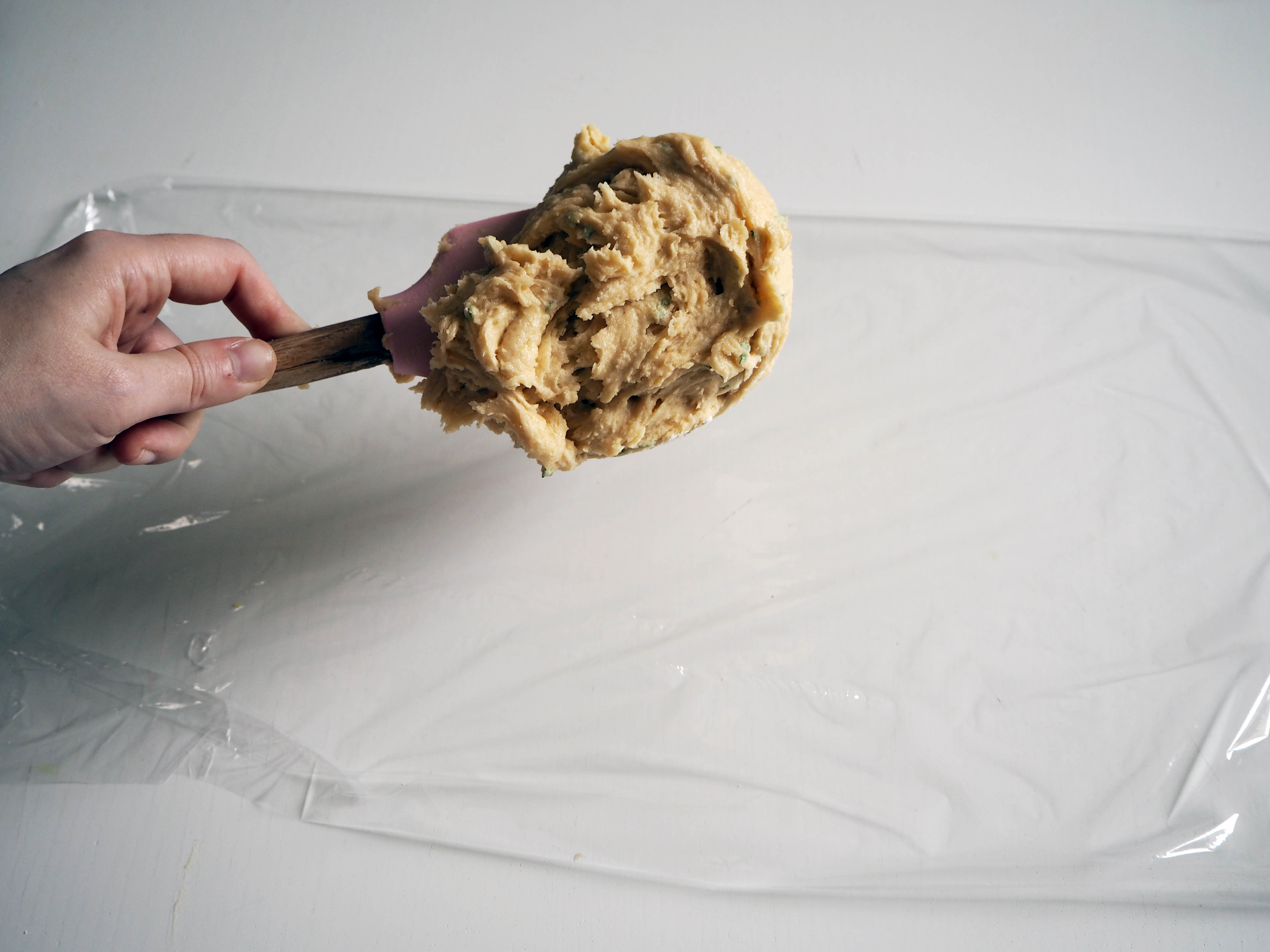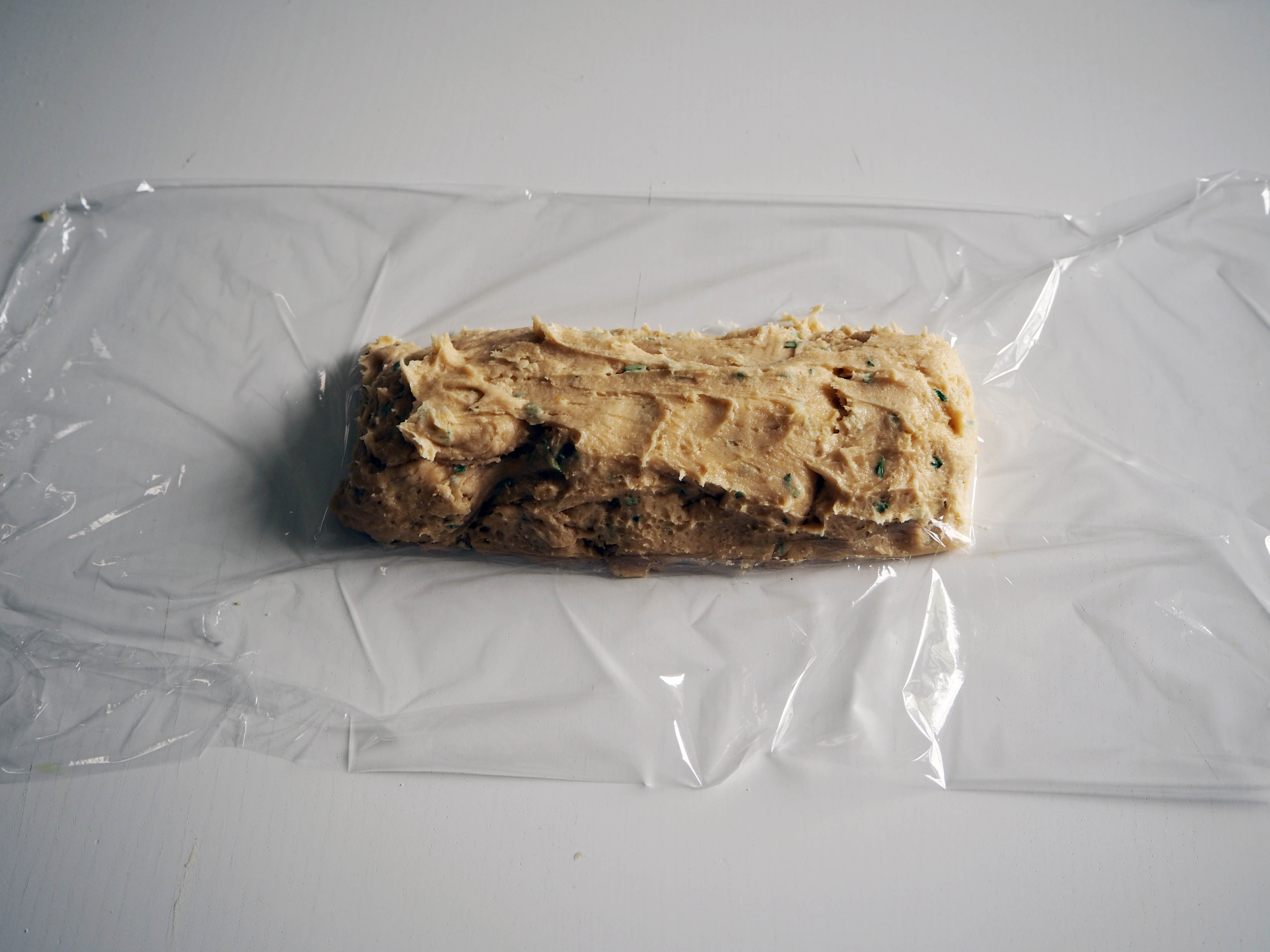 5. Put a large stretch film on the counter / table. Using a spoon, put half of the dough on the stretch film to shape into a log about 5 cm wide. Wrap the dough with stretch film, finalise shaping and put in the freezer. Repeat with remaining half of the dough. Let the dough logs stay in the freezer for at least 2 hours up to overnight.