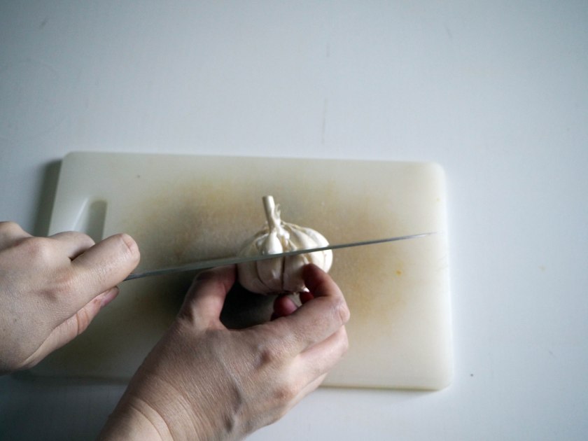 2. Trim off the top of garlic head – don’t cut too much and keep the cloves altogether.