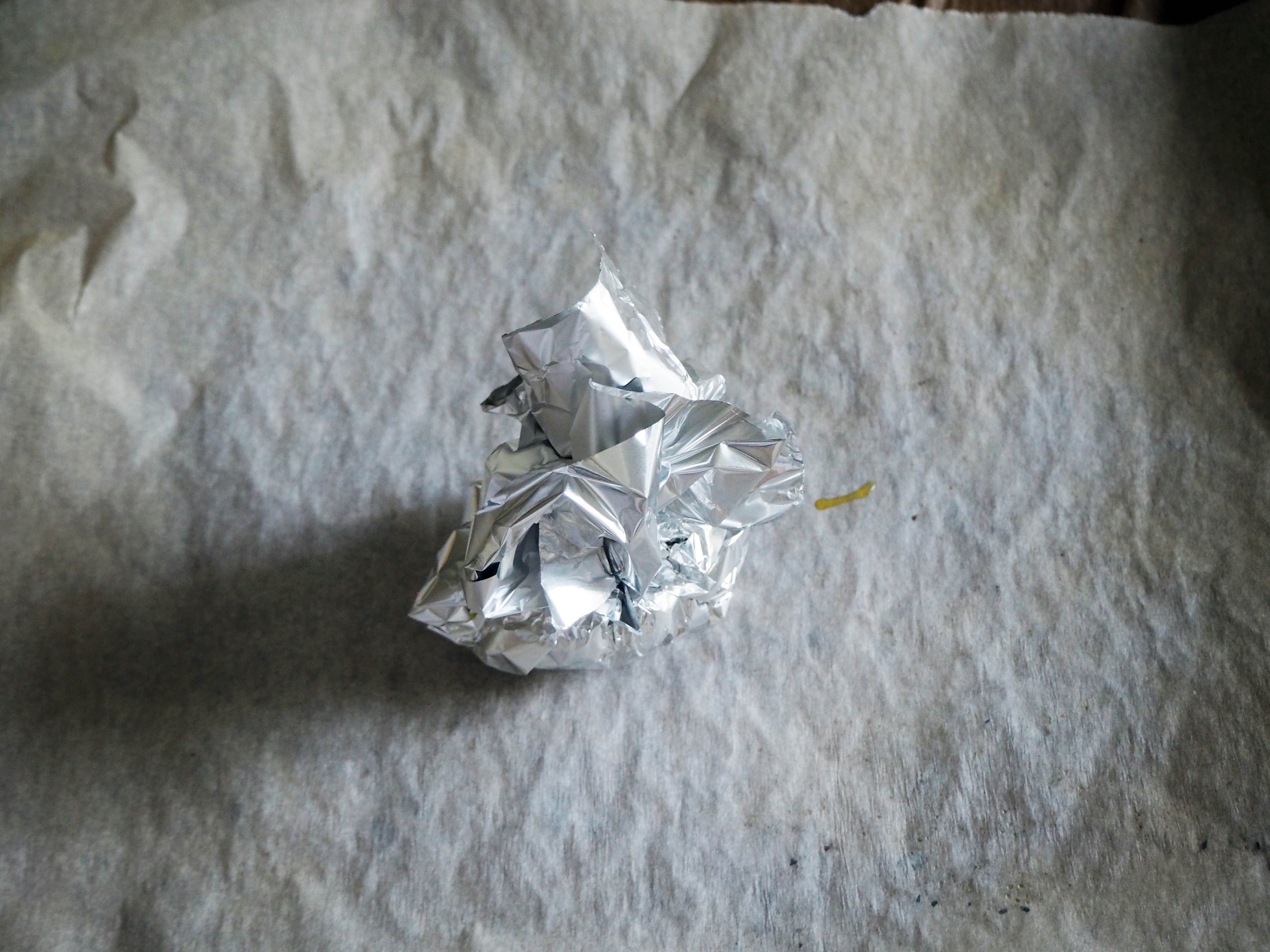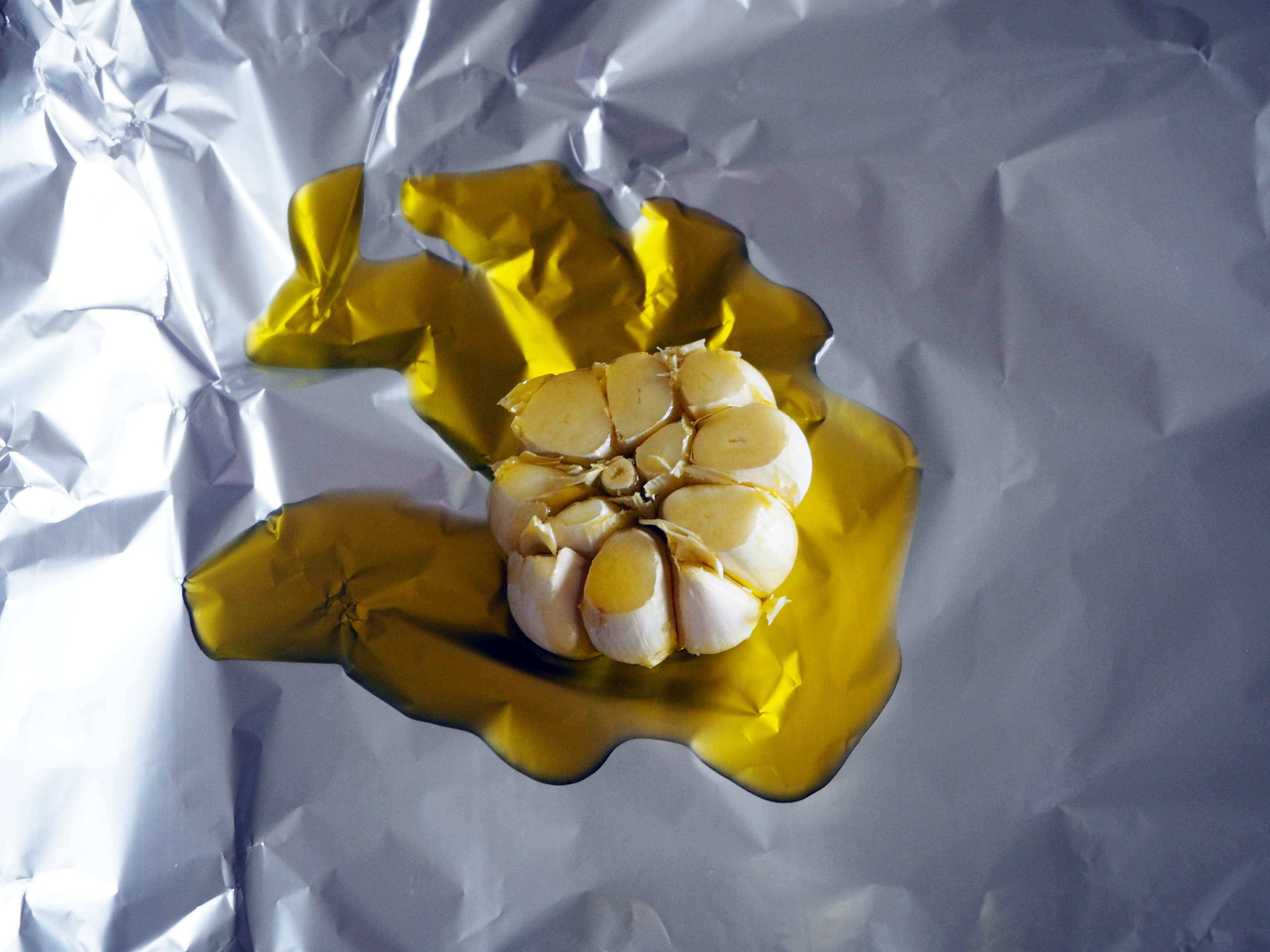 3. Put the trimmed garlic head on a piece of aluminium foil. Drizzle about 1 tbsp olive oil to cover all the cloves. Wrap the foil tightly and put in the oven, in medium rack. Roast the garlic for 45 minutes. When roasted, take it out of the oven and let it cool close to room temperature.