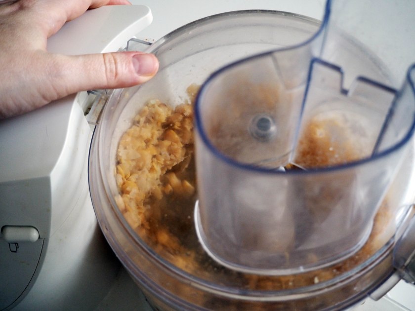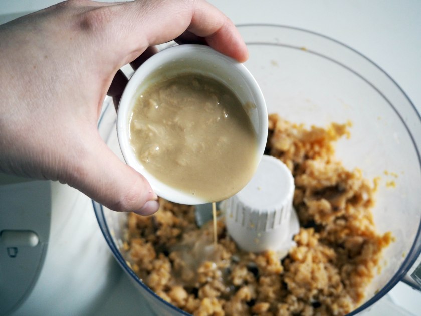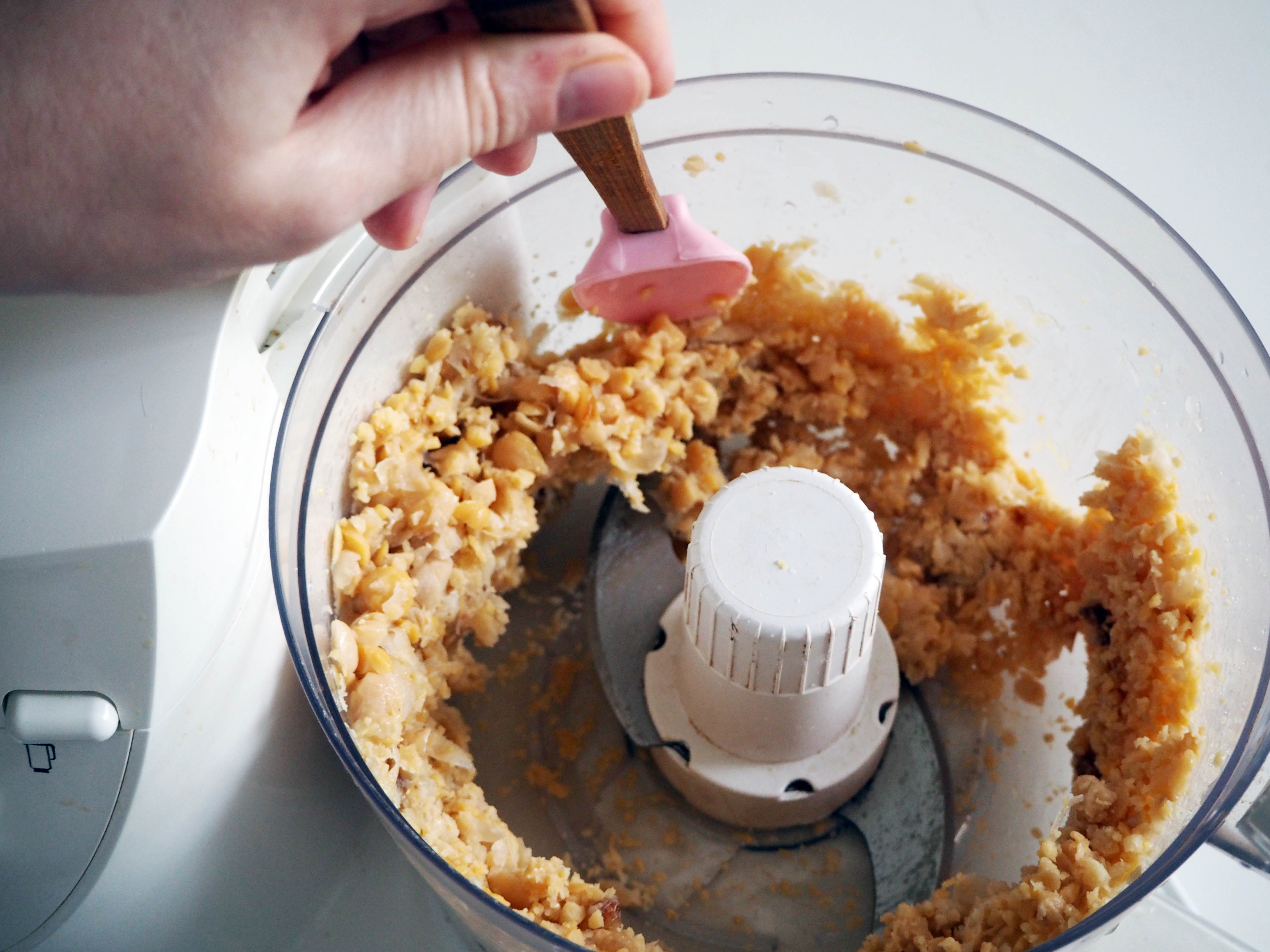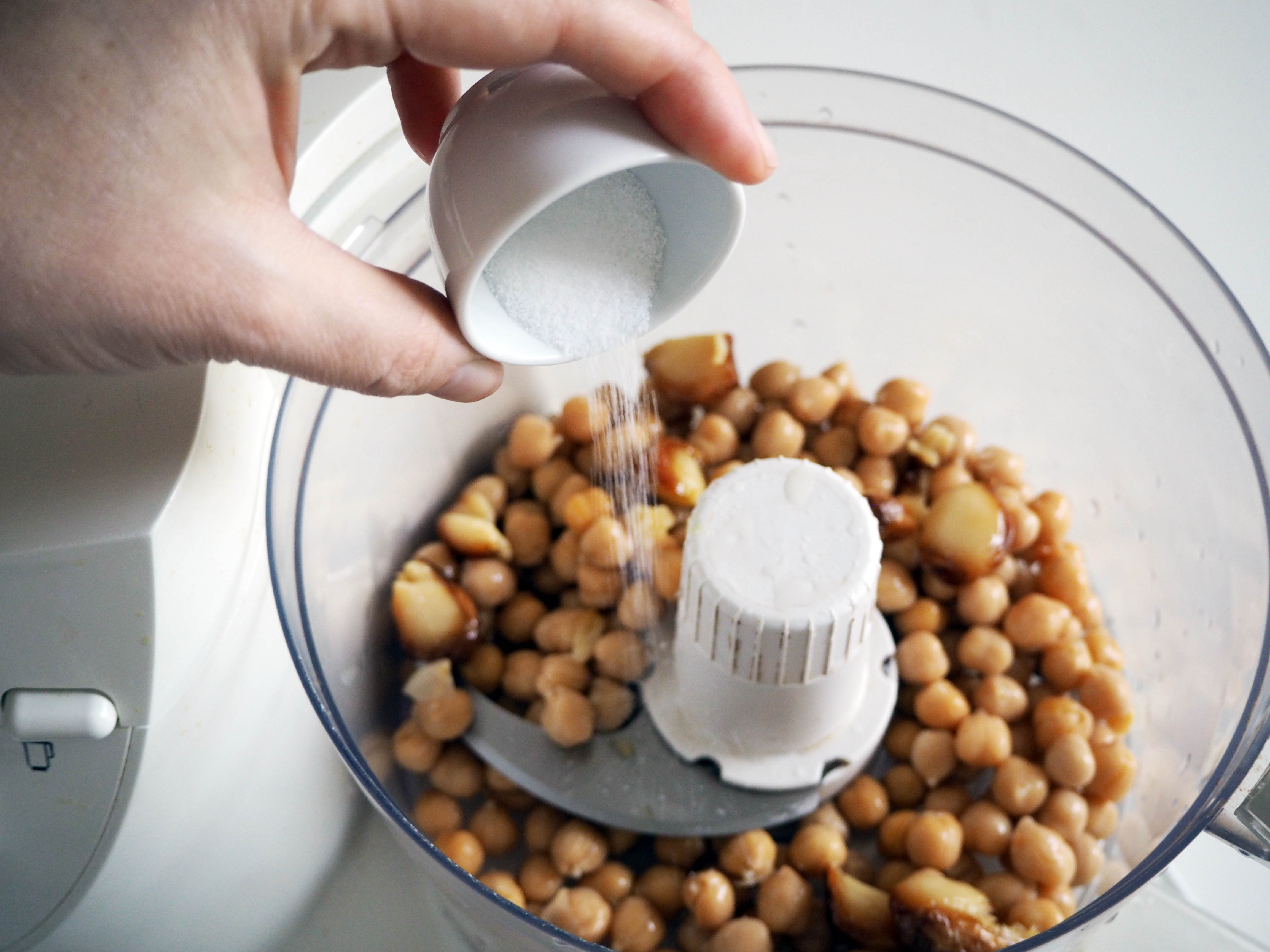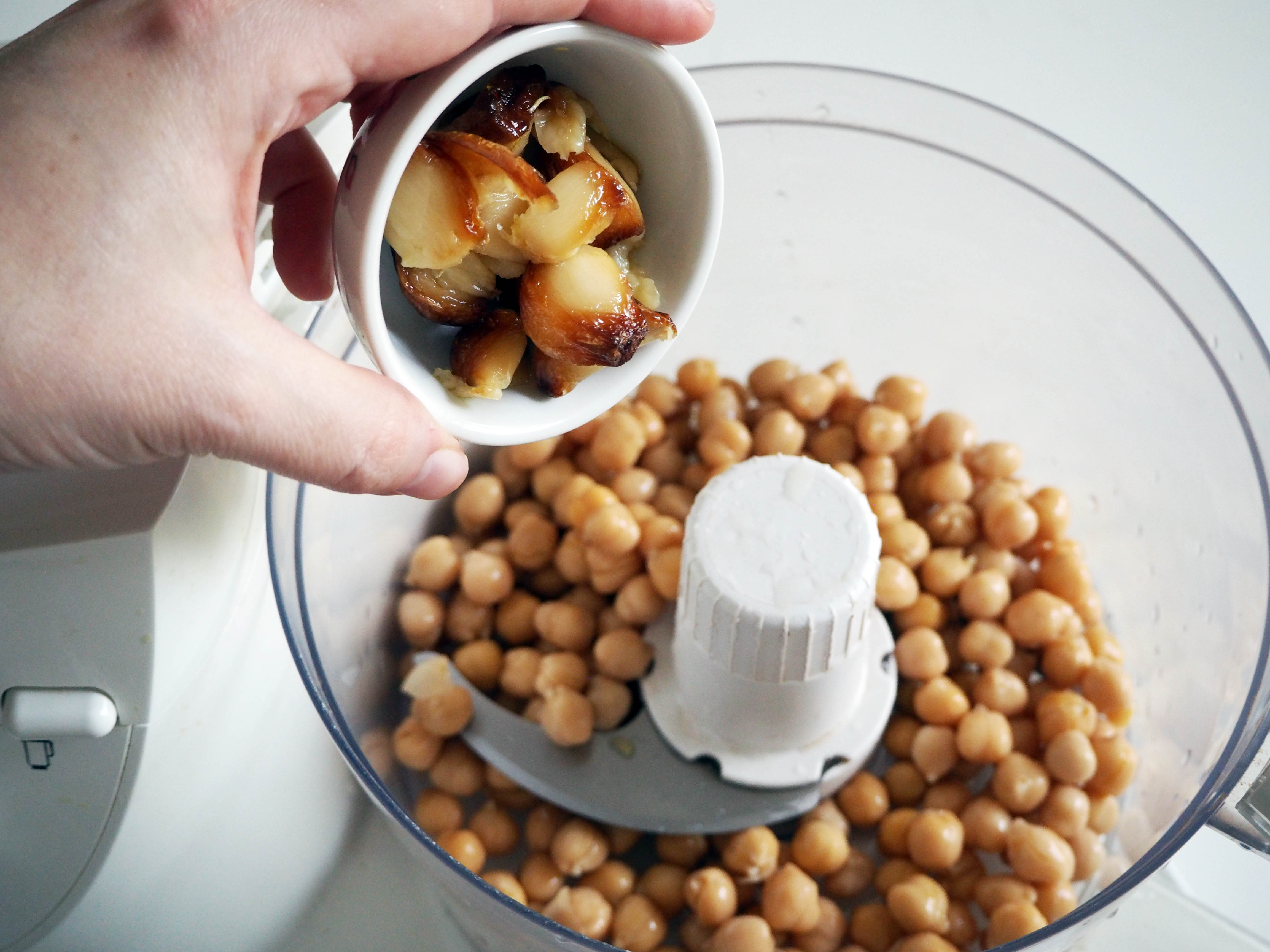5. In a food processor, put chickpeas, roasted garlics and salt. Process until as smooth as possible. Scrape the sides using a spatula if needed.