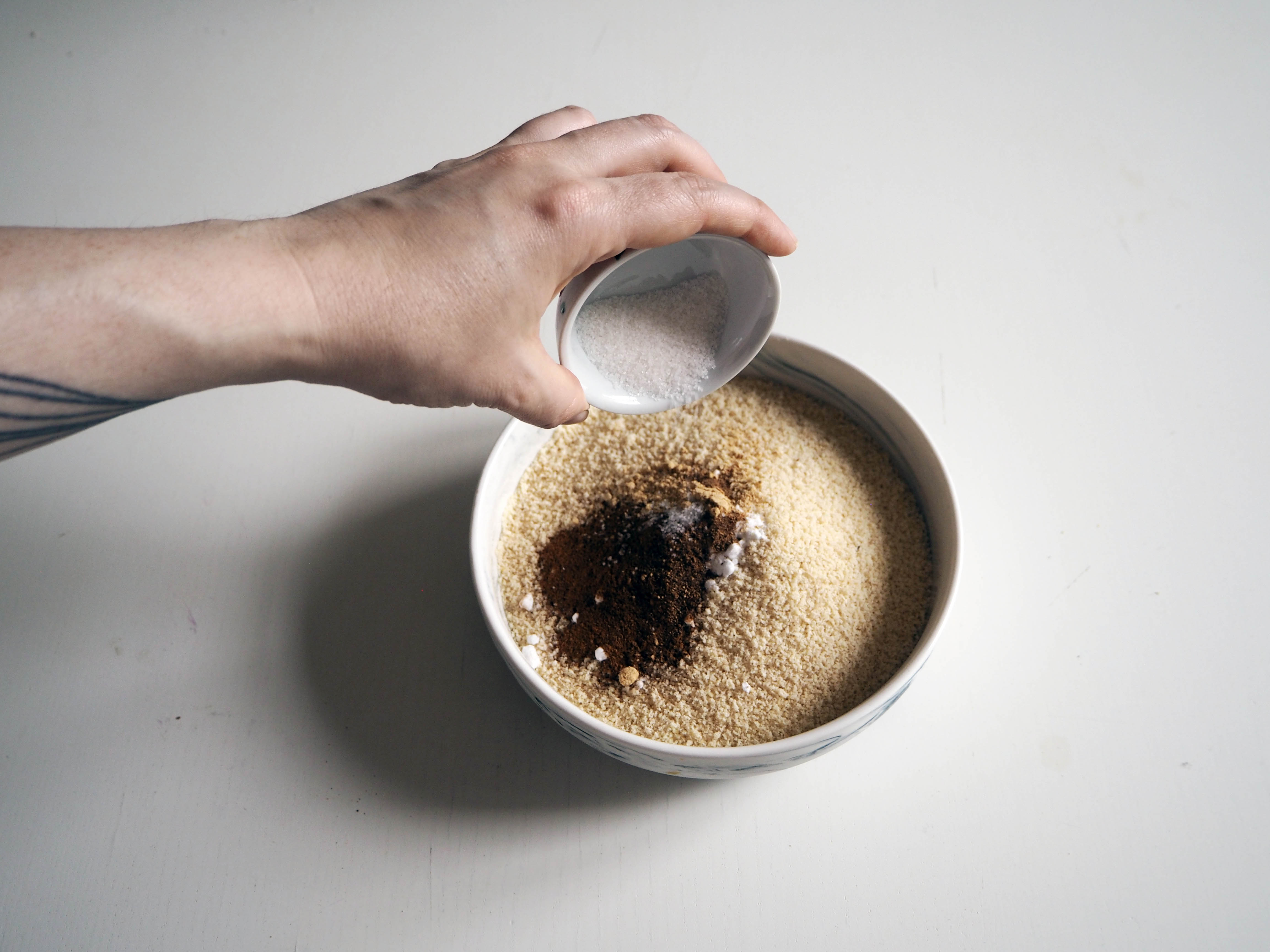 2. Mix all the dry ingredients (first 7 ingredients in the list) in a bowl and put aside.