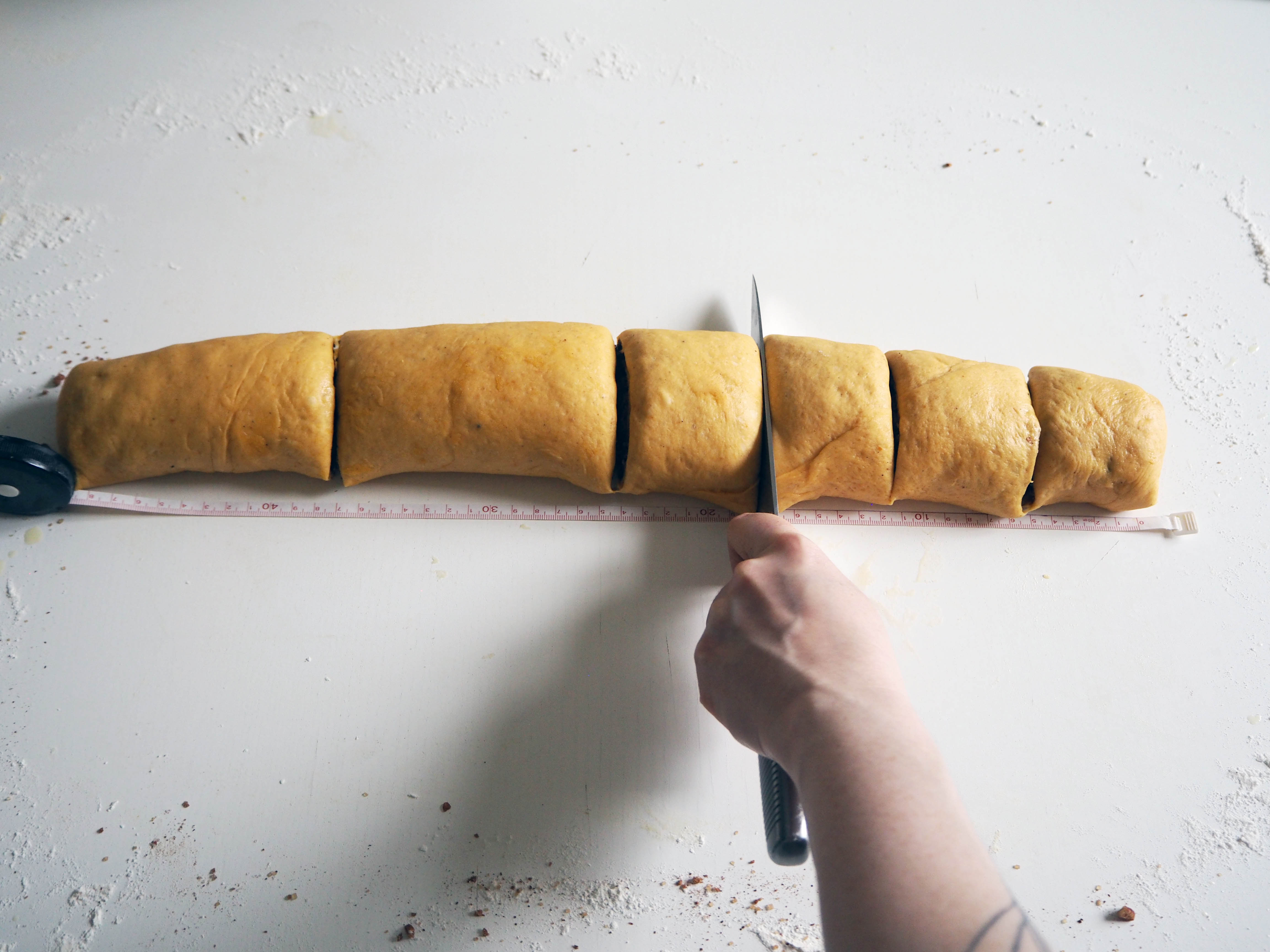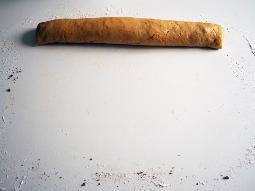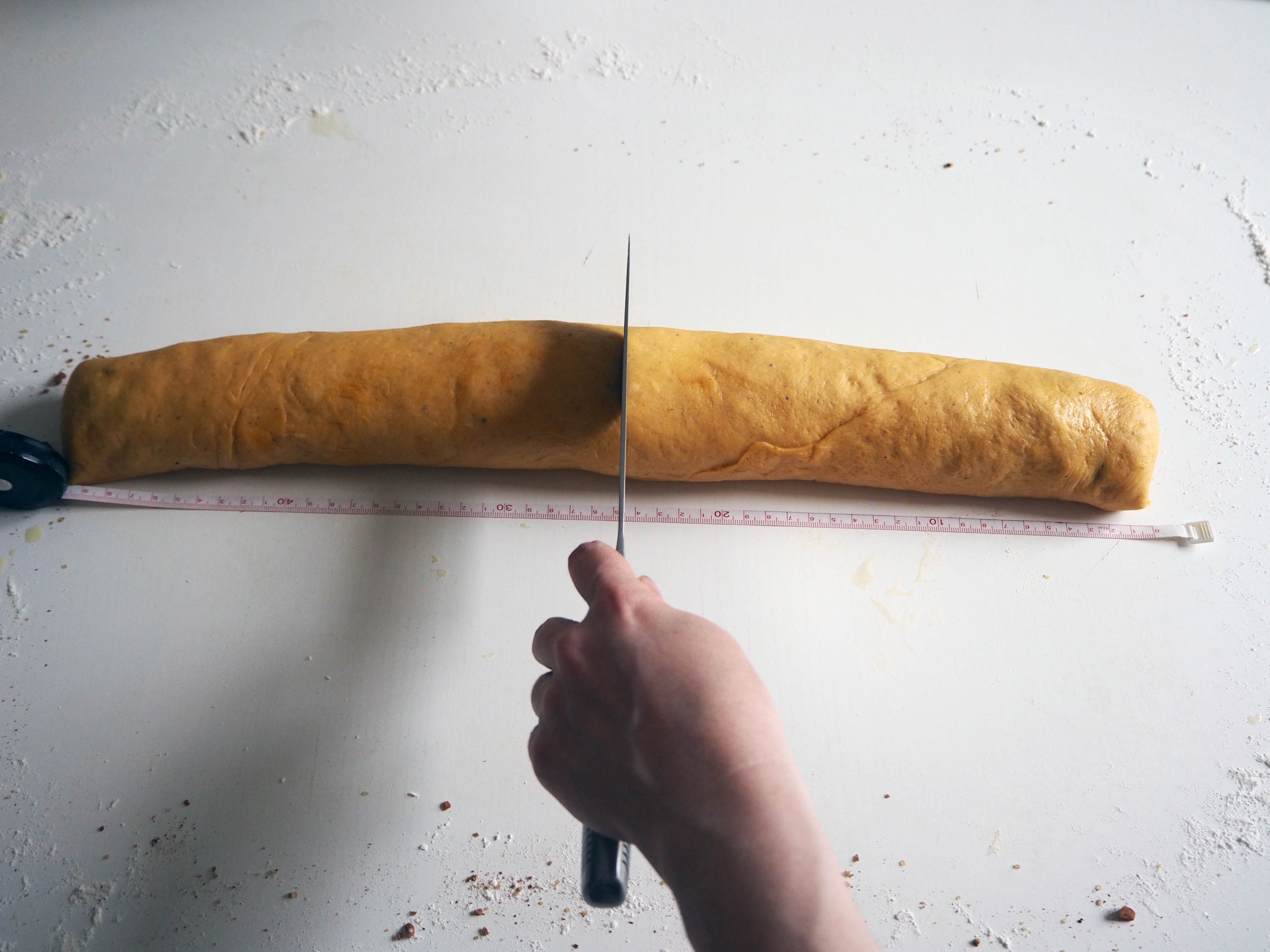 13. Cut off the two ends of rolled dough a little to give the roll a smooth sausage shape. Slice the rolled dough in half and continue slicing each piece in half again and again until you have 16 slices.