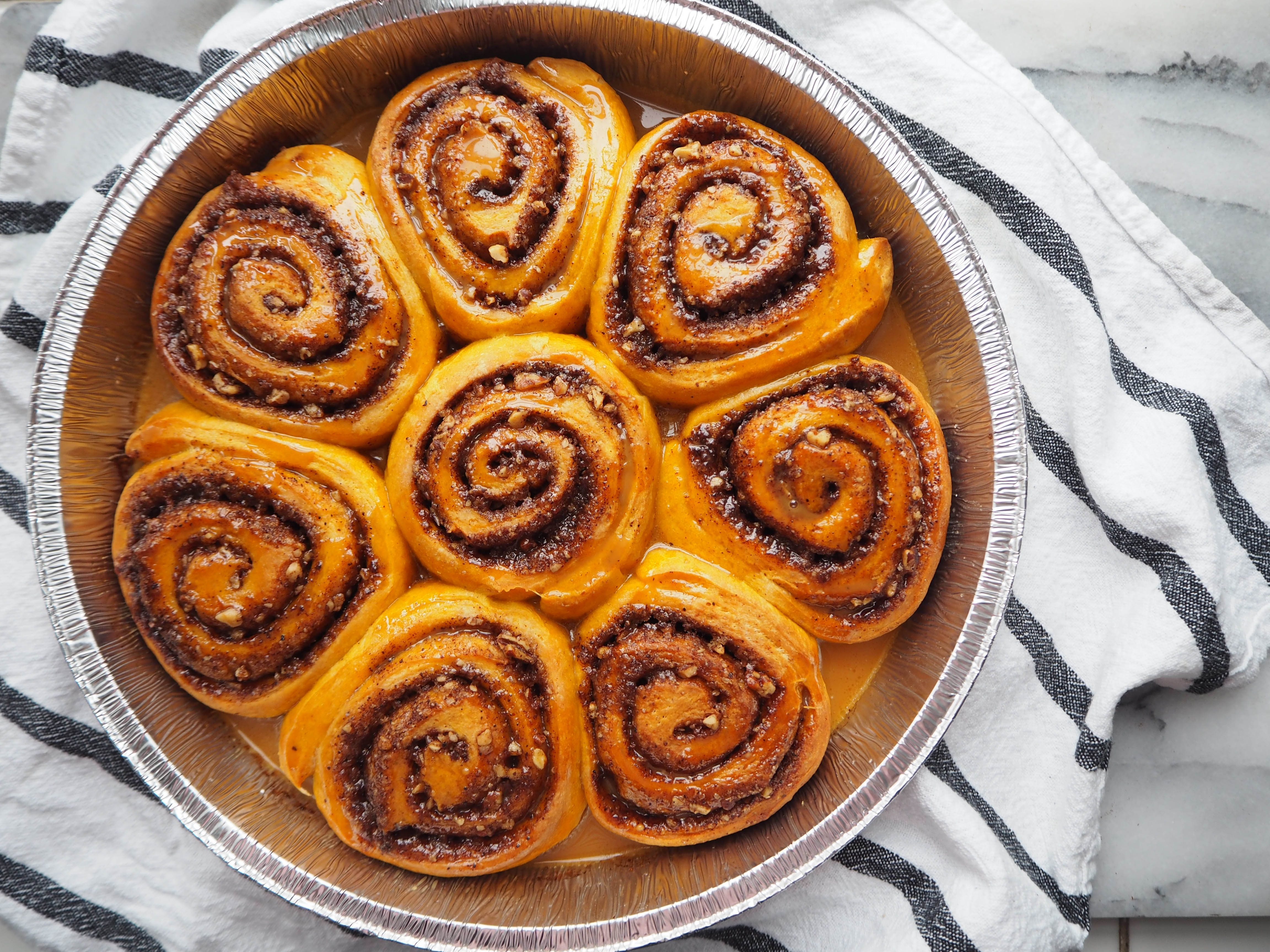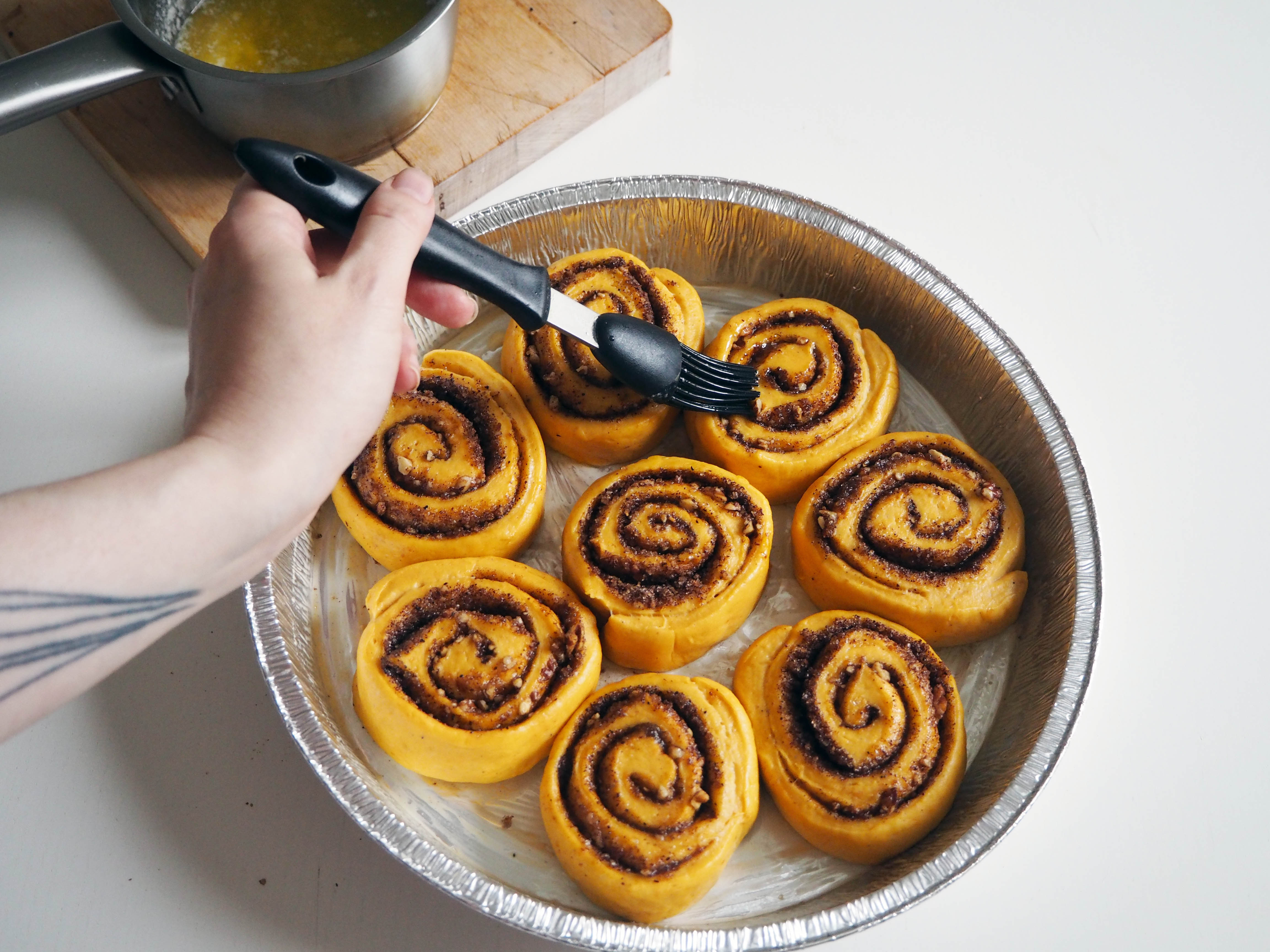 17. When the rolls are baked, take them out of the oven and let them cool for 5 minutes. After that, pour the caramelised sauce on each piece, just enough to get them moist but do not pour too much otherwise they will get soggy. Leave the buns to absorb the sauce for 10 minutes inside the mold and then take them out. Eat as fresh as possible. Enjoy!