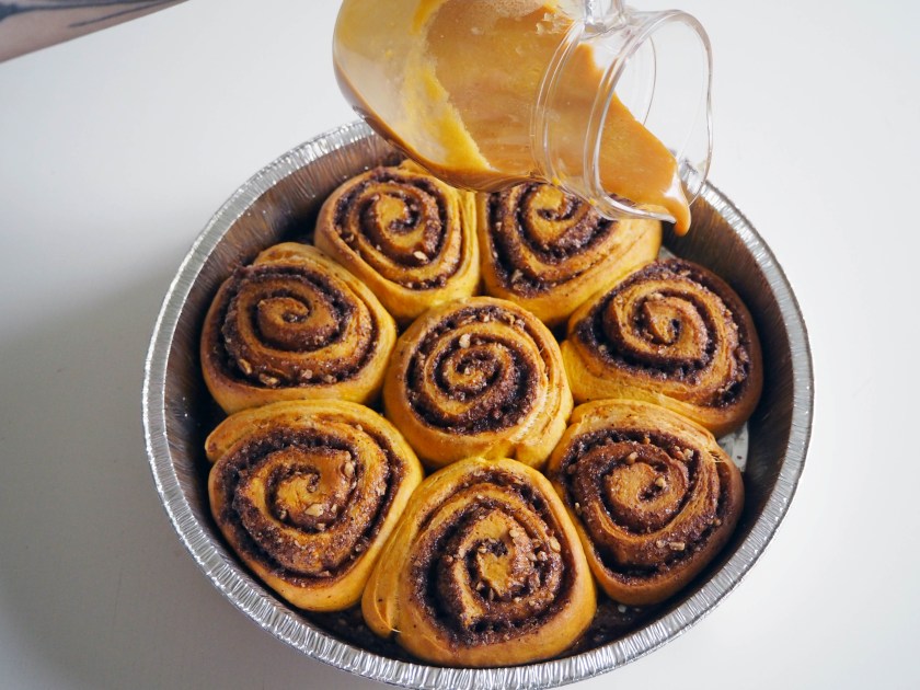 My relationship with pumpkin is getting serious, ahem. Well, after baking cakes and cookies with pumpkin puree, I started to wonder how it would taste and look in a dough. This curiosity ended up with cinnamon and pecan rolls. But I’d like to talk more about the sauce now, more specifically, the brown cheese in the sauce.