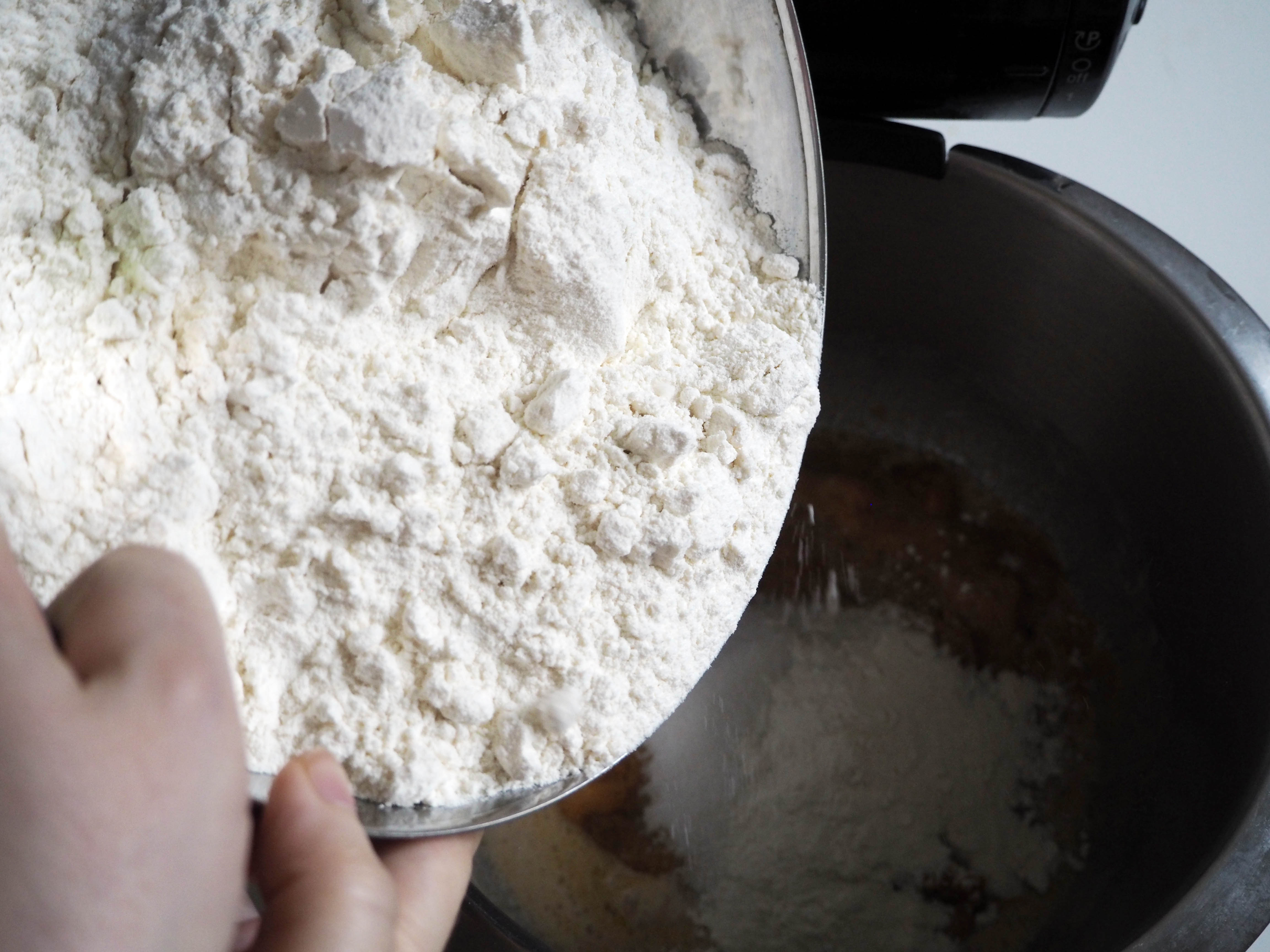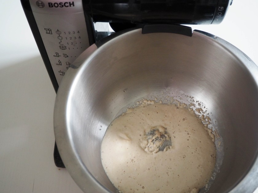 3. Add half of flour and using the dough hook of your mixer, start kneading (you can do this by hand too if you don’t have an electric mixer).