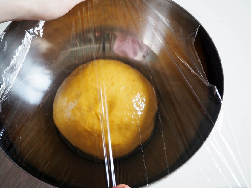7. Coat a clean bowl with a little vegetable oil. Put cover the dough with the oil and leave it in the bowl. Cover the bowl with a stretch film and leave the dough to rise and get double in size in a warm part of your kitchen. It will take about 1 hour.