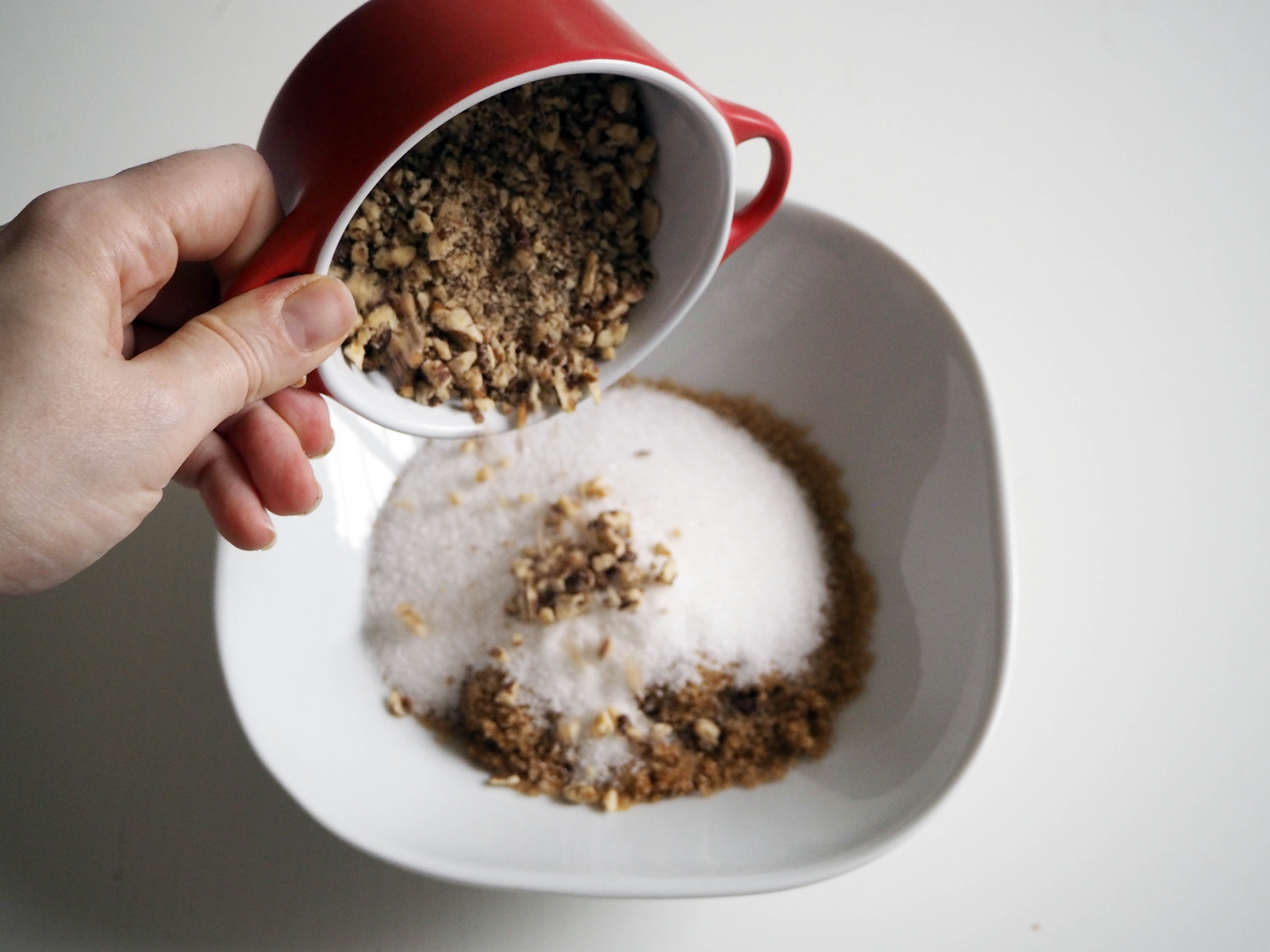 8. While the dough is rising, prepare the filling. In a medium bowl put brown sugar, white sugar, pecans and cinnamon and give it a good mix. Put aside.