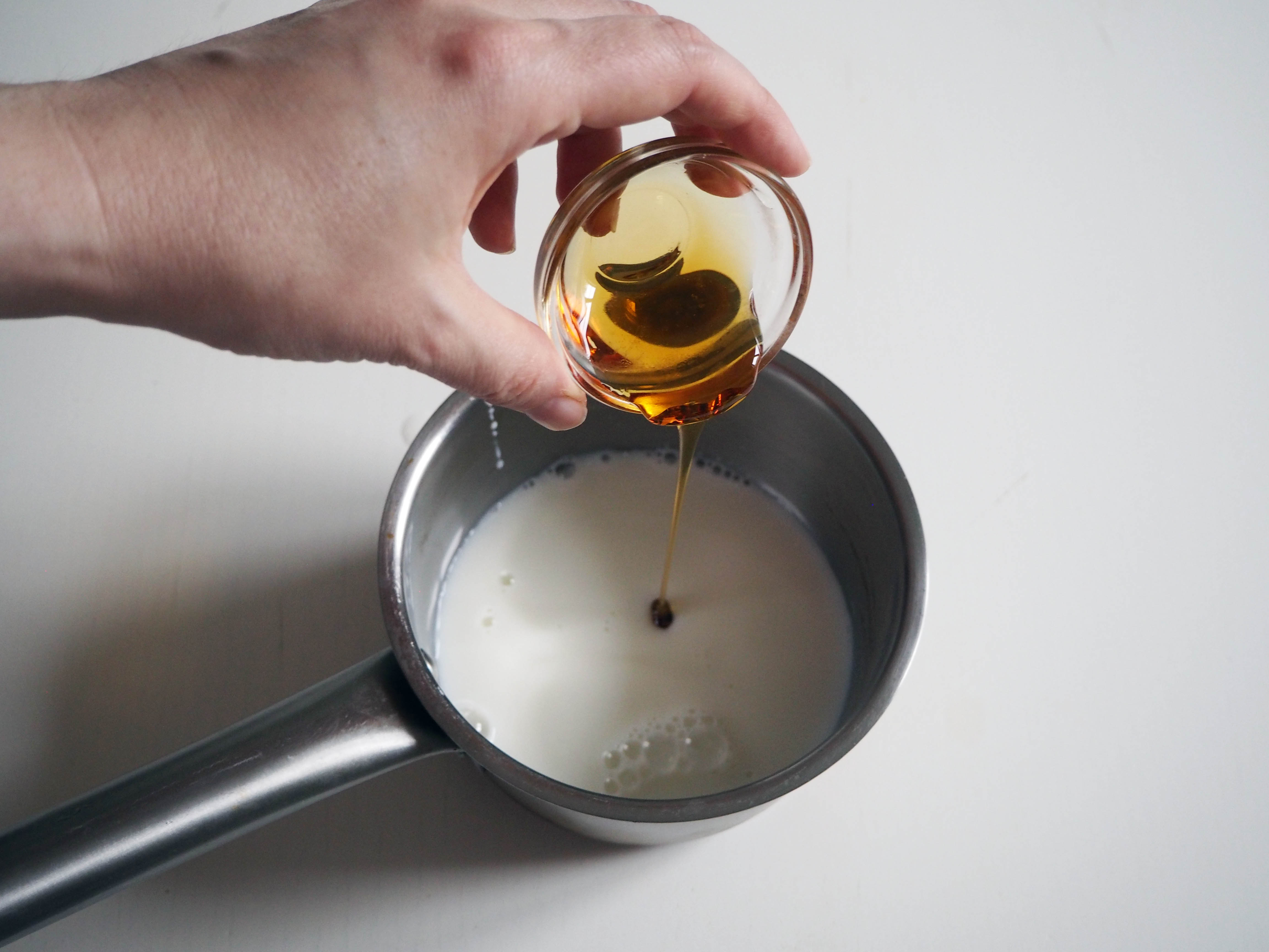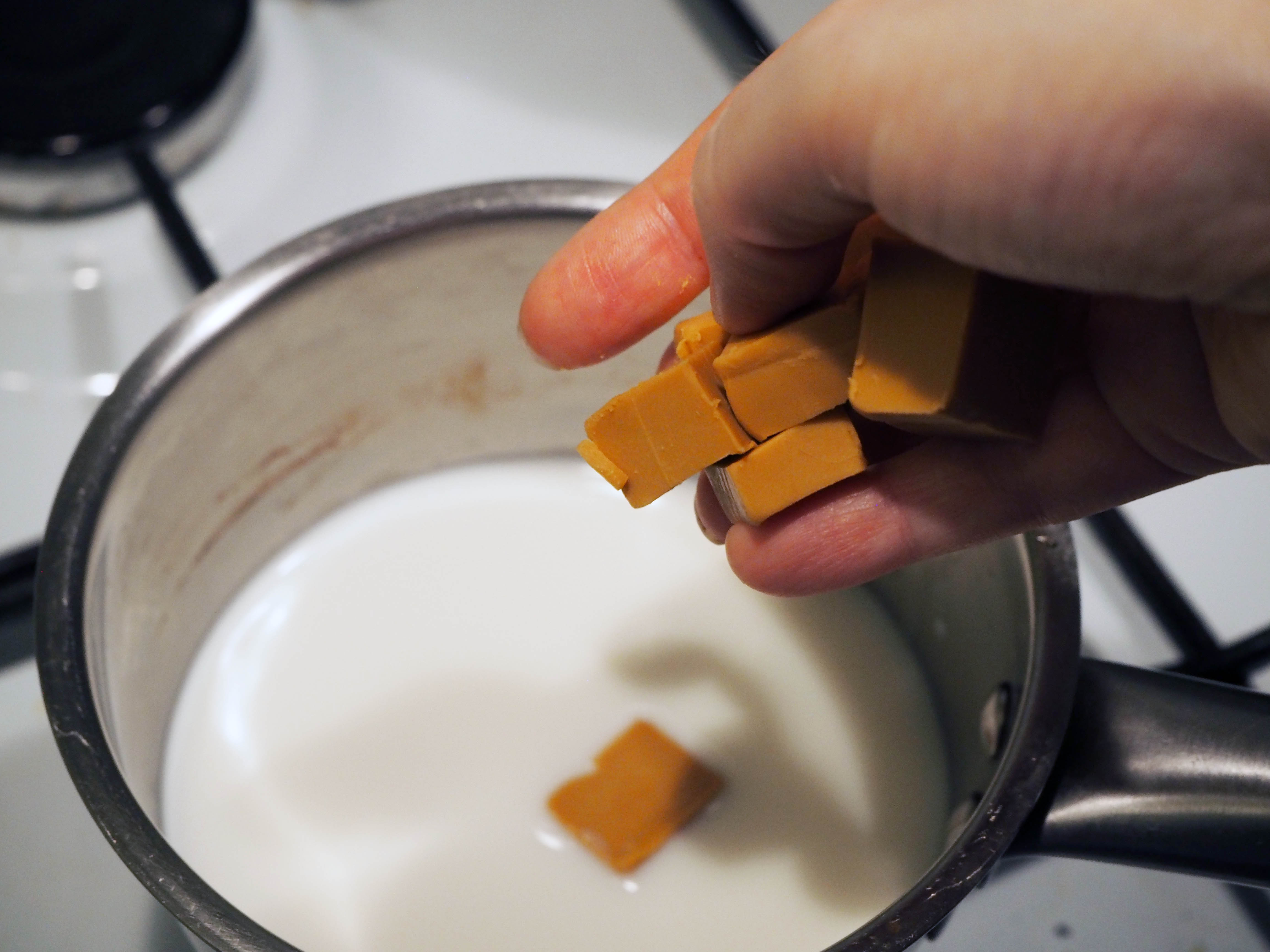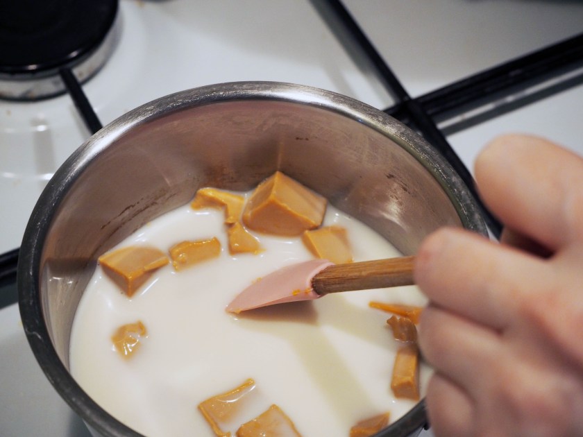 9. While the dough is rising, prepare also the caramelised cheese sauce. In a small saucepan, put milk and syrup and warm it a little on medium heat. Add cubed or grated cheese and using a whisk, melt the cheese in syrupy milk. Once all cheese is melted, take it away from heat and pour it in a mini jug so that it will be easy to spread on the buns when they are ready. Put the jug in a cool spot in your kitchen so that it cools down to room temperature.