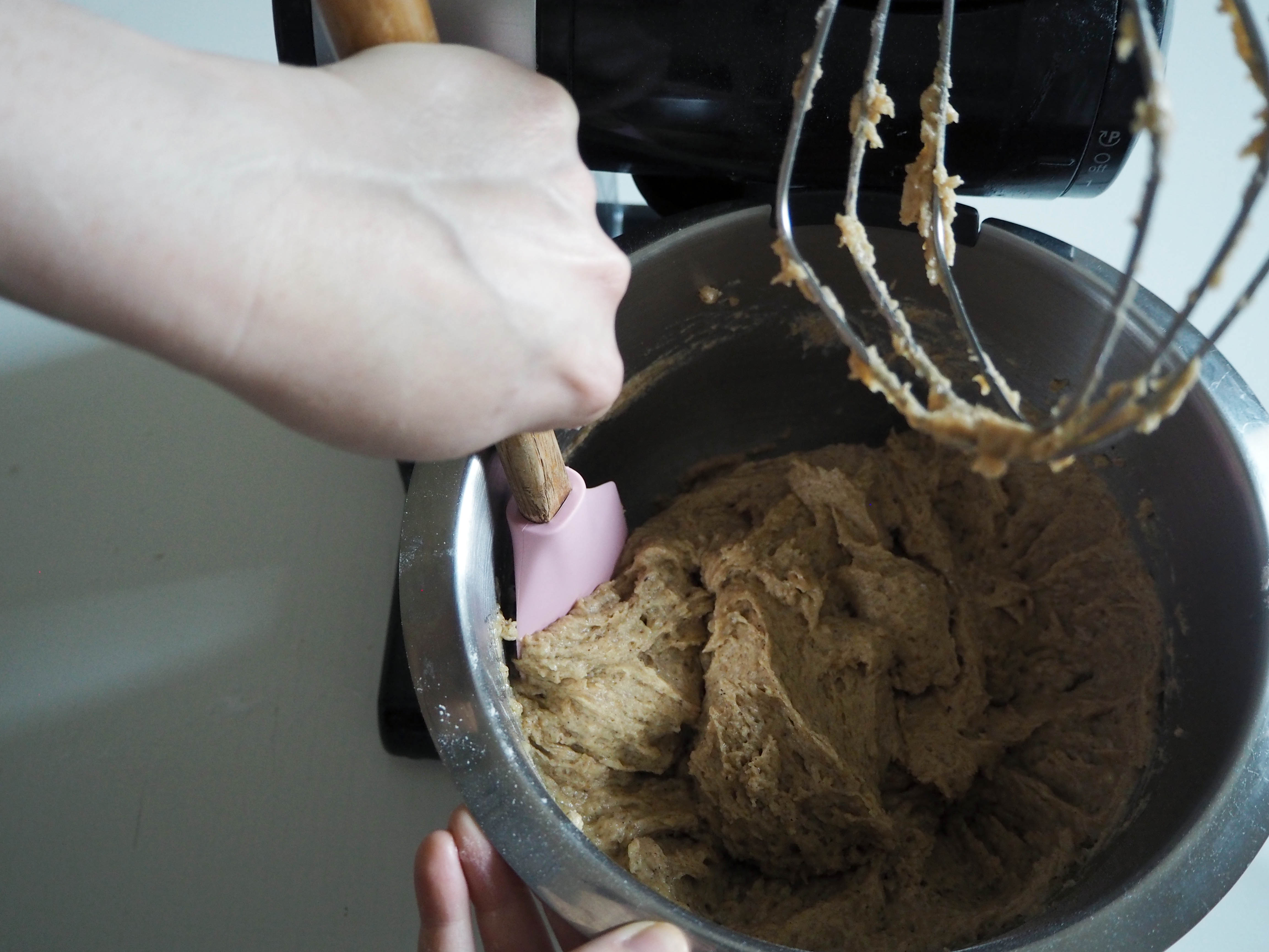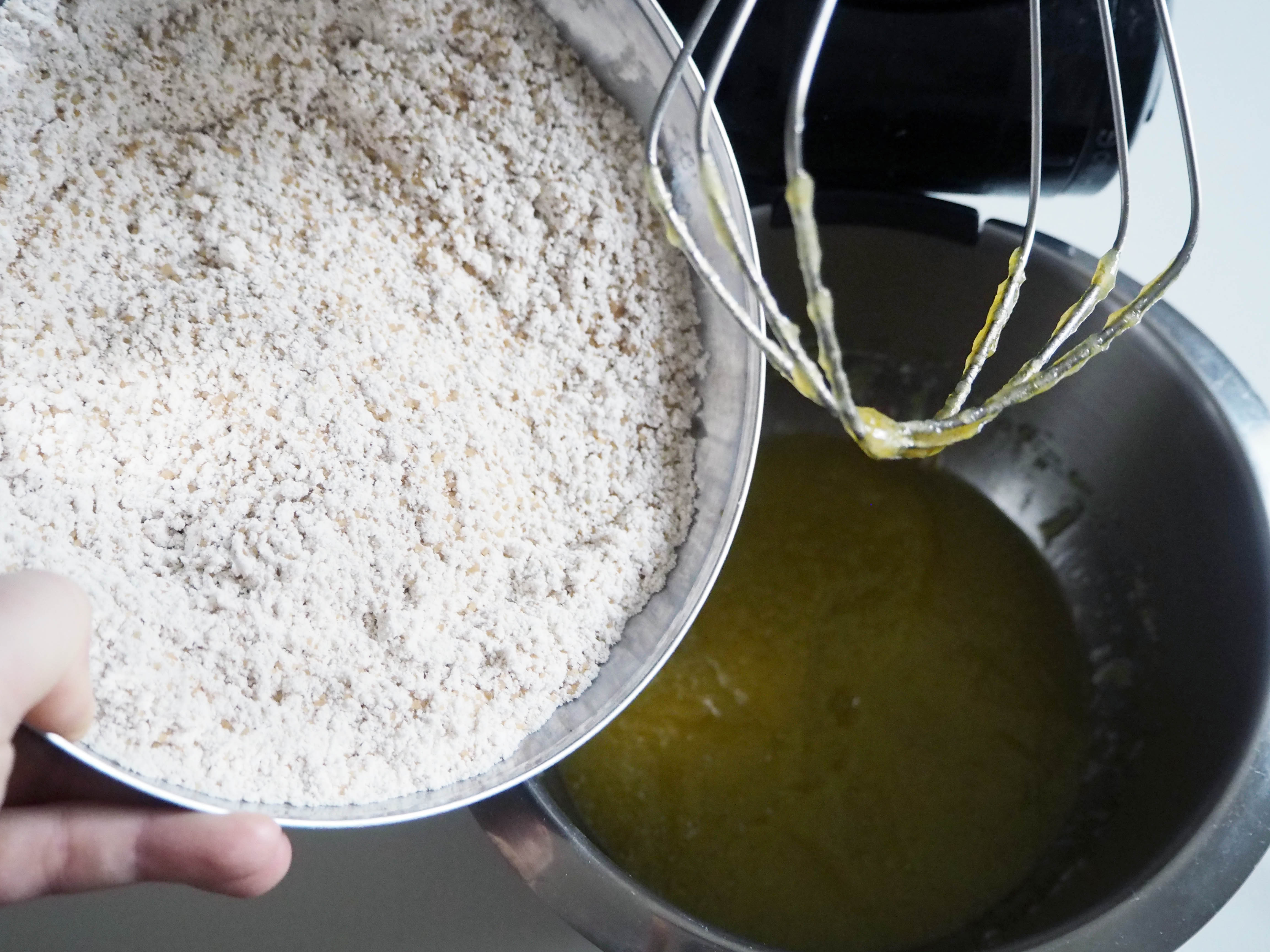 4. Add dry ingredients mixture and continue beating until the ingredients are incorporated. Scrape the sides of the bowl if needed.