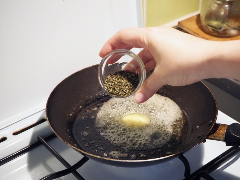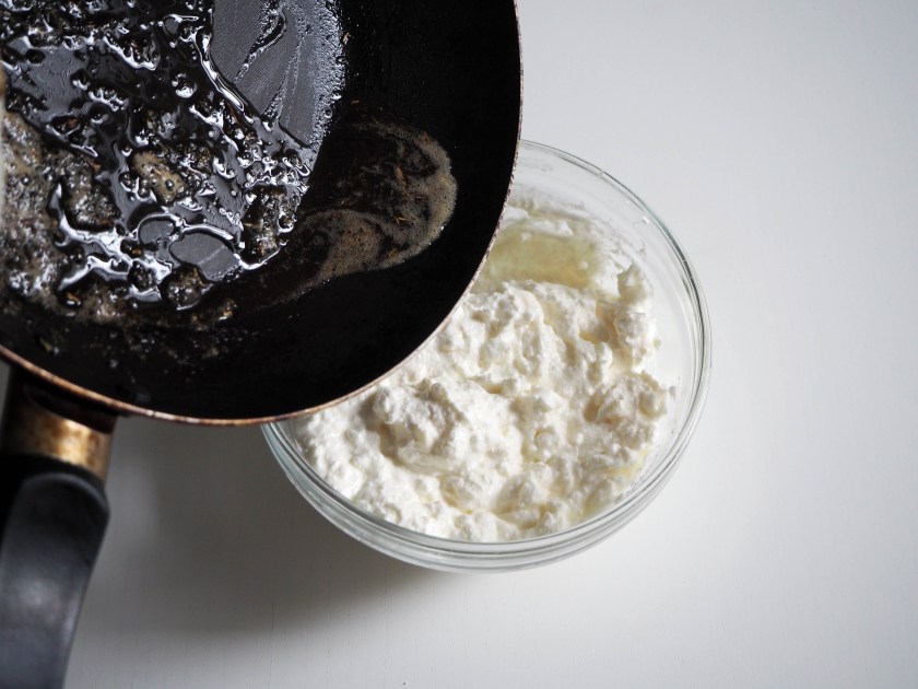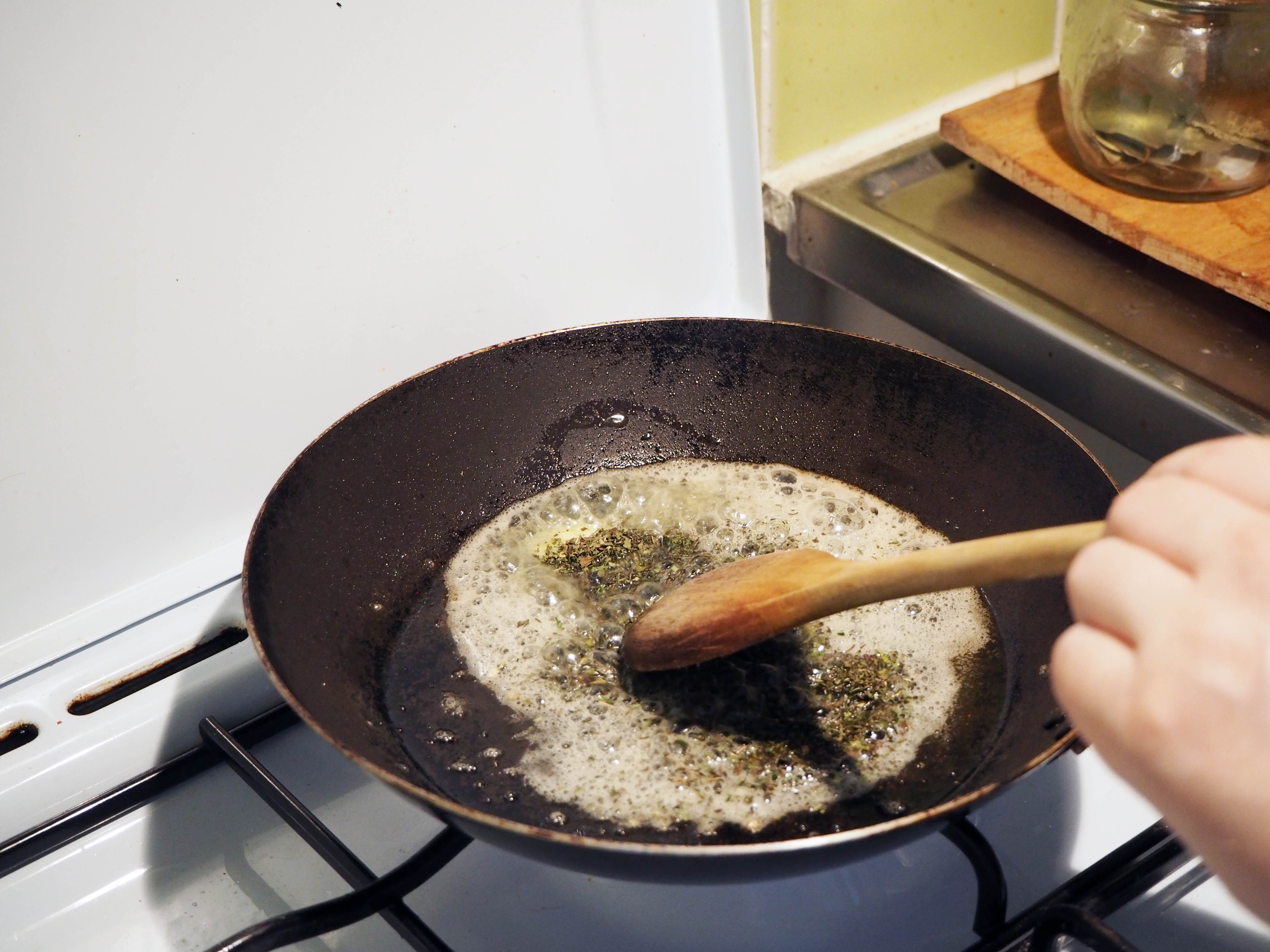 1. In a pan on medium heat, melt butter. When almost all butter is melted, add dried mint and stir with a wooden spoon / spatula, until you get roasted but not burned mint, for a couple of minutes. Take away from the heat and put aside to cool down.