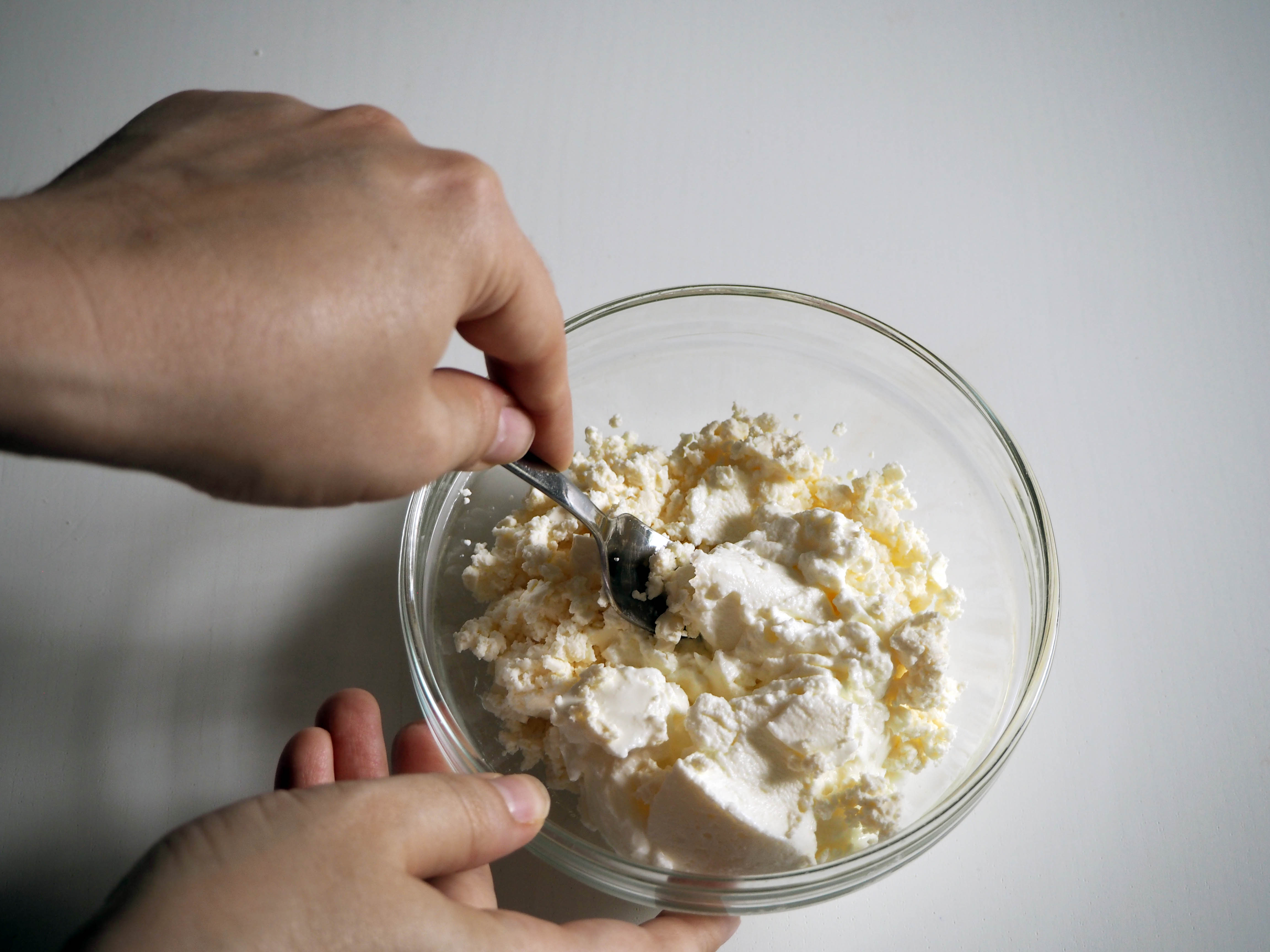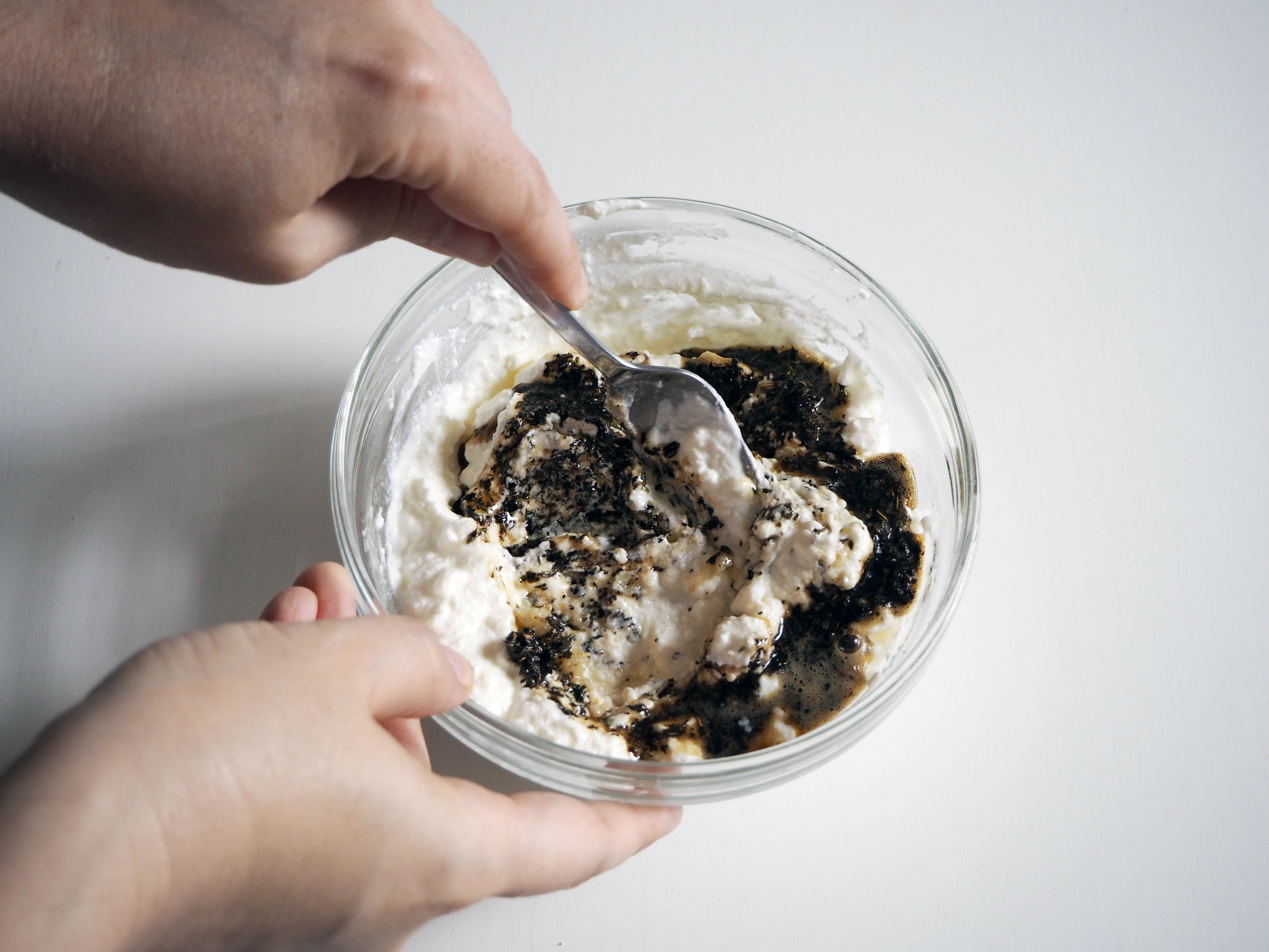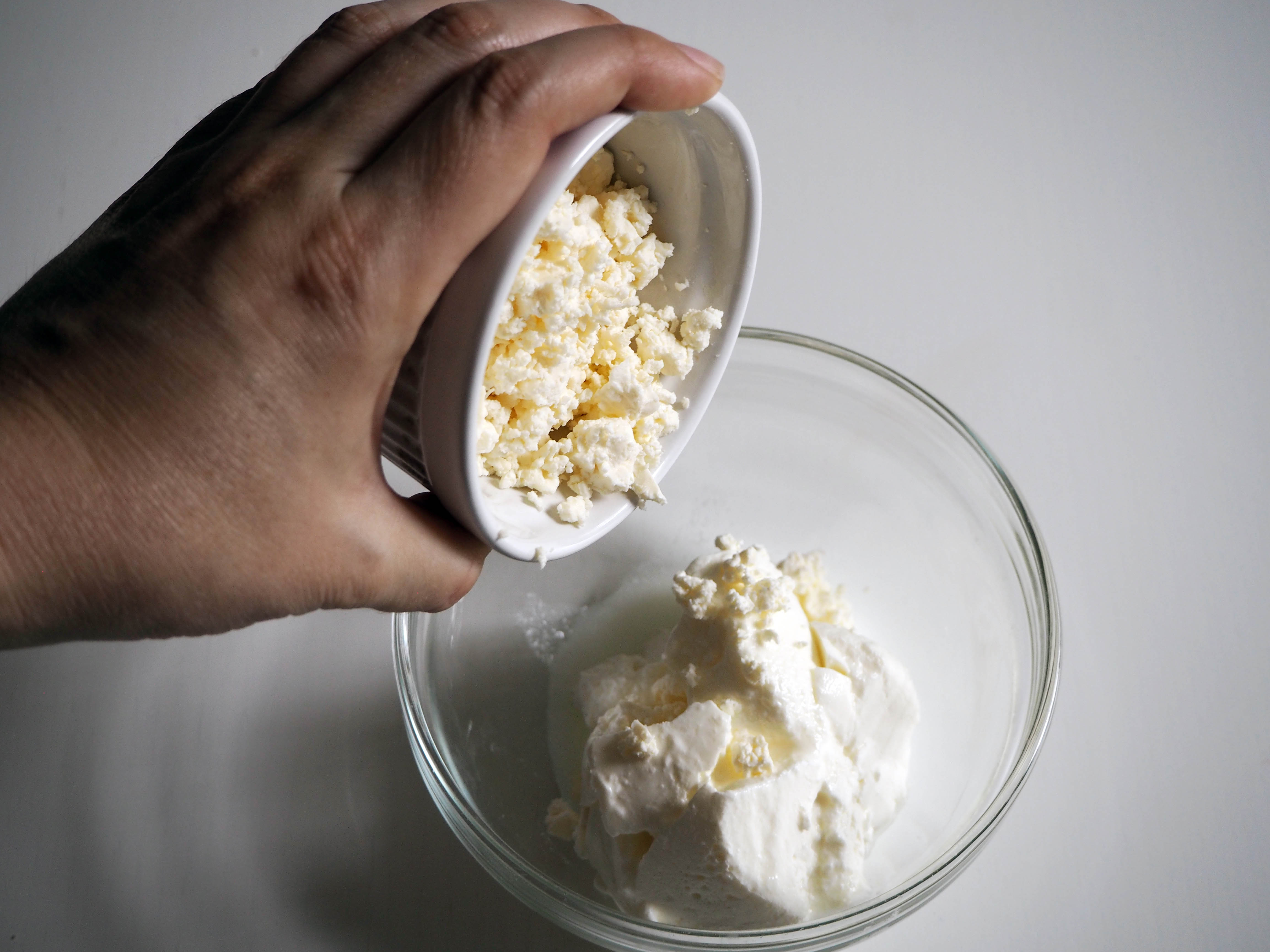 2. In a bowl, put yogurt and feta and mix with a fork or spoon.