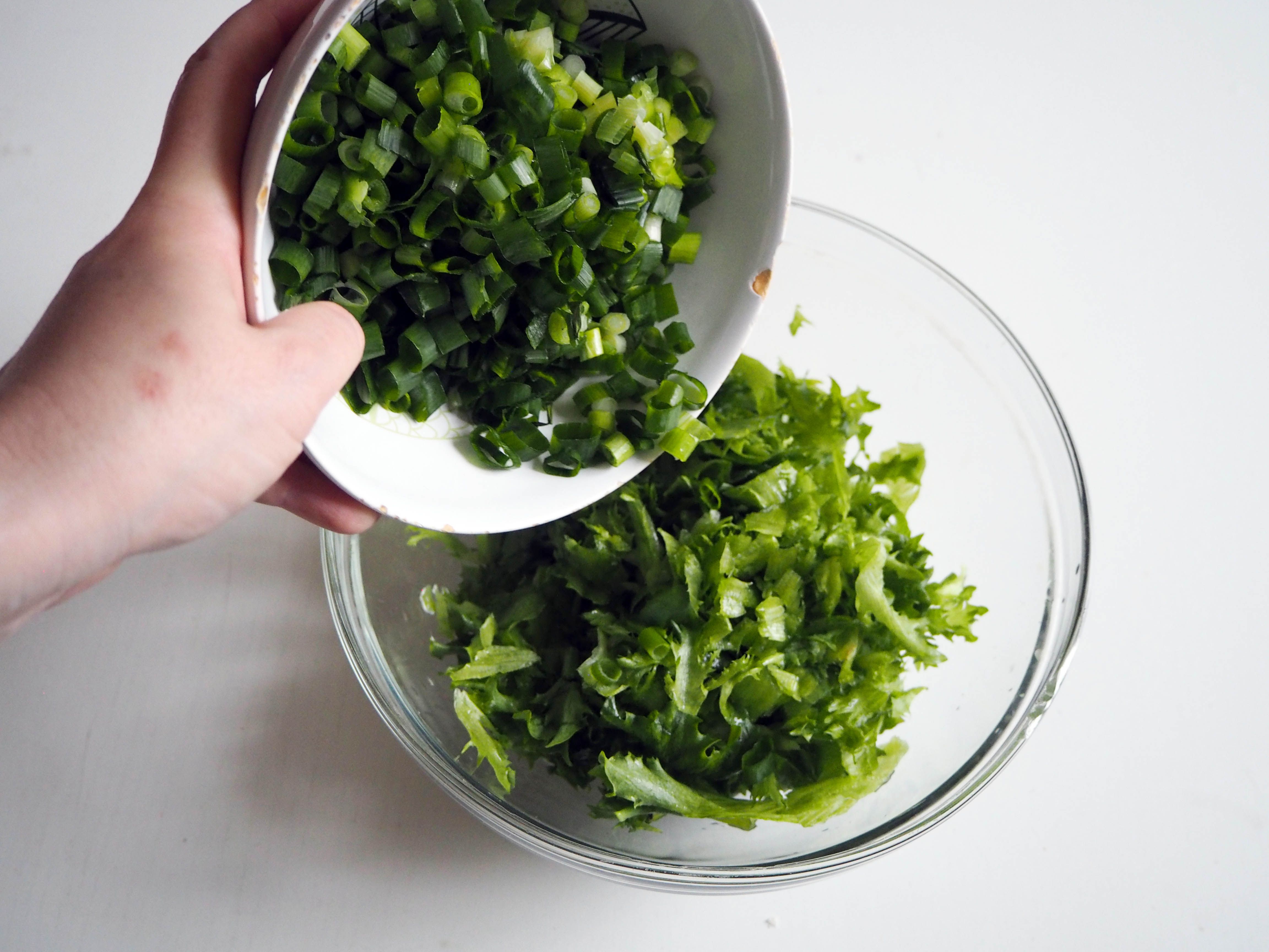 3. Cut the green salad and put in a salad or mixing bowl. As you will see in later photos, I had to switch to a bigger bowl later on to be able to mix all the ingredients easily so plan accordingly.