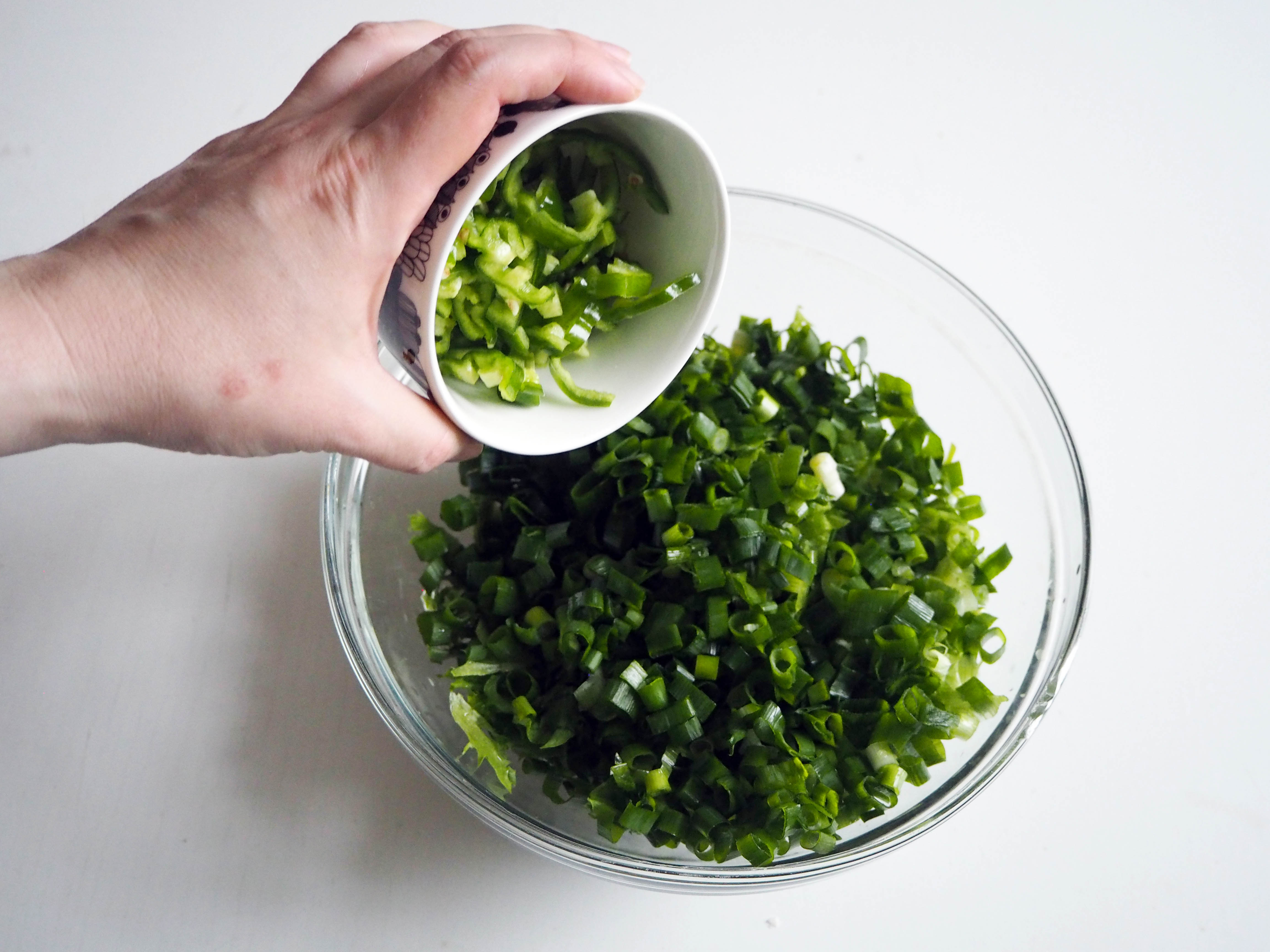 4. Add spring onions, green peppers, sautéed and cooled onions and cooled potatoes and mix.