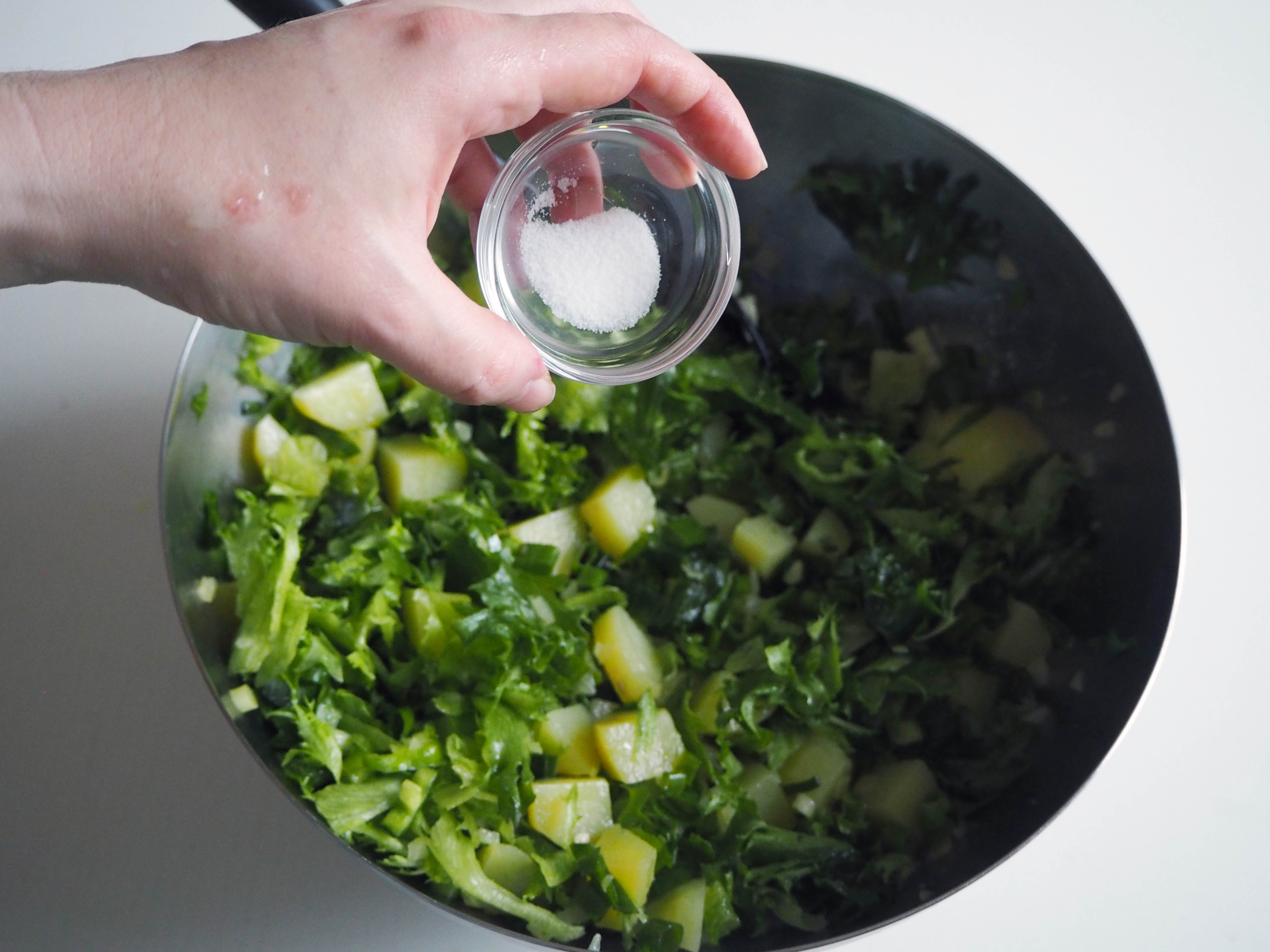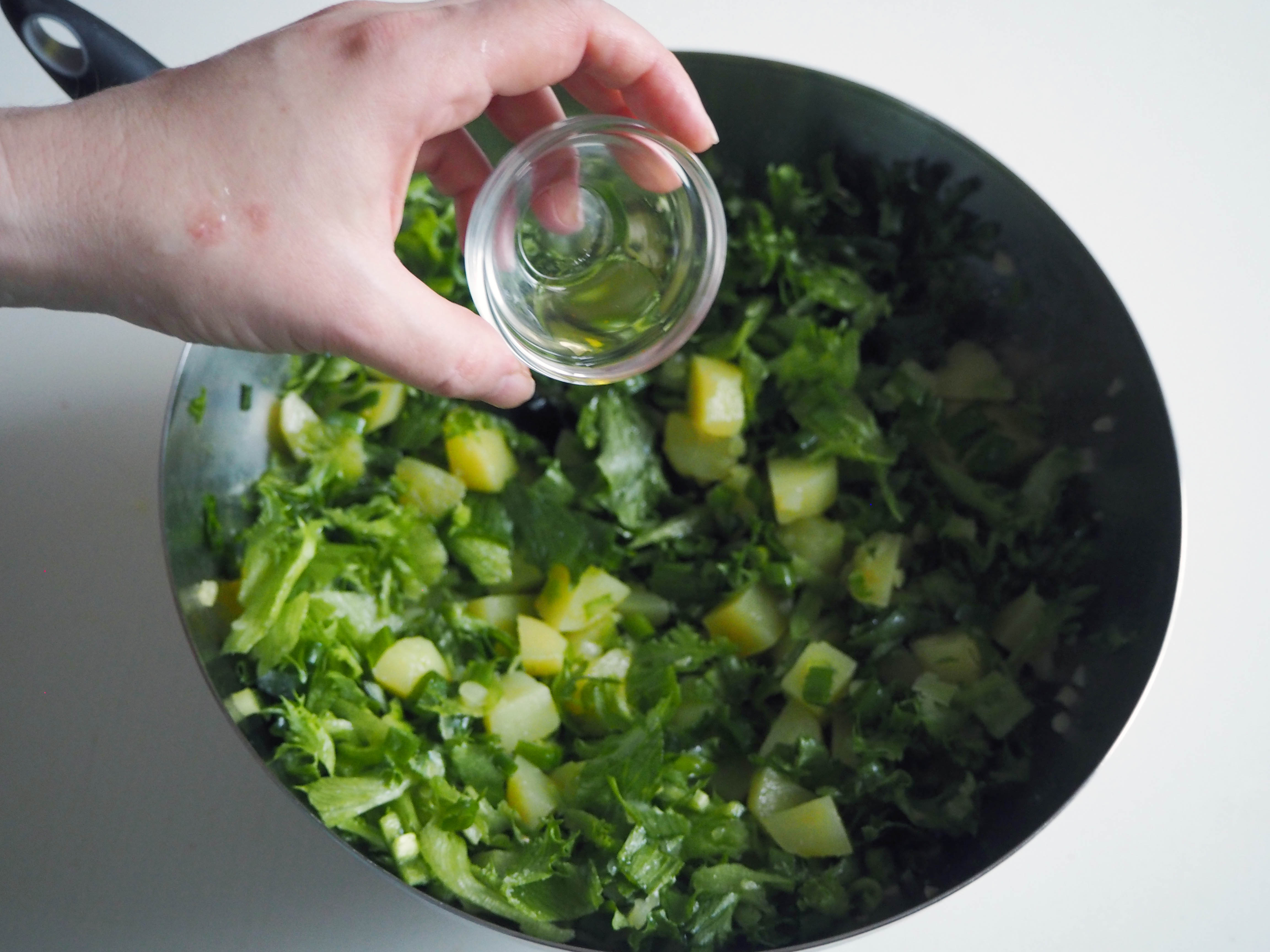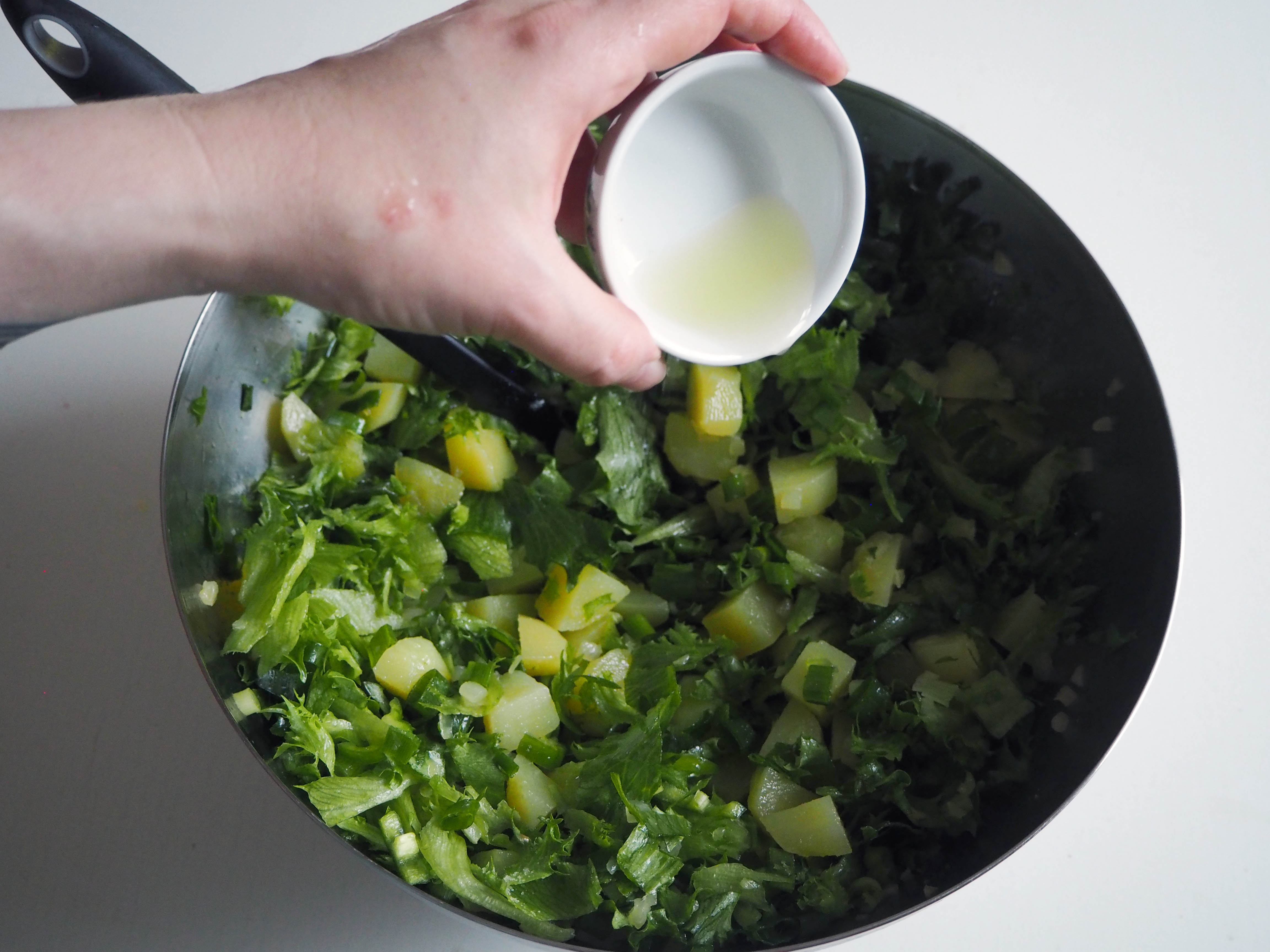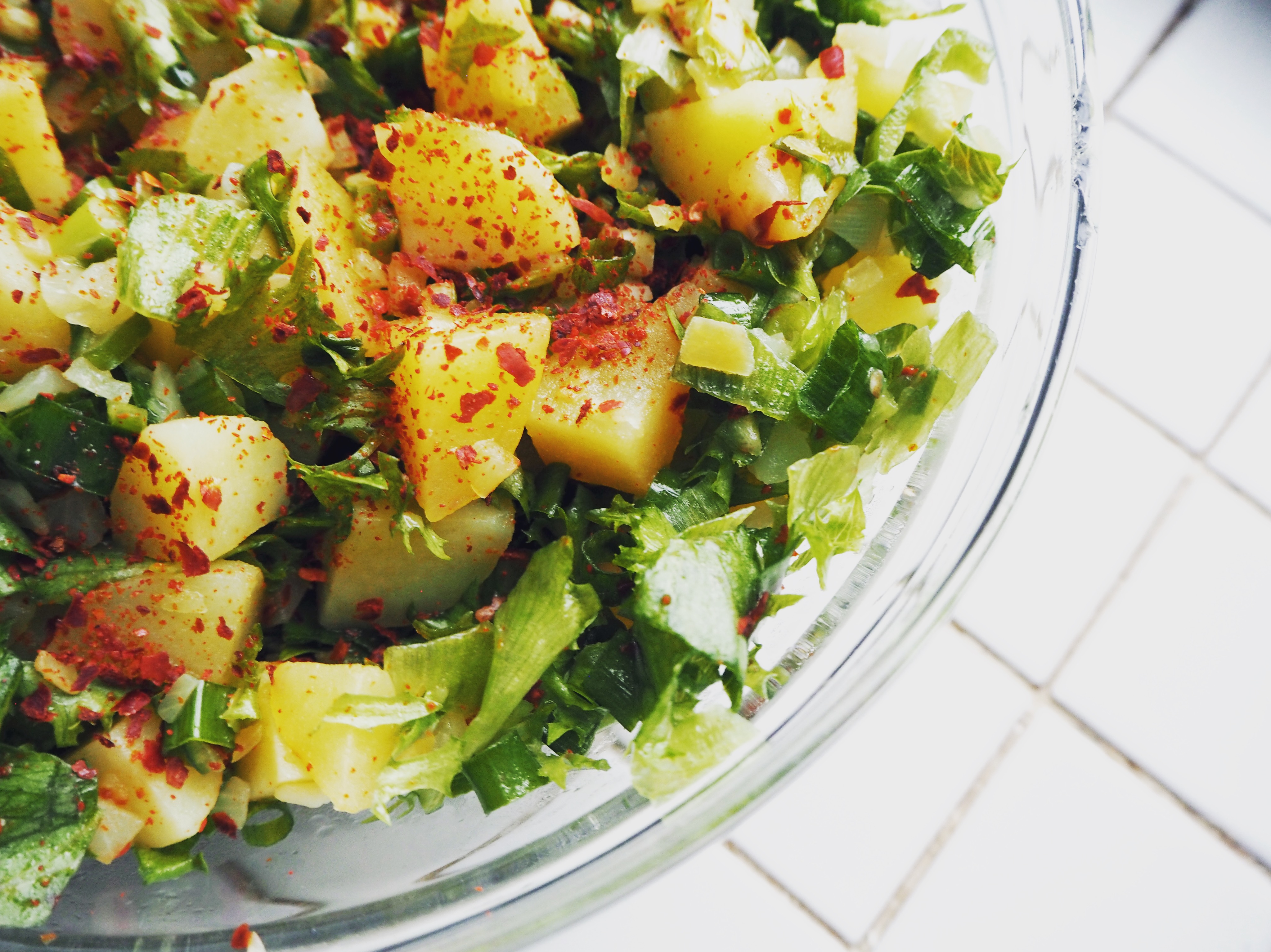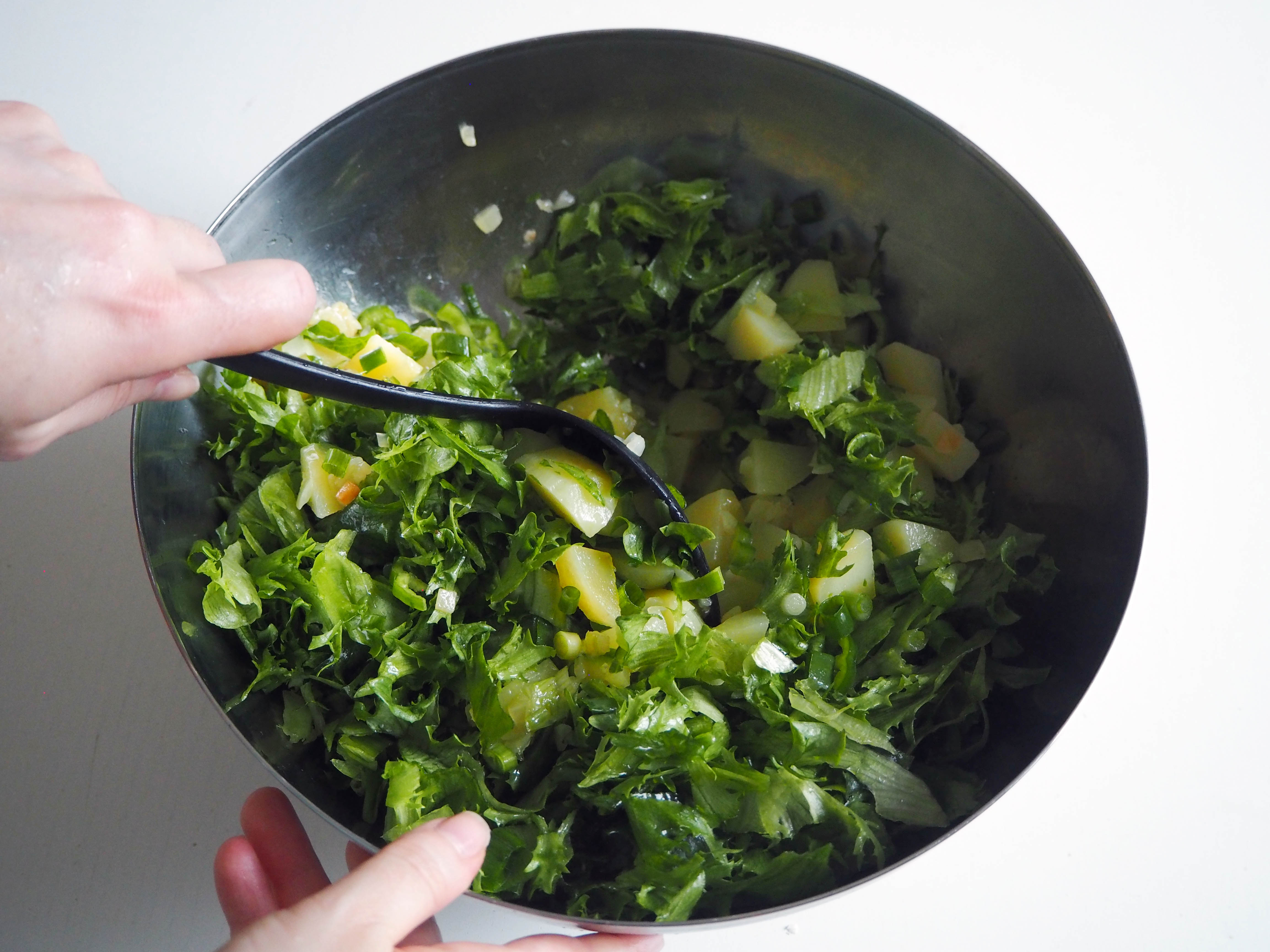 And yet, I tried this recipe with baked potatoes (my favourite) and I once tried someone else’s version with fried potatoes, and none of them really worked. The boiled potato is the juiciest and softest to work together with all those green, fresh ingredients, especially lettuce (or whatever green leaves you are using).