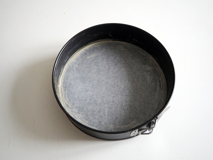 1. Preheat the oven to 180C. Grease a 24cm cake pan and line the base with baking paper.
